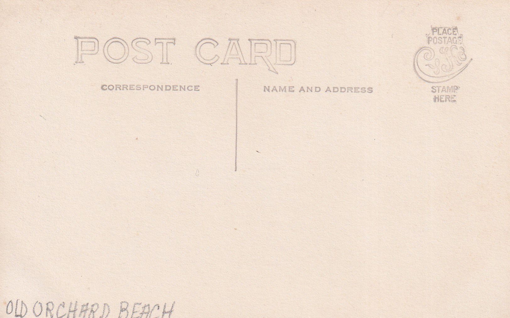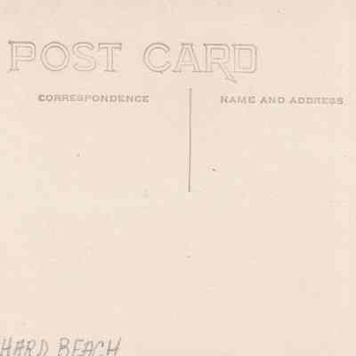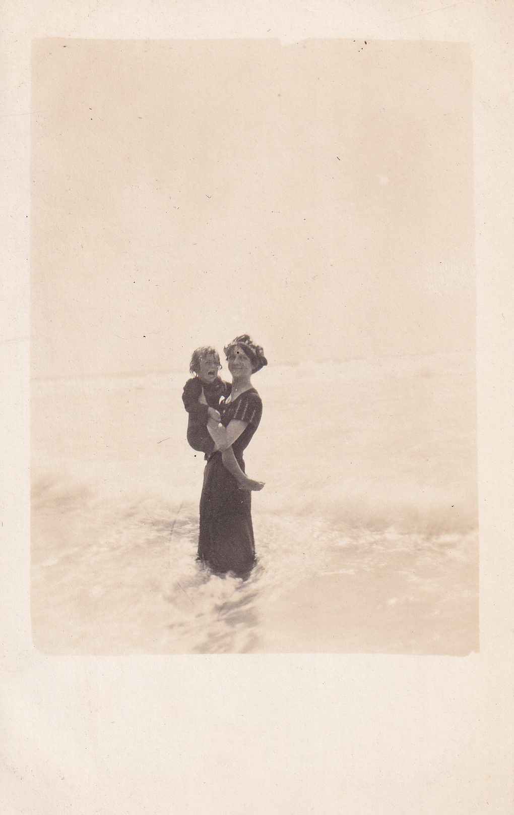 A postcard bearing a black and white photograph of a woman standing in shallow water holding a crying child.