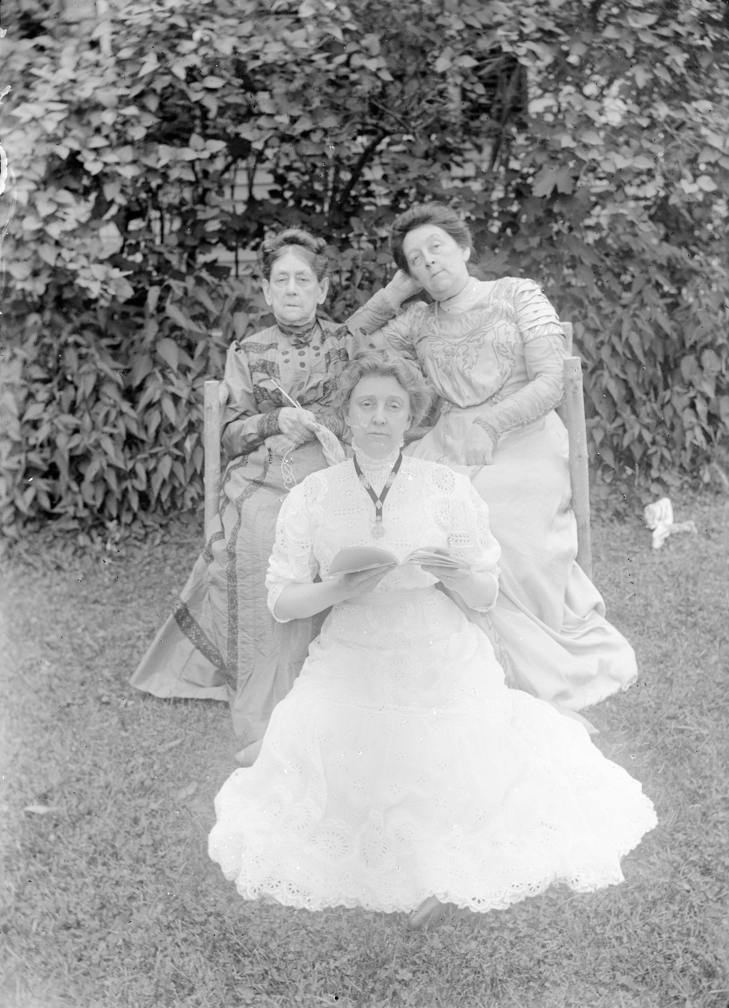 Glass plate negative photo of Kate Douglas Wiggin (front), her sister Norma Archibald Smith (right) and their mother Helen Bradbury (left).
