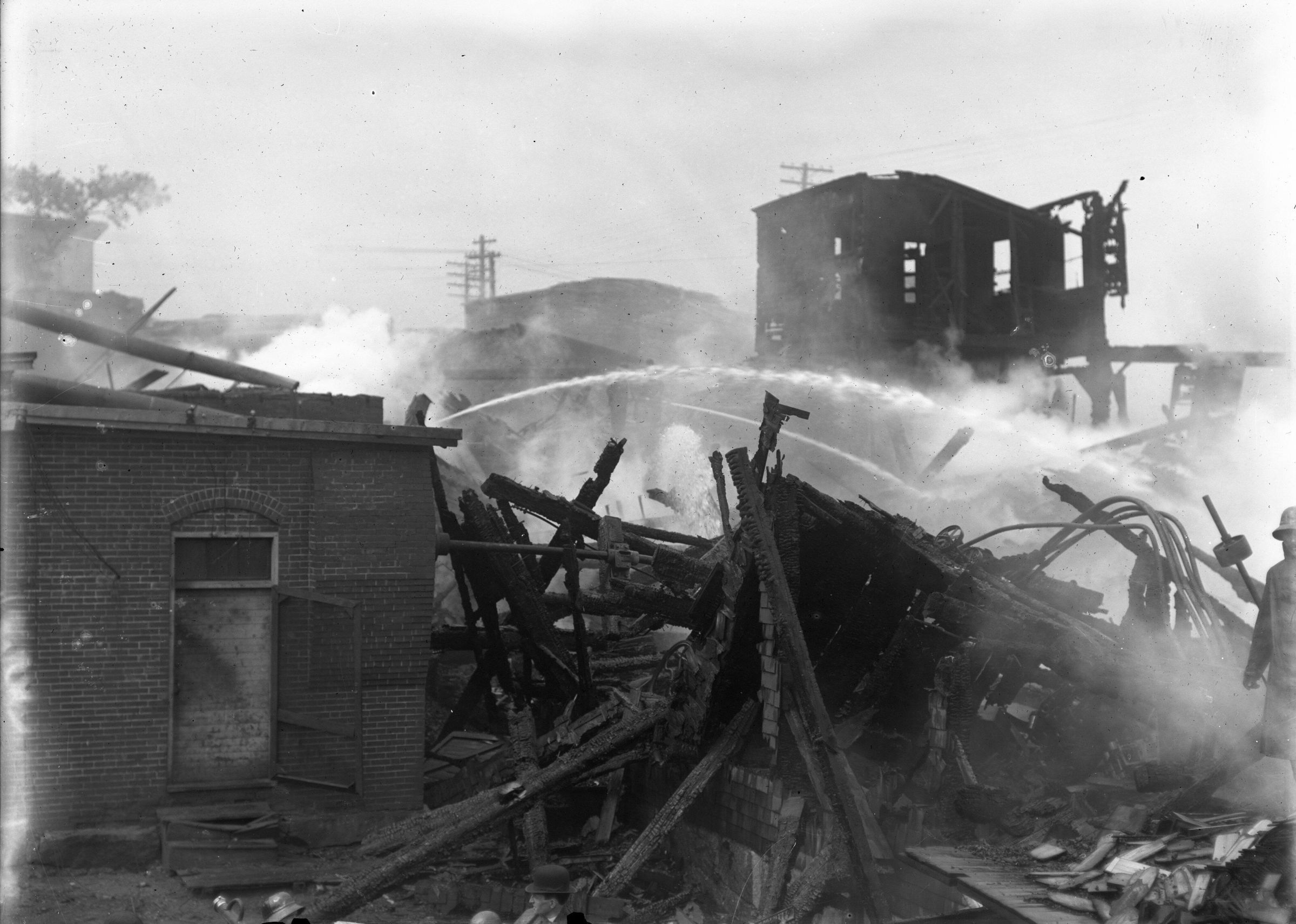Glass plate negative photo of firefighters hosing down the smoldering rubble of the Somesville fire. The Somesville fire in Saco occurred on September 15, 1908.