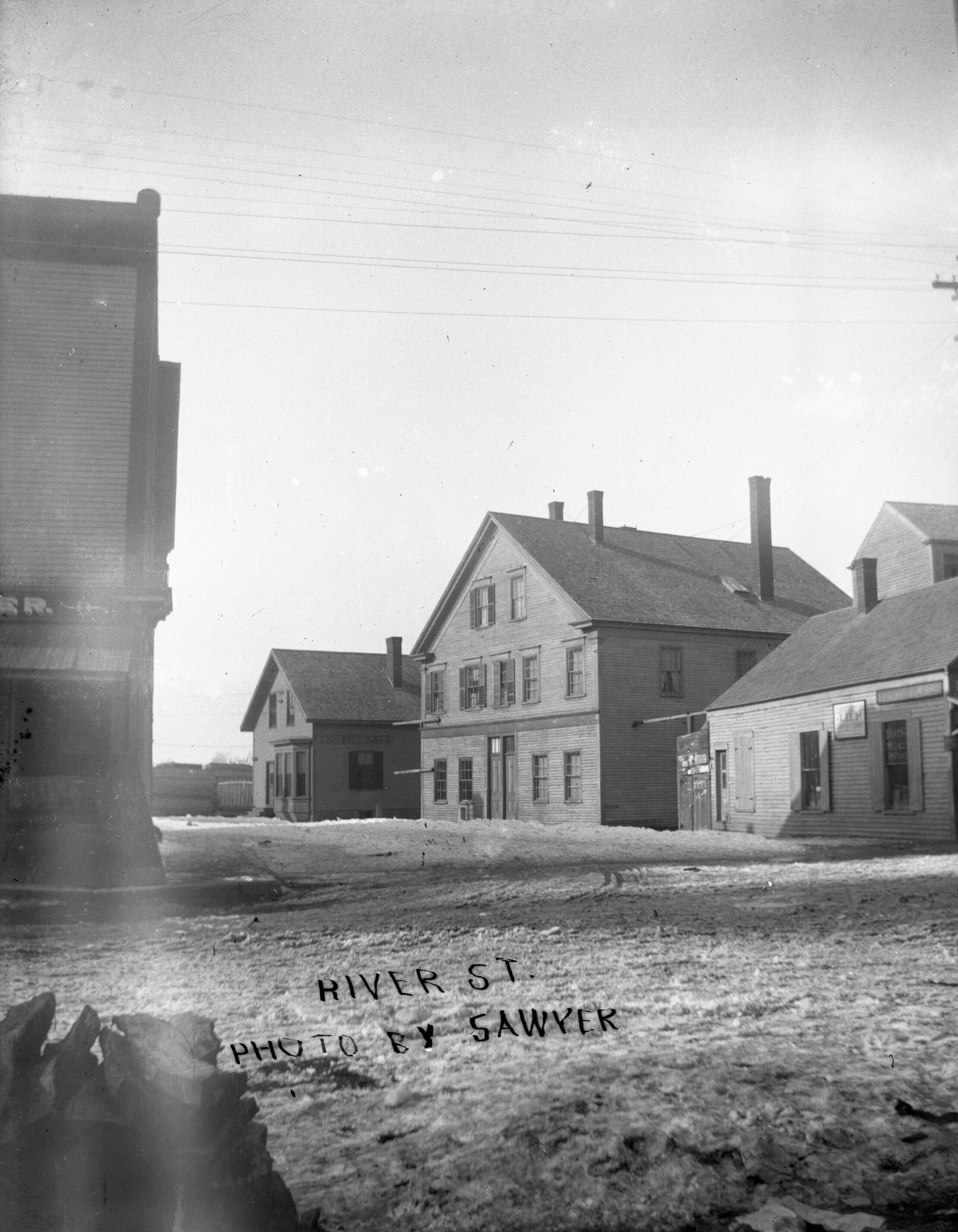 Glass plate negative photo of River Street (current day Diamond Street) in Biddeford, ME. Gilbert A. Sawyer, who owned a confectionery and variety store at 43 Elm Street, took this photo just outside his store. "River St. Photo by Sawyer" is etched onto the plate. One of the buildings of the Saco River Lumber Company can be seen at the end. This area was later purchased by the Diamond Match Company and River Street was renamed Diamond Street, not long after this photos was taken.