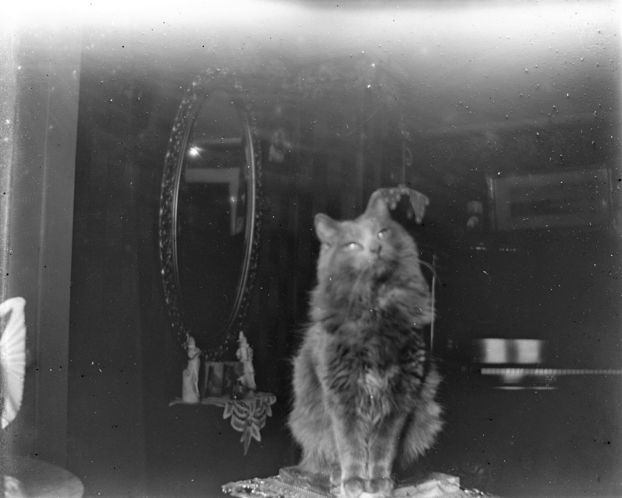 Glass plate negative photo of a cat taken at 79 Watson Mill Road in Saco, ME.