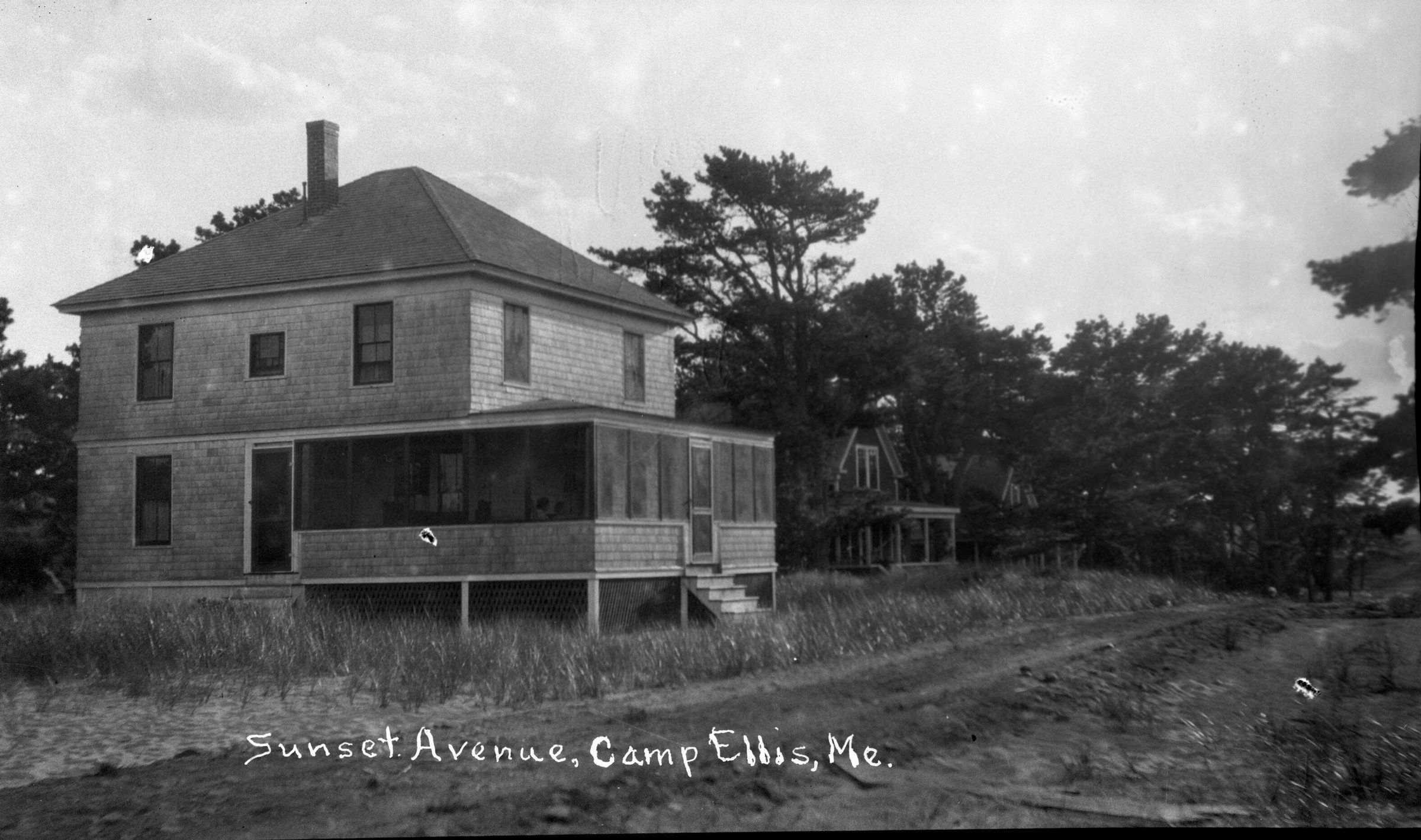 Negative print photo of a cabin on Sunset Ave. at Camp Ellis, ME.