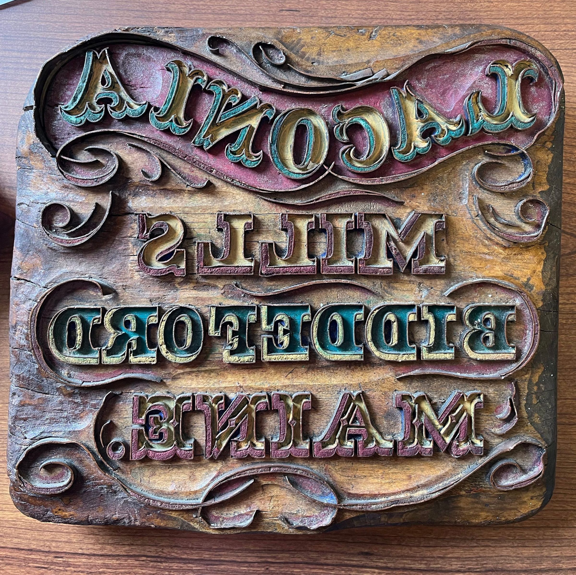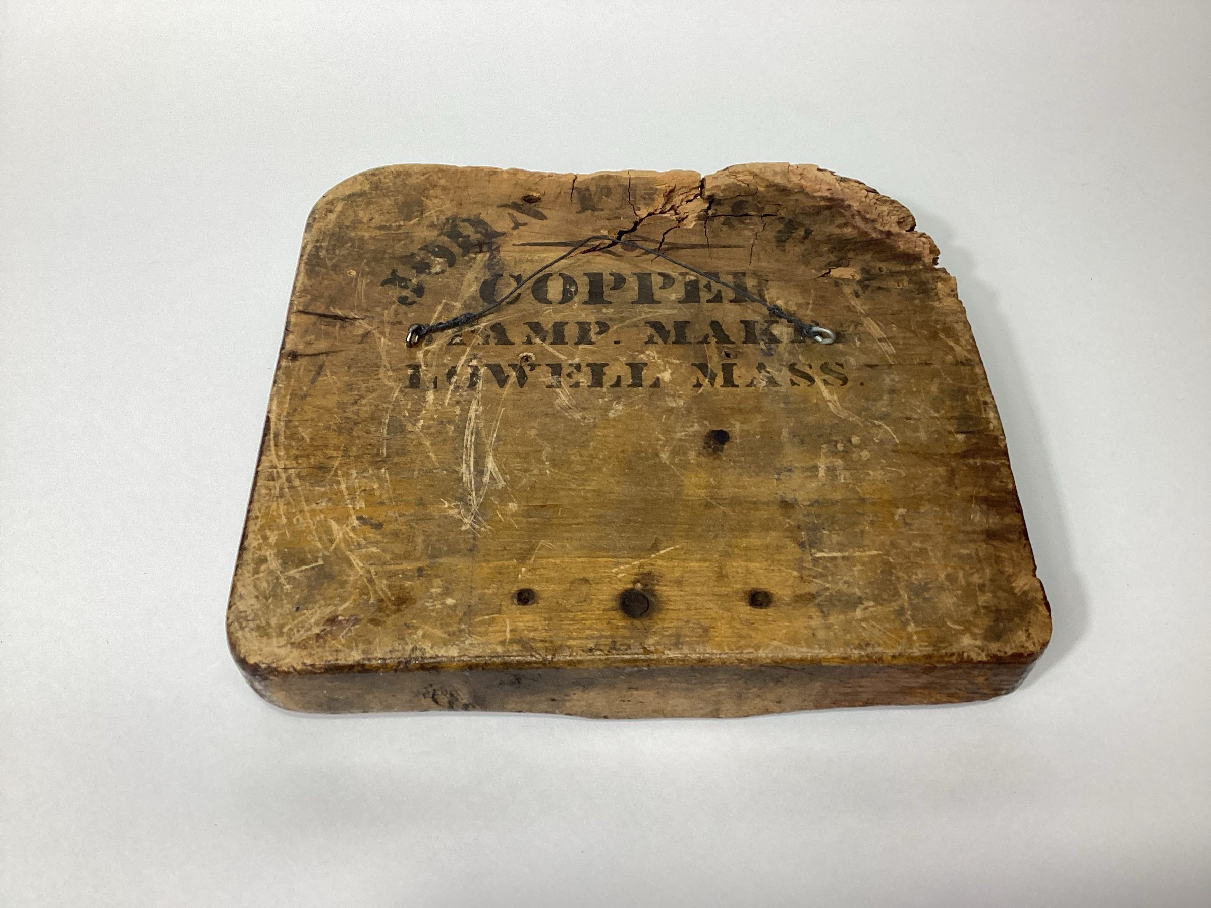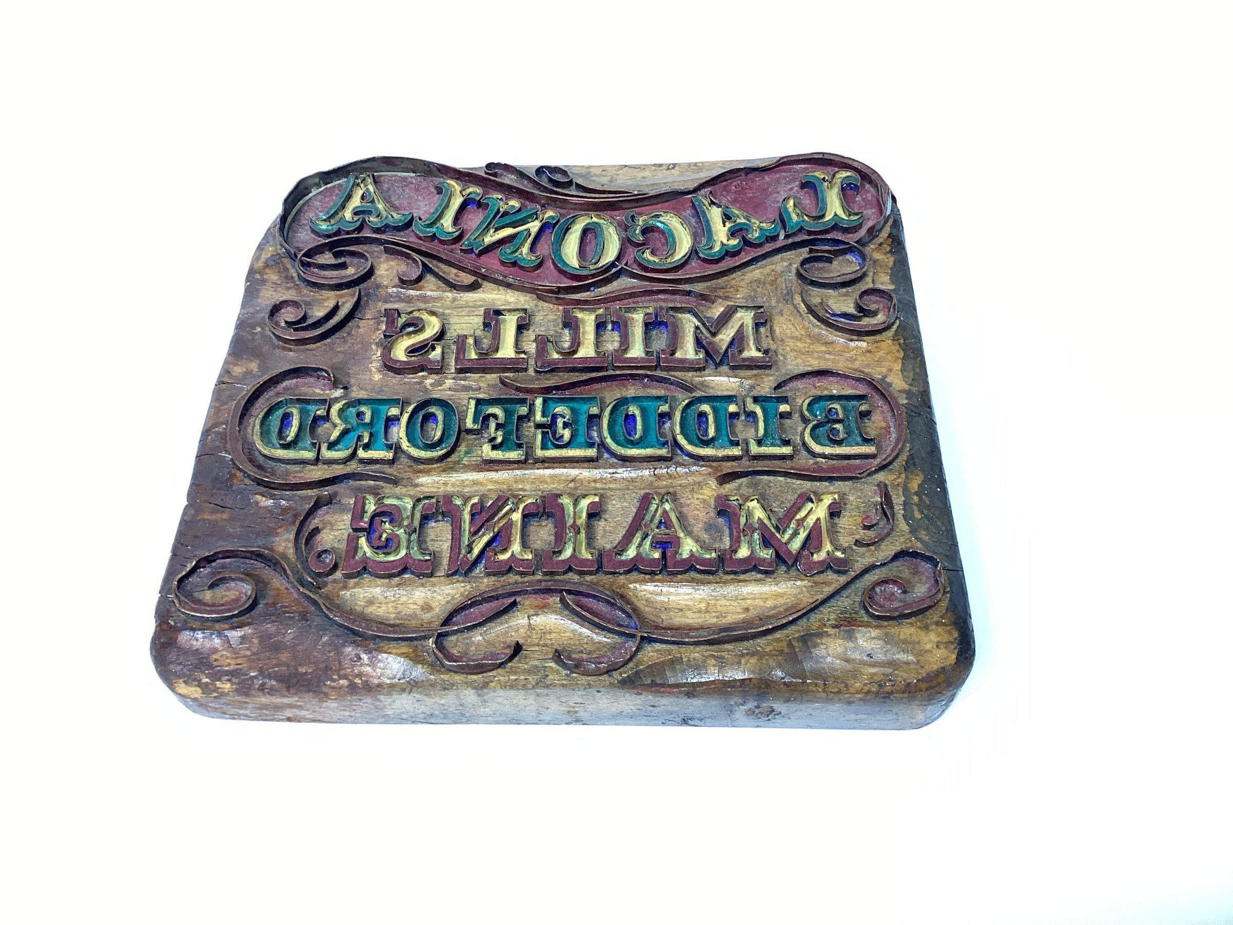 A thick wooden block with embedded overlapping and intersecting copper strips forming the pattern of one of the trademarks of the Laconia Mills in Biddeford, Maine. The strips form the words "LACONIA / MILLS / BIDDEFORD / MAINE" in reverse for printing. Four lines of text in three different upper case typefaces are surrounded by flowing scroll work. Thicker areas of the individual letters are filled with a material to provide definition as are a few of the scrolls. Red, green, and yellow paints are a later addition and not part of the original stamp. The top surface of the block is chiseled away in certain areas. On the back is the stenciled label of John Preston, the manufacturer. Three pairs of holes with dark oxidation on the back also indicate where a pair of metal brackets would have been originally attached.Dimensions