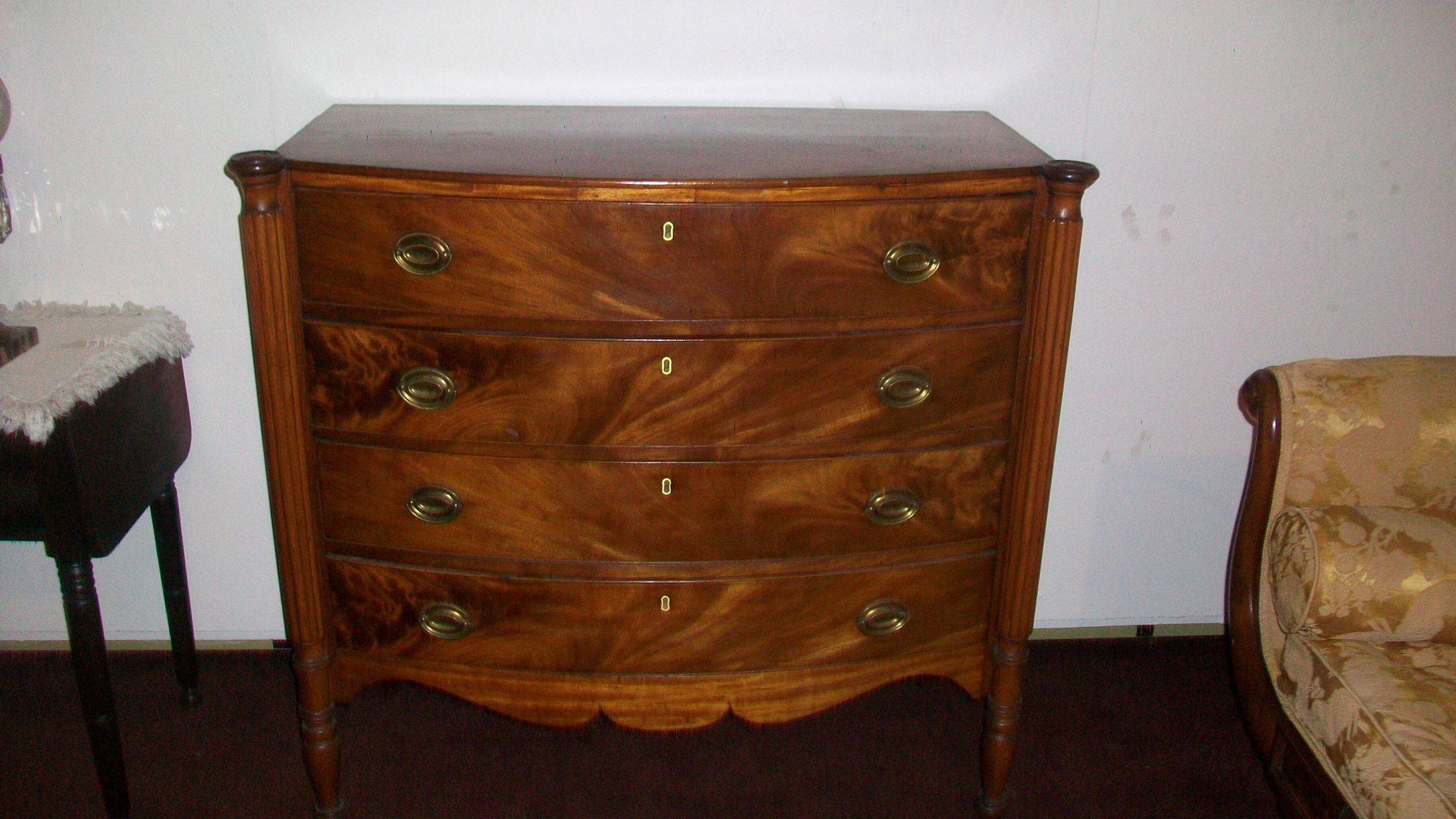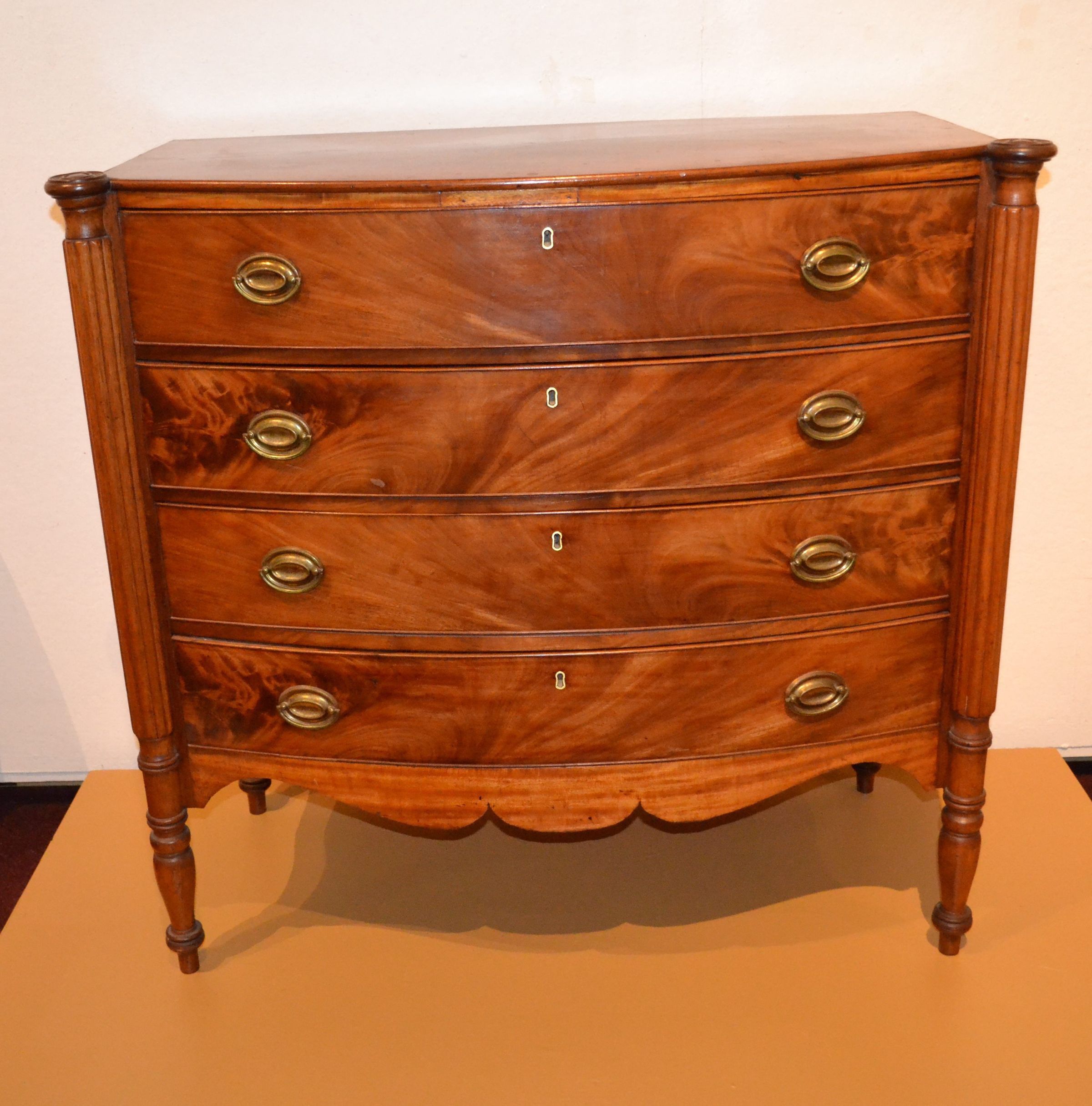 This chest of drawers shares many similarities with its counterpart to the right. Retaining the curved or bowed front and the scalloped skirt, it has been updated by the use of engaged reeded columns at the front corners which terminate in turned legs and feet, a feature that found favor in the 1820s and 1830s throughout New England, and especially along the coast. The columns on this chest protrude more than those from other cabinetmakers’ shops, perhaps a diagnostic feature. In any event, they were an effective means by which a cabinetmaker could update the standard form that he had been making for a number of years. Other furniture forms - bedsteads, tables, clock cases, and stands - featured bold turned decoration in a variety of forms resembling roping, reeding or fluting, vases, balusters, rings and reels on posts, legs, and feet.