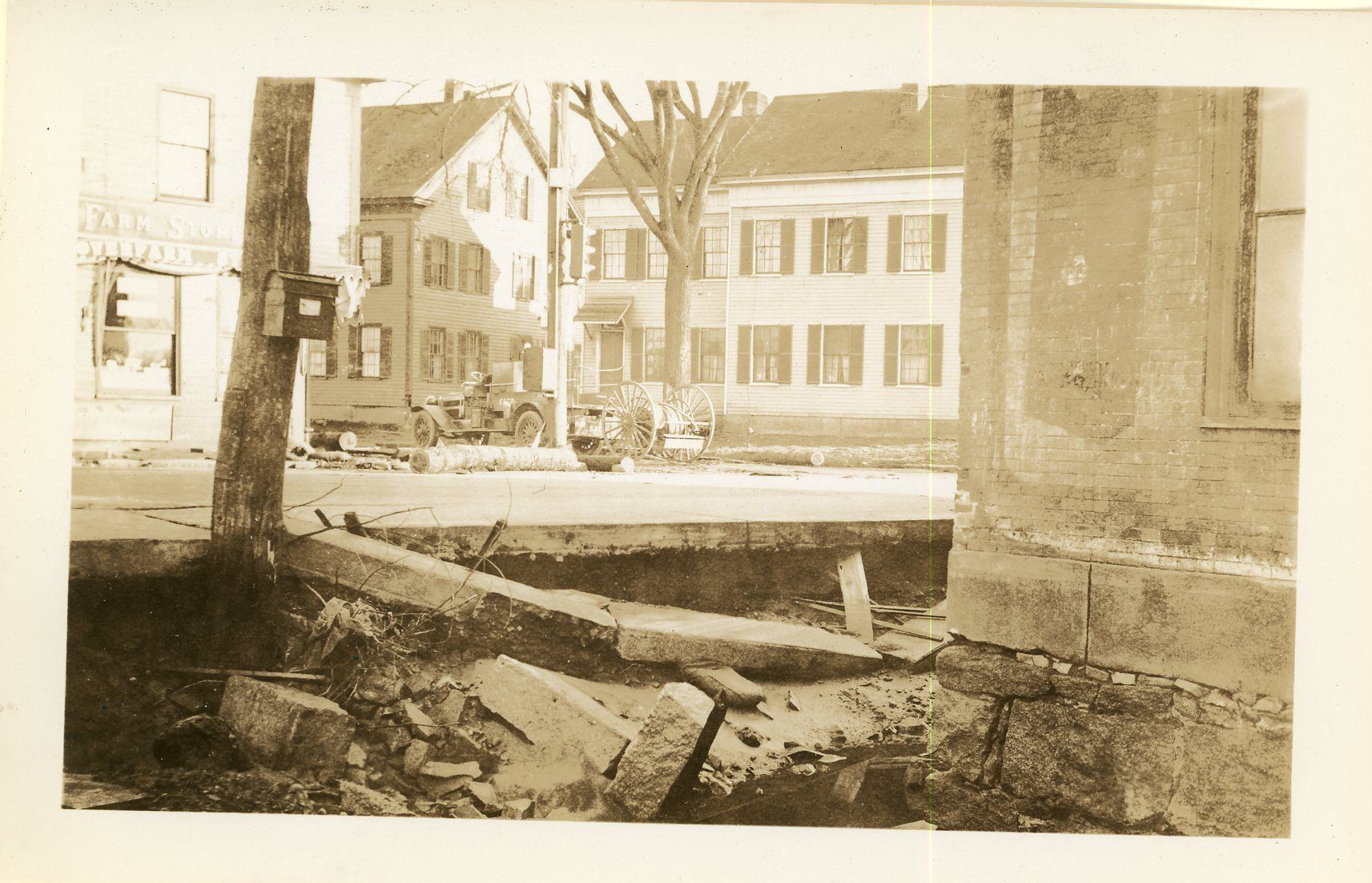 Black and white print photograph of Saco River flooding in Saco, Maine depicting street damage across Fred's Clover Farm Store, along Elm Street. From the Sawyer House Collection.Dimensions