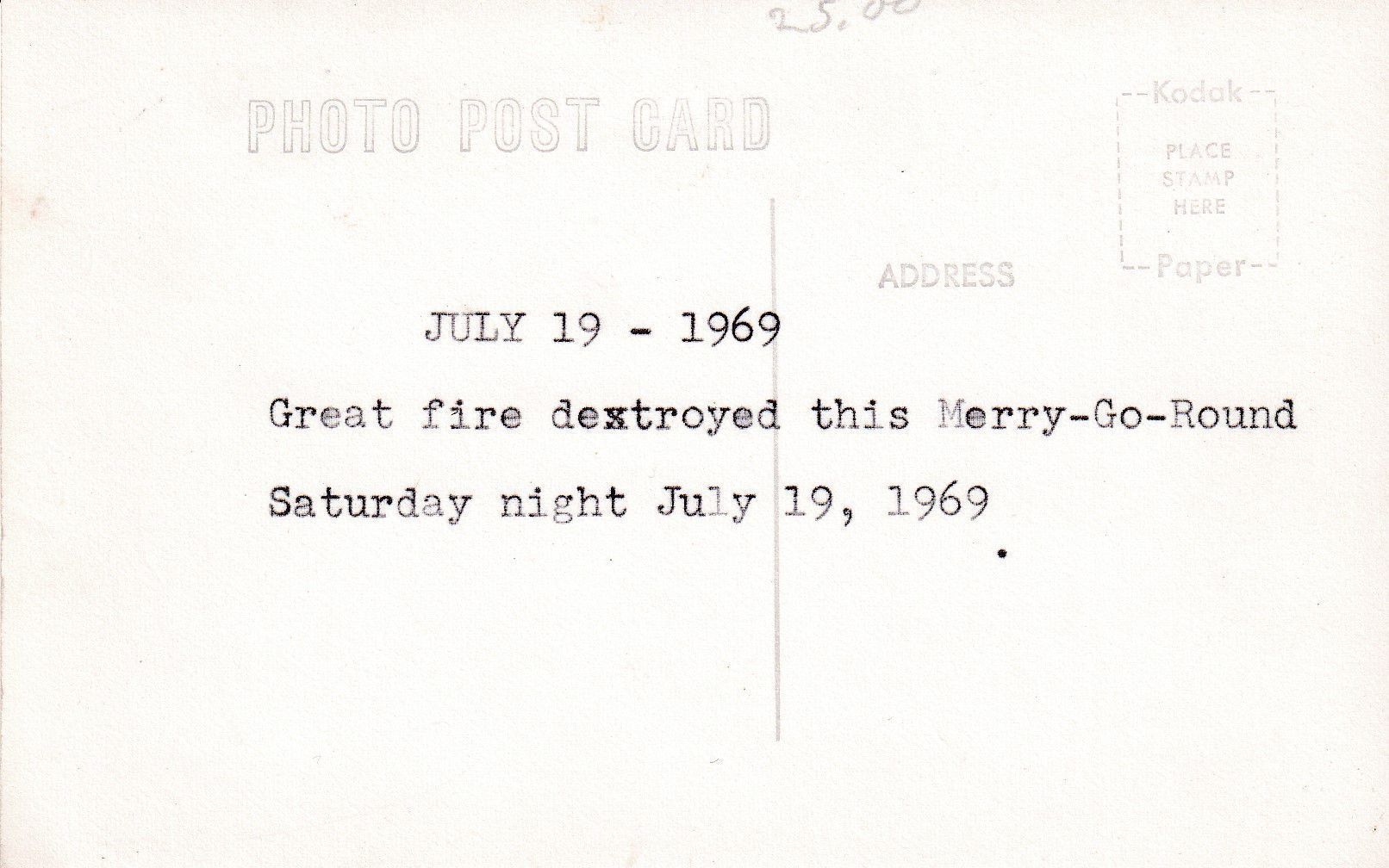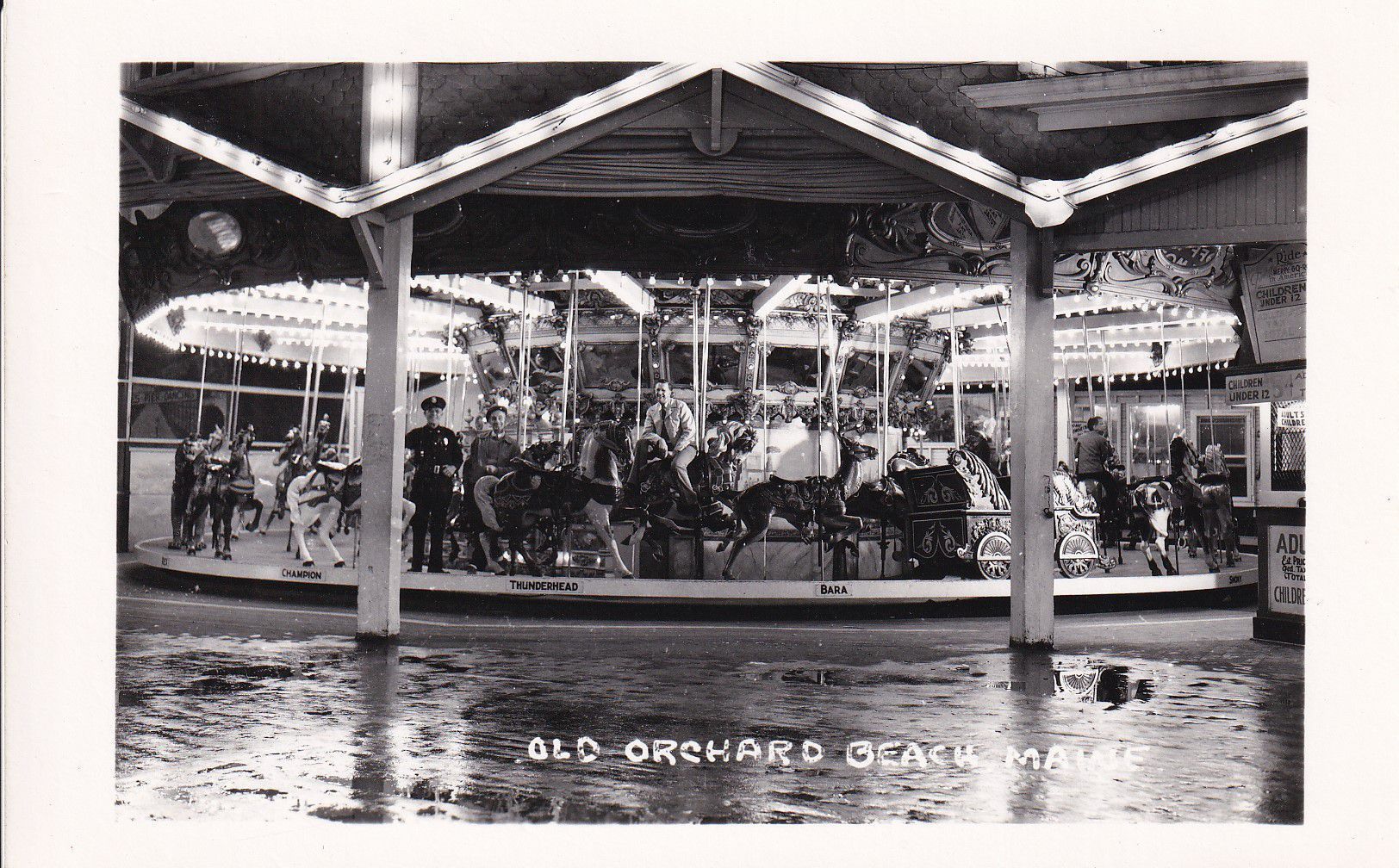 A postcard bearing a black and white photograph of people riding a merry-go-round.