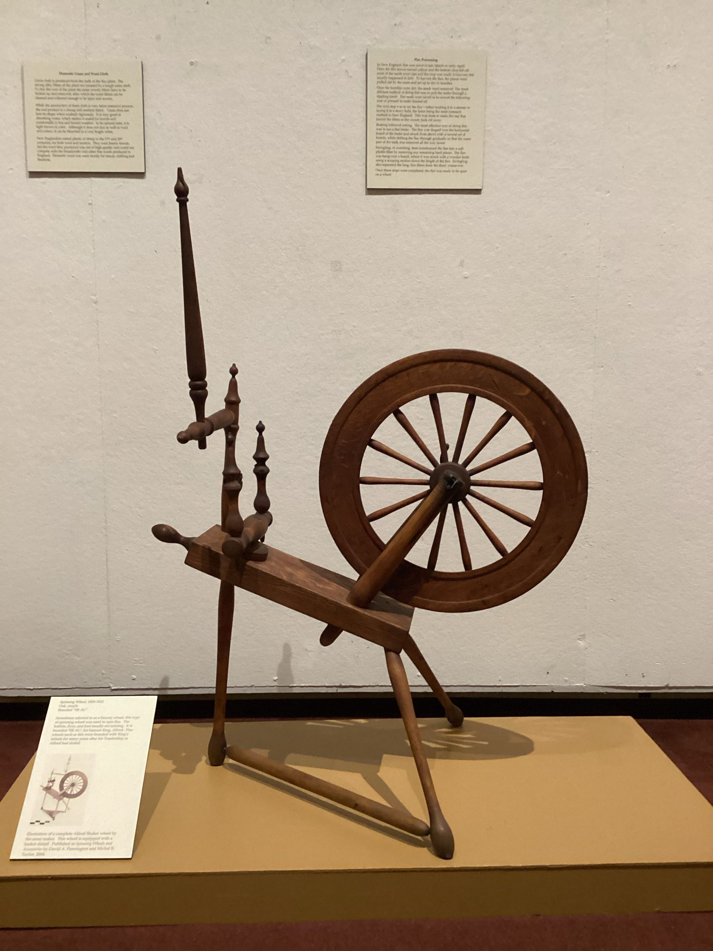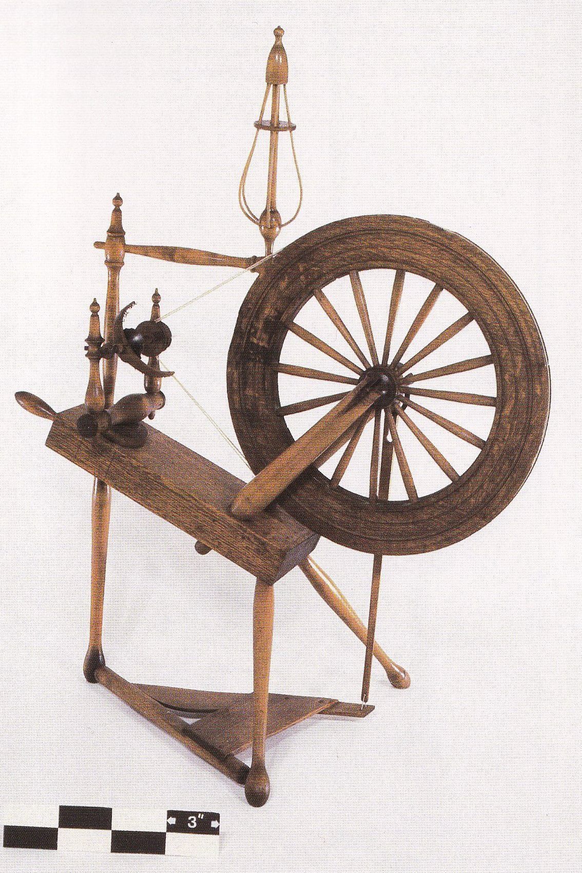 Sometimes referred to as a Saxony wheel, this type of spinning wheel was used to spin flax. The bobbin, flyer, and foot treadle are missing. It is branded "SR AL", for Samuel Ring, Alfred. Flax wheels such as this were branded with Ring’s initials for many years after his Trusteeship in Alfred had ended.
