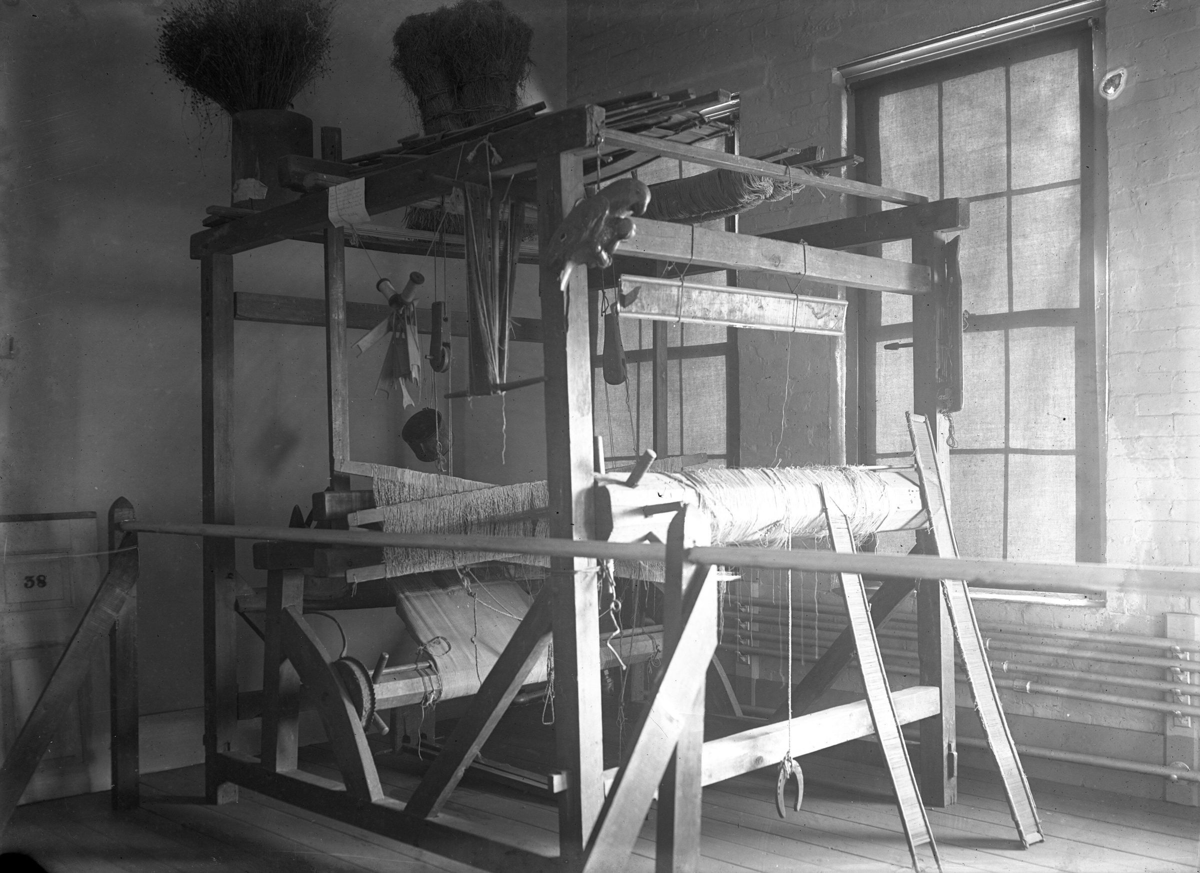 Glass plate negative photo of the barn loom at the York Institute in the Sweetser Block building in Saco. The barn loom is still in the Saco Museum collection.