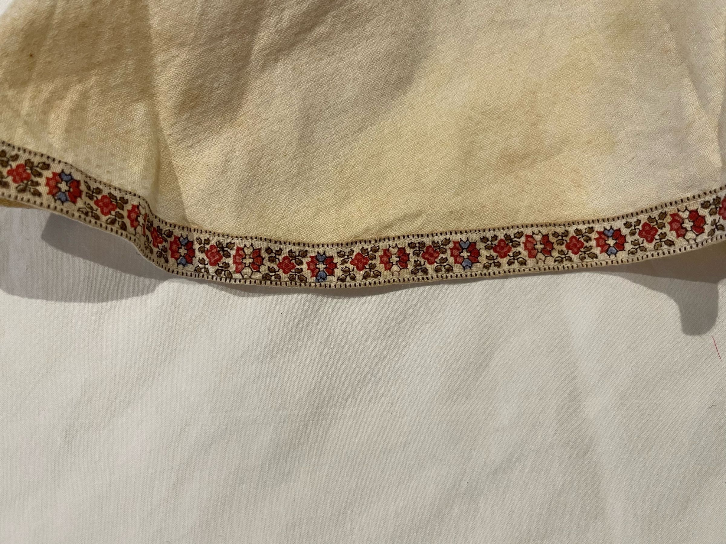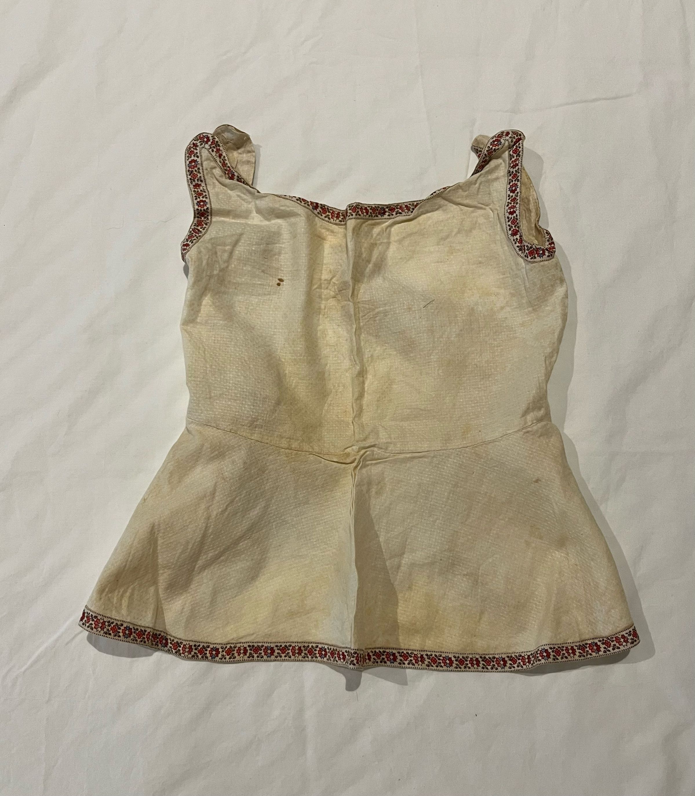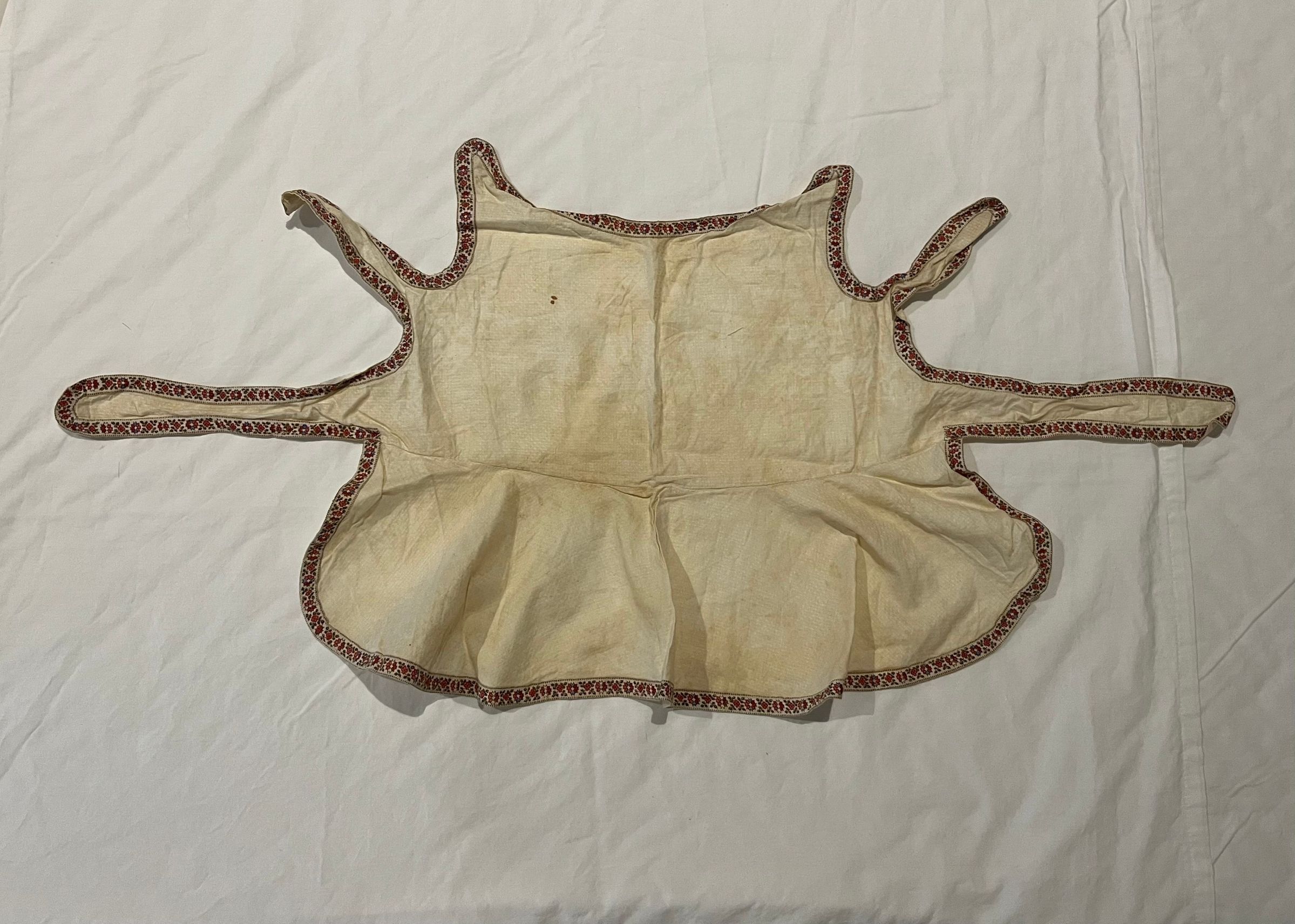 White cotton apron trimmed around the edges with a floral printed cotton tape. Pins at the shoulders and ties at the back. Seamed at the waist.