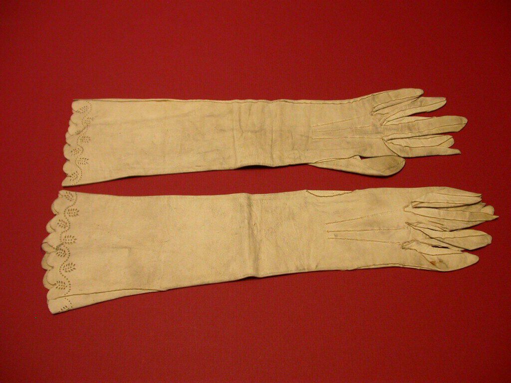 Long white kid gloves with pinked scalloped hems decorated with a leafy vines.