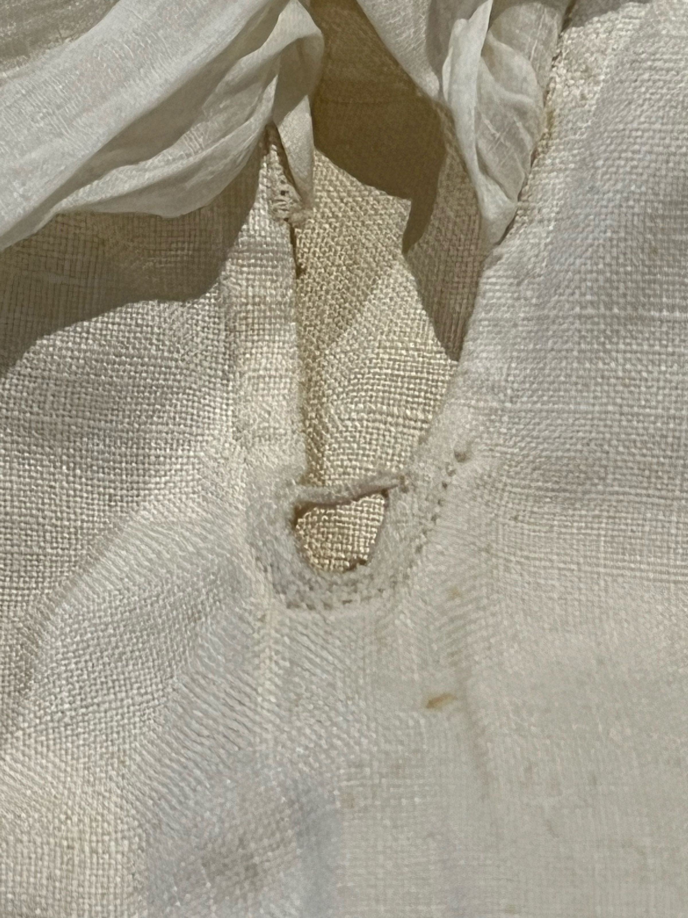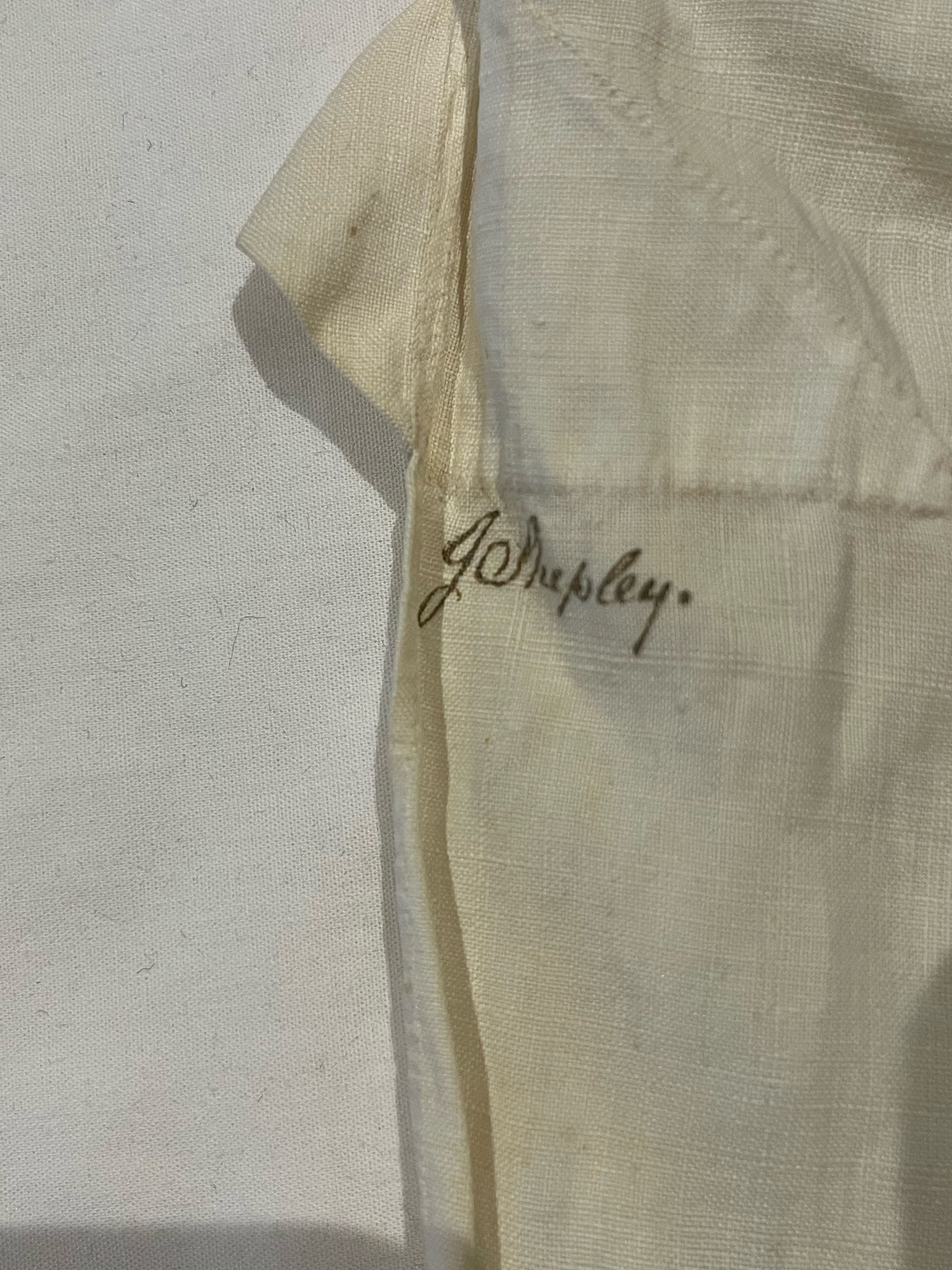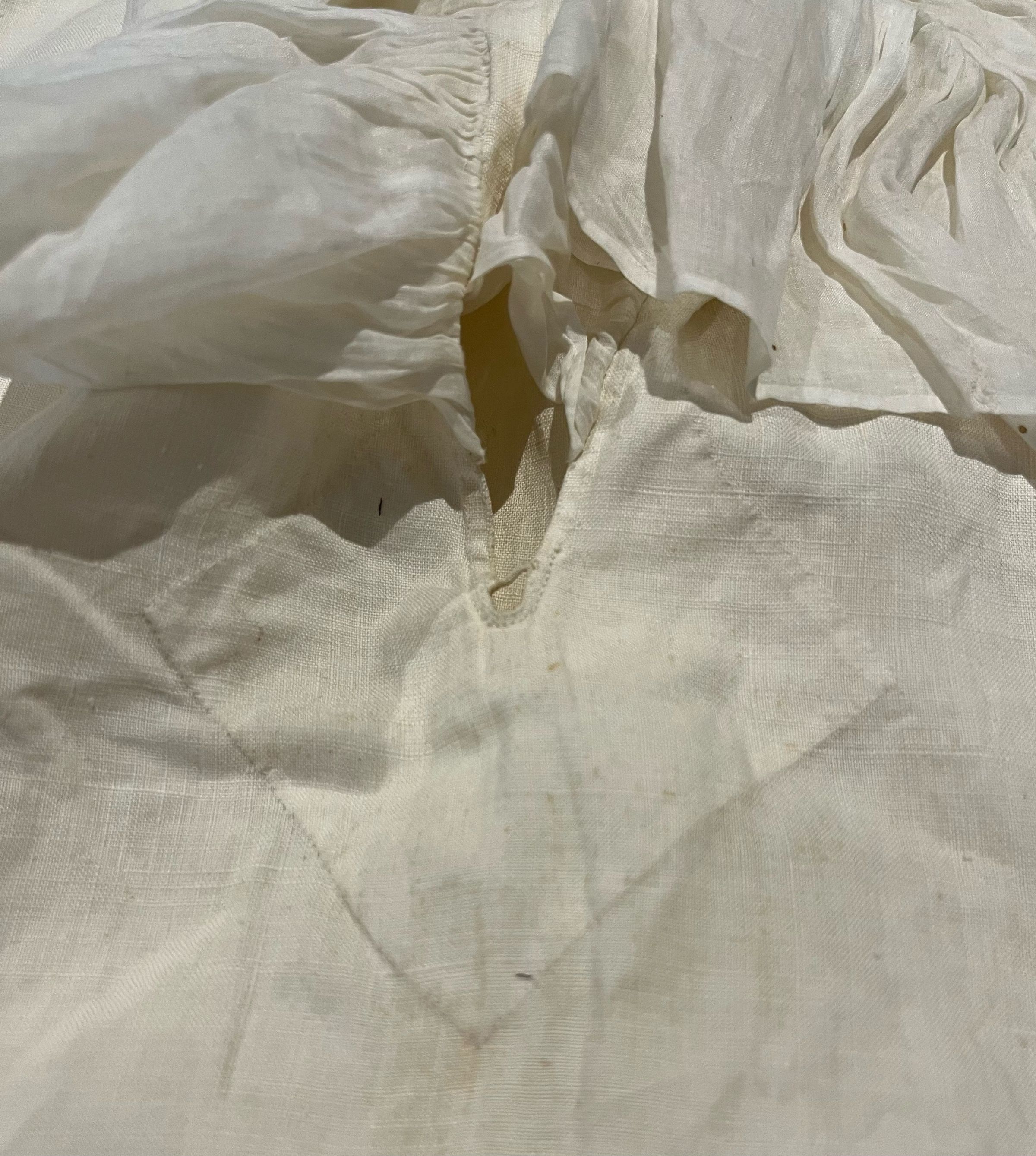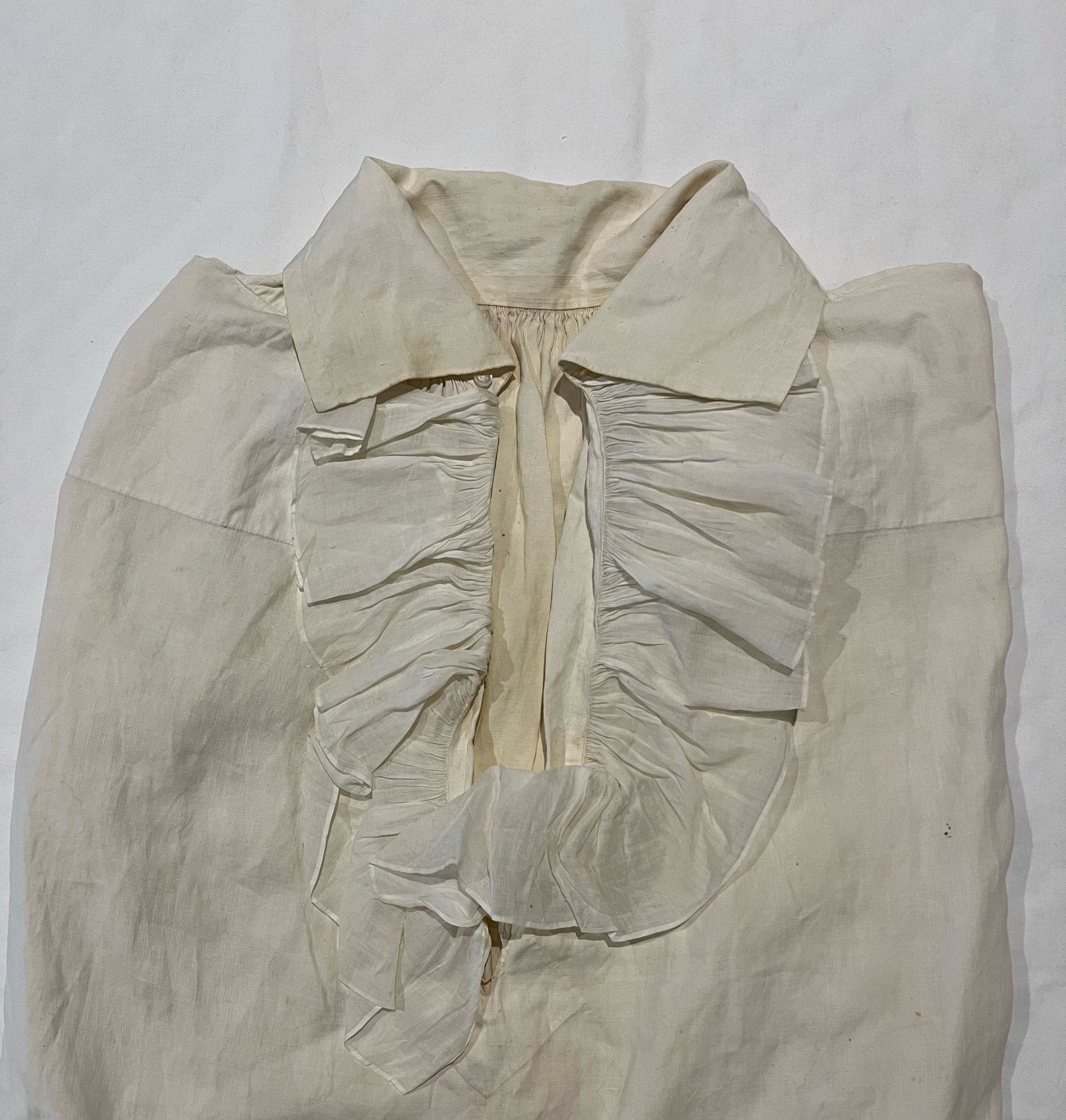 Man's white linen shirt with a fine cotton ruffle on the bosom opening. Base of the bosom opening reinforced with a rather large diamond-shaped patch. Wide collar designed to be folded down. Collar closes with a single button. Sleeves are gathered at the shoulders and the cuffs. Wide cuffs close with one button near the gathers. One cuff button is now missing. The other cuff and the collar buttons seem to be later replacements. Shoulders are reinforced at the top and reinforcing band is sewn along the side seams where they meet the sleeves from the shoulder to several inches below the sleeve gusset.Dimensions