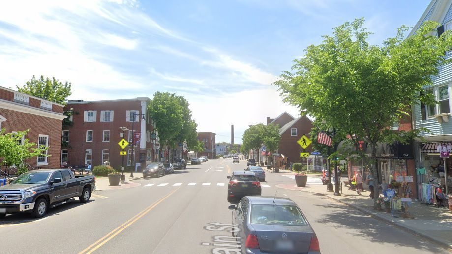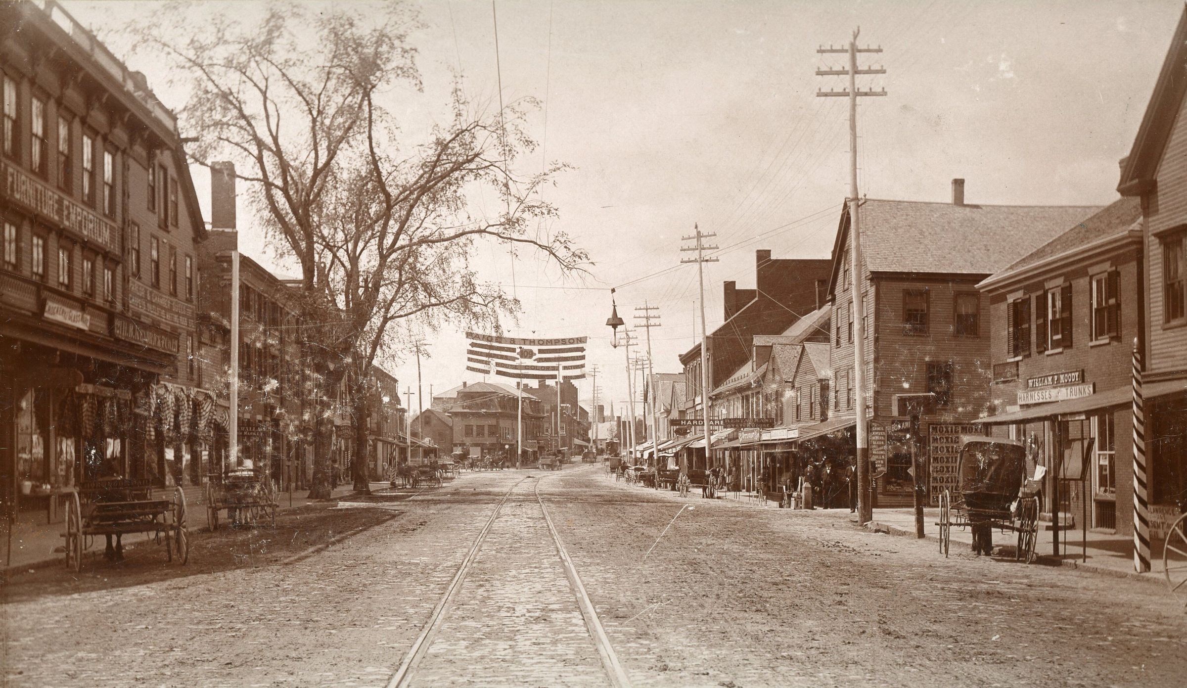 A photograph print of the Main Street, Saco. Circa 1900. A banner for Paige & Thompson paint and furnishings store his hanging above the street. Several business signs can be seen. On the left side is the Thornton Block which included Atkinson's Furniture Emporium, H. B. Kendrick Store (Clementine Kendrick Burns' stationary and book store) and Frederick S. Wallace's Fish Market. The next building is the Saco House and the Postal Telegraph Office. On the right are signs for David Buck's "Hardware" store, "Restaurant and Oyster House," a poster for Moxie, "J.O. Bradbury" (James O. Bradbury, attorney) and "William P. Moody Harnesses and Trunks." The various businesses listed in the Biddeford & Saco Directory dates this photo to right around 1900.