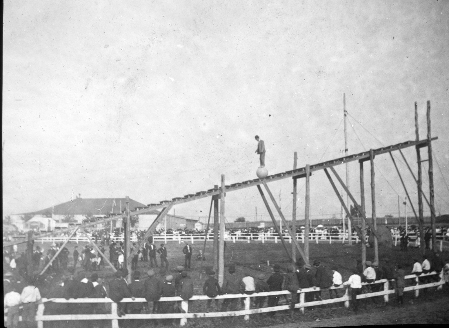 Glass lantern slide of a circus spectacle of some kind. A man is balancing on a ball on a ramp as a crowd of people look on. "At Hillside Park" is written on an "Essex Camera Club, Newark, NJ" label on the slide.
