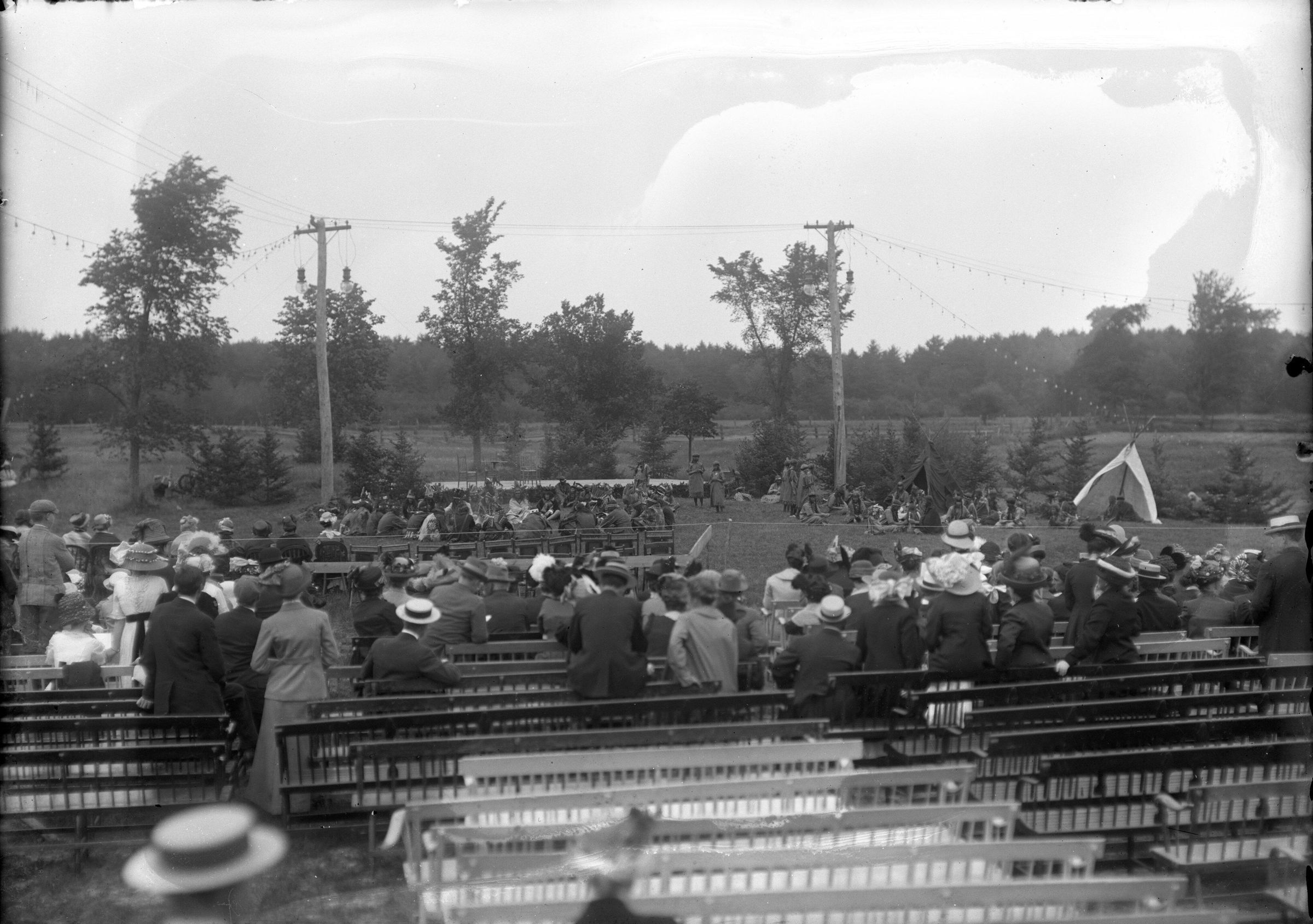 Glass plate negative photo of the Thornton Academy Centennial Celebration, June 19, 1913. Students dressed up as Native Americans and performed the scene "Indians on the banks of the Saco River." Thornton Academy put on a "History of Saco" pageant to celebrate the founding of the school (also see photo of program booklet from Dyer Library archives).