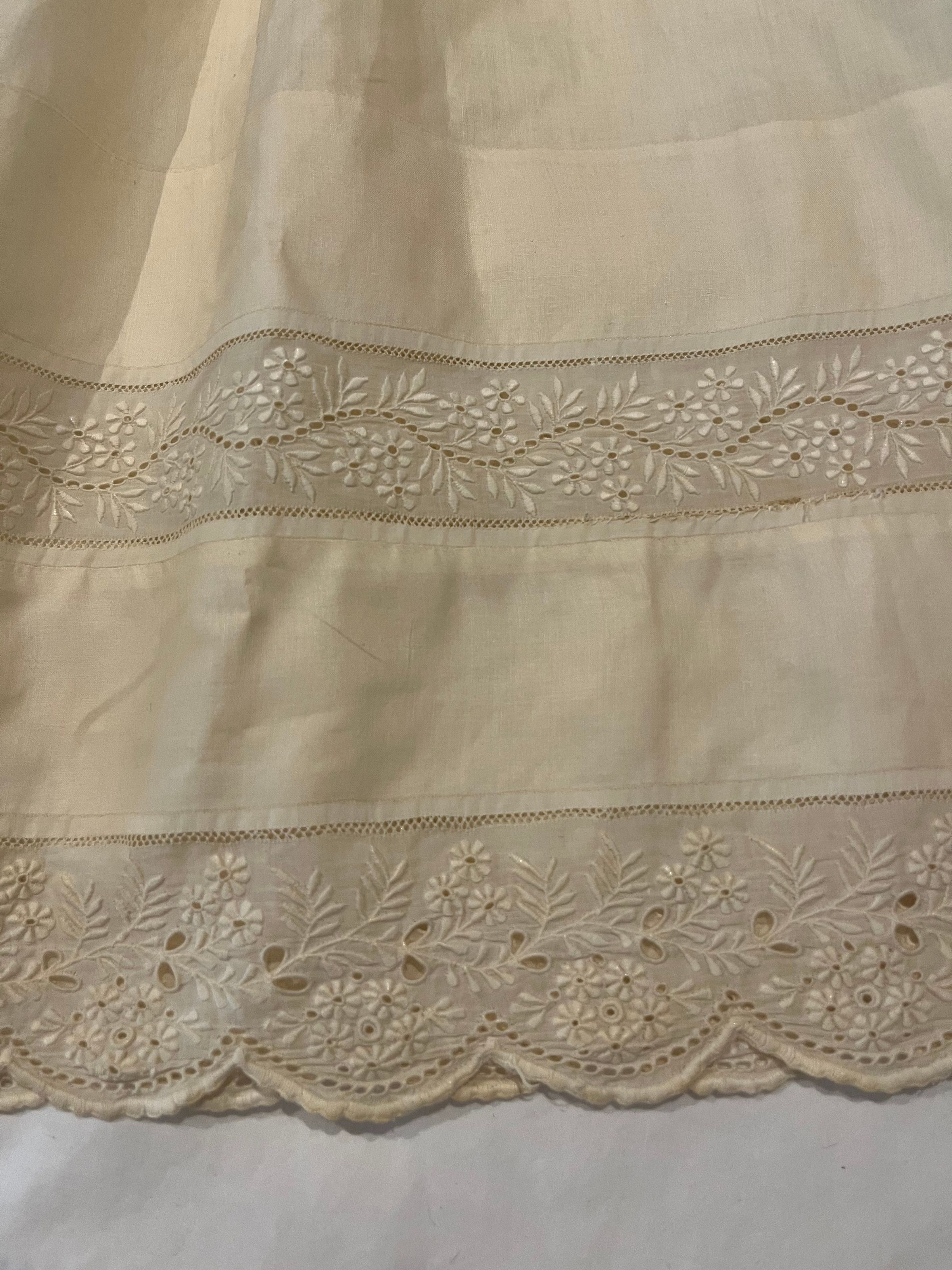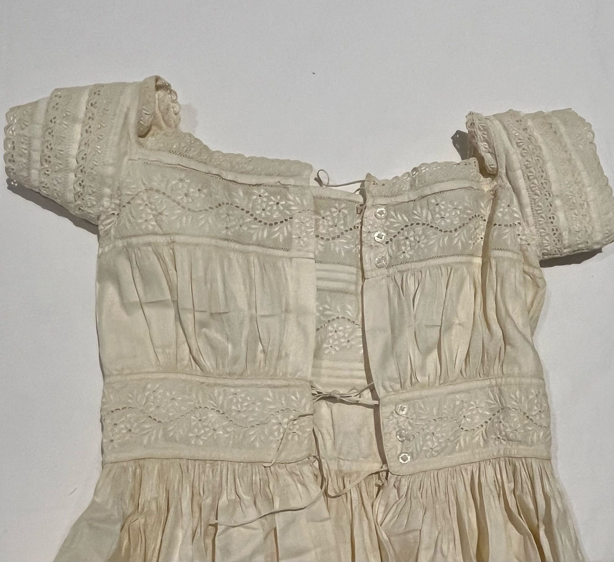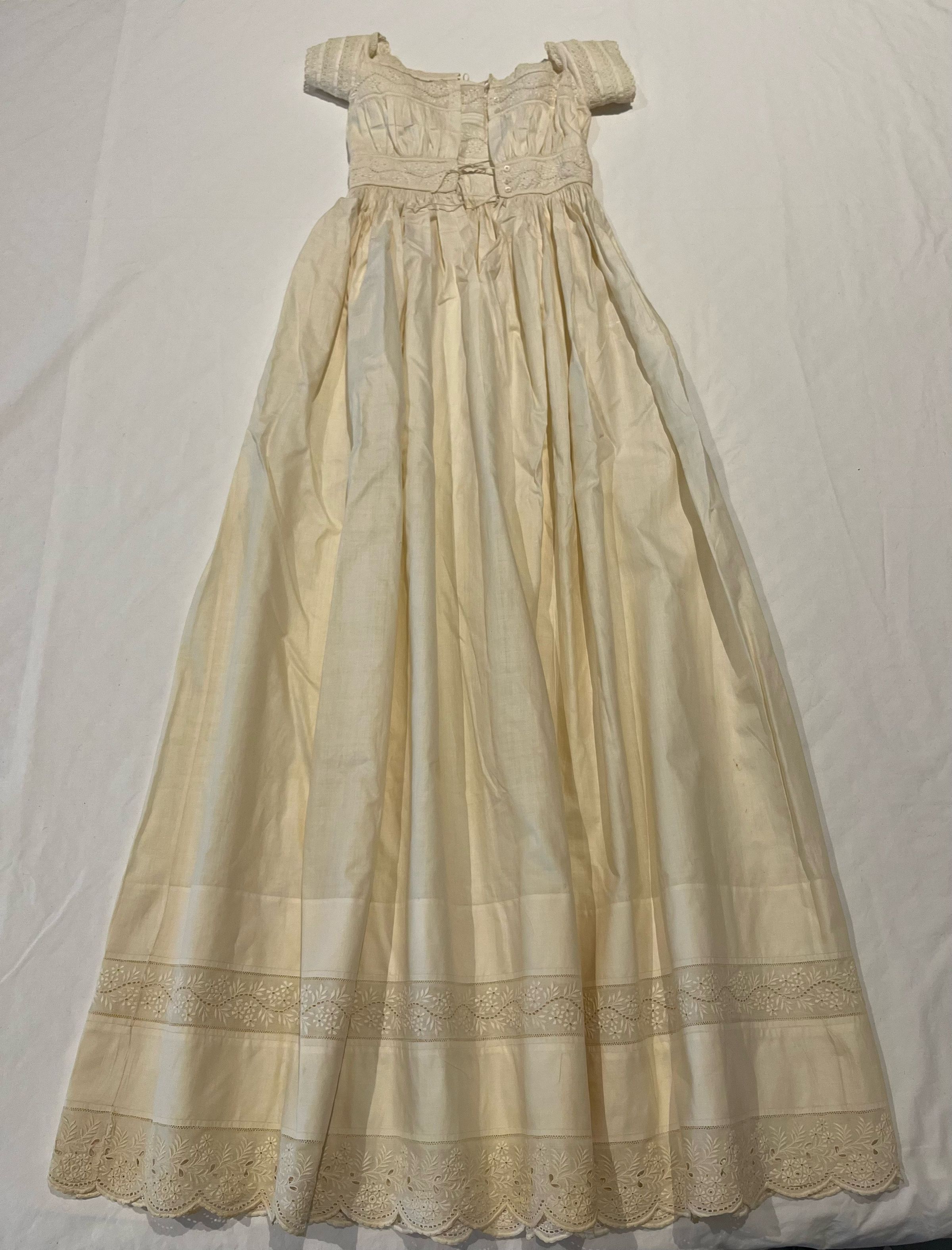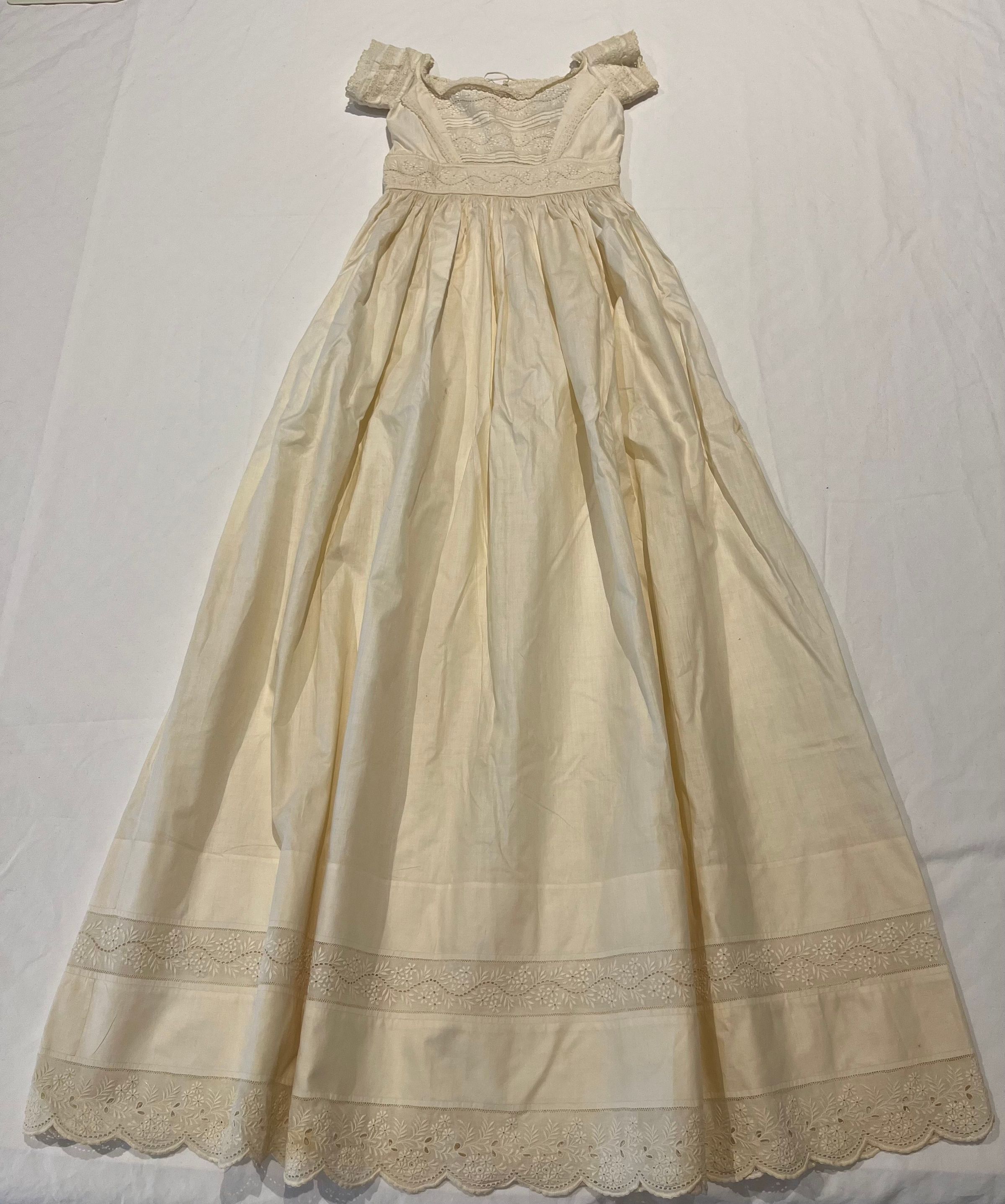White cotton sateen christening dress with eyelet trim. Wide square neckline trimmed with eyelet. Short sleeves with three narrow bands of eyelet and a single pleat in between. Wider eyelet in a floral pattern around the waist. The same eyelet forms the front of the bodice in two graduated rows with pleats in between. The same narrow eyelet trims the side of the front of the bodice. Long skirt has one row of the wider eyelet and a similar eyelet with scalloped edges forms the hem. Closes in the back with three white buttons at the top of the bodice and three white buttons at the waist, as well as three sets of tiny tapes, two at the waist and one at the top.