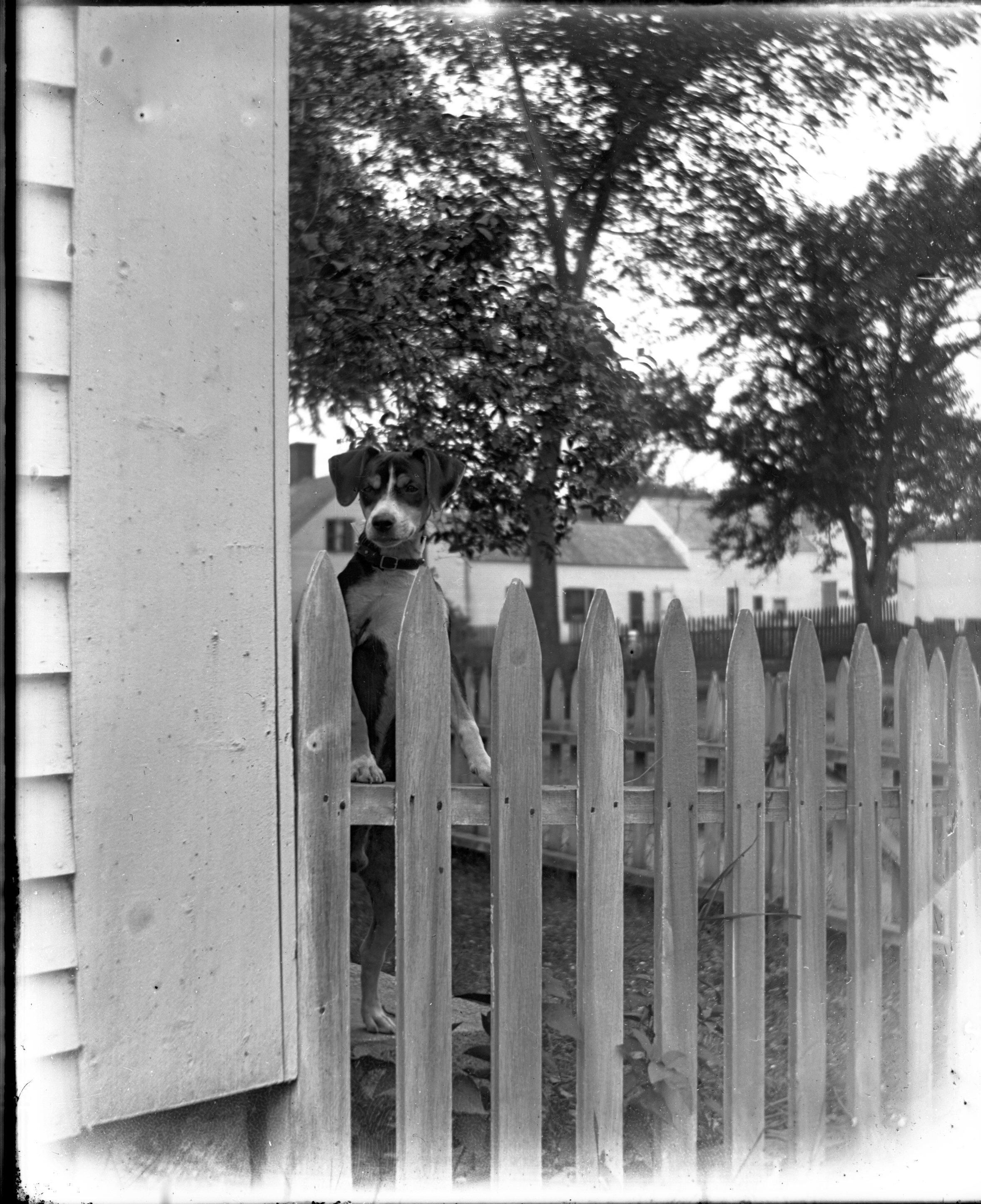 Glass plate negative photo of Rufus Milton Hobbs' dog at the Hobbs residence on Hill Street in Saco, ME.