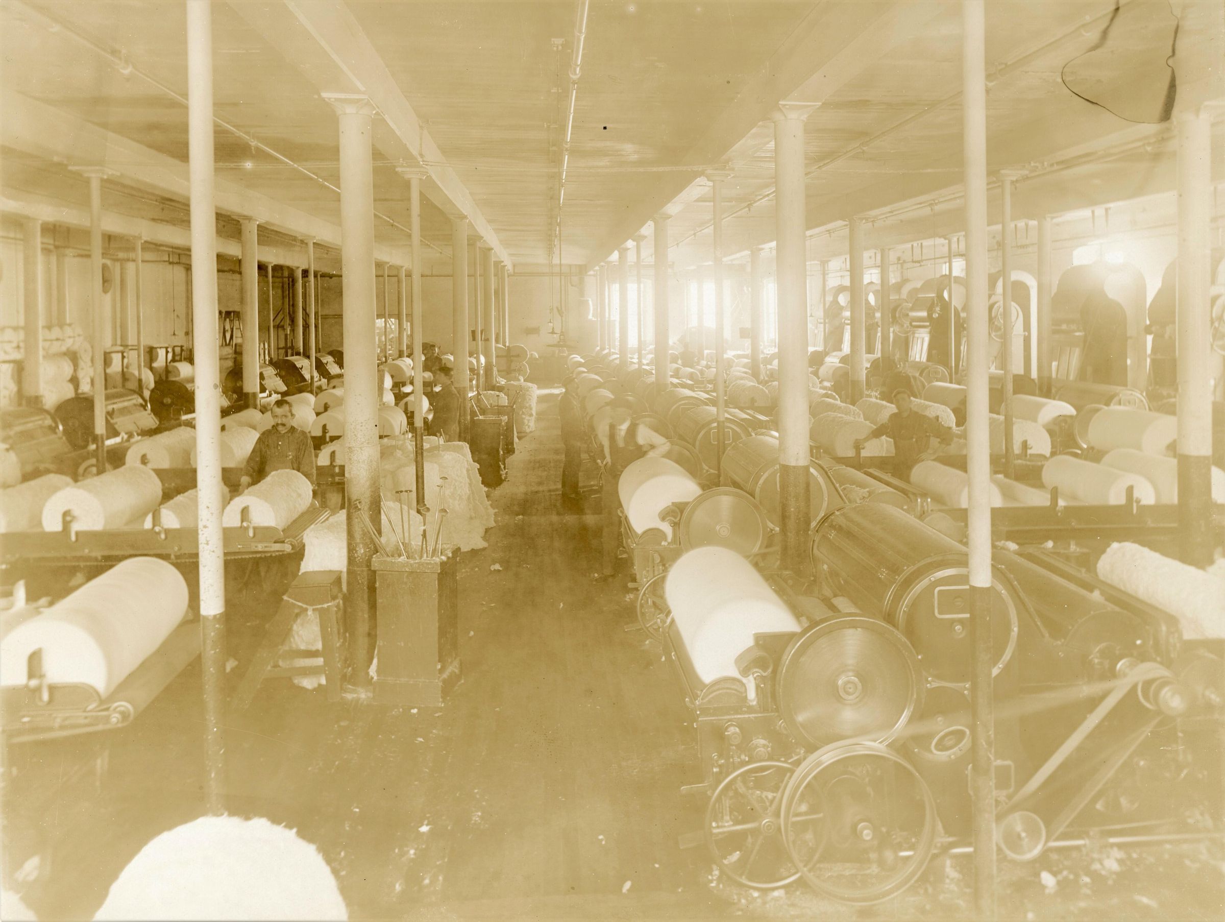 Photograph of workers in a picker room in the Laconia Division of the Pepperell Manufacturing Company. Laps of cotton moved from the opener picker through an intermediate picker and then were fed into a finisher picker. After that, the product of the finisher picker went to the carding machine. The picker machines cleaned the cotton by using fans and beaters and then formed it into rolls of uniform thickness.