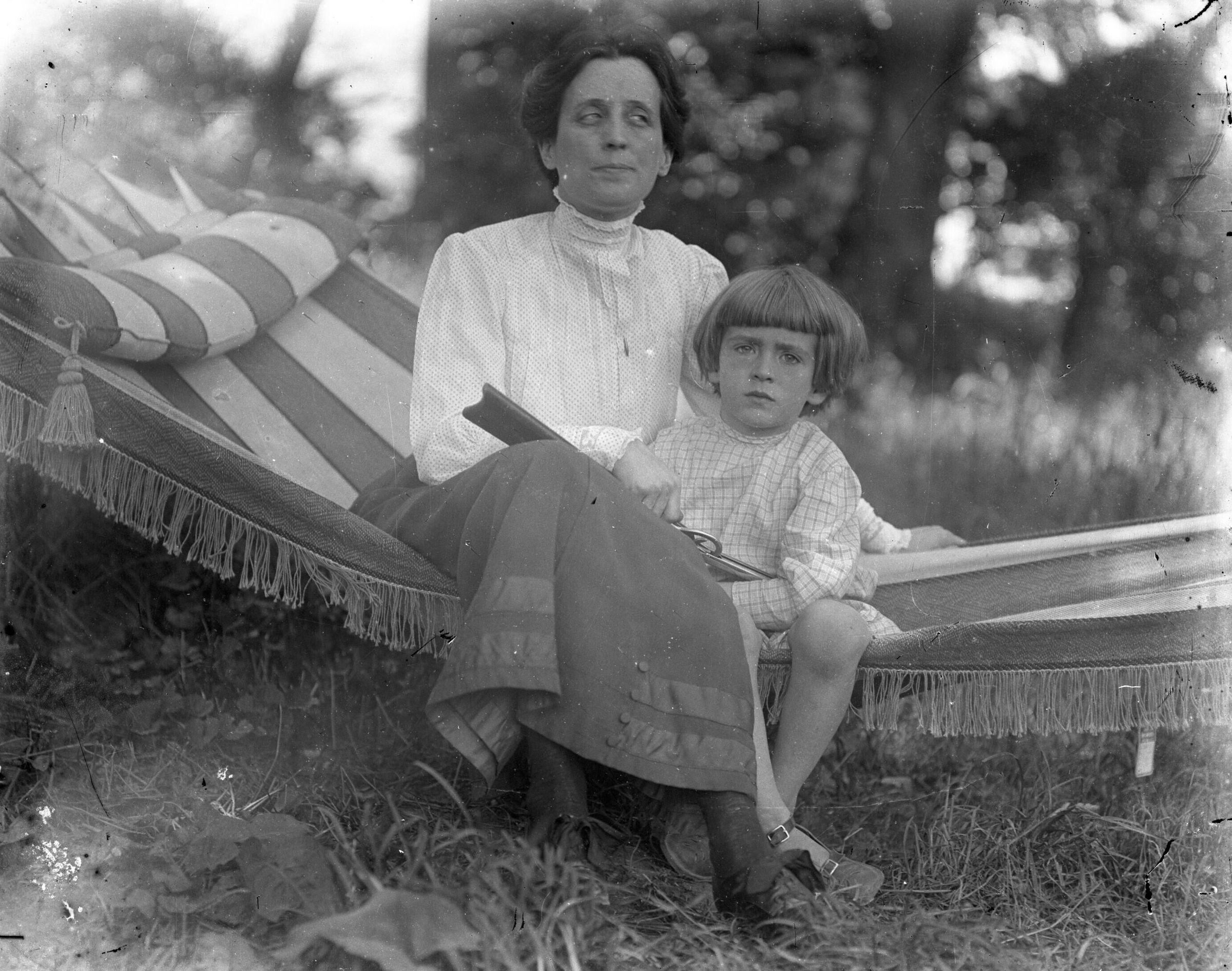 Glass plate negative photo of Maud Bradbury (1878-1958) and Herbert W. Bradbury (1911-1916) sitting on a hammock.Made/Created