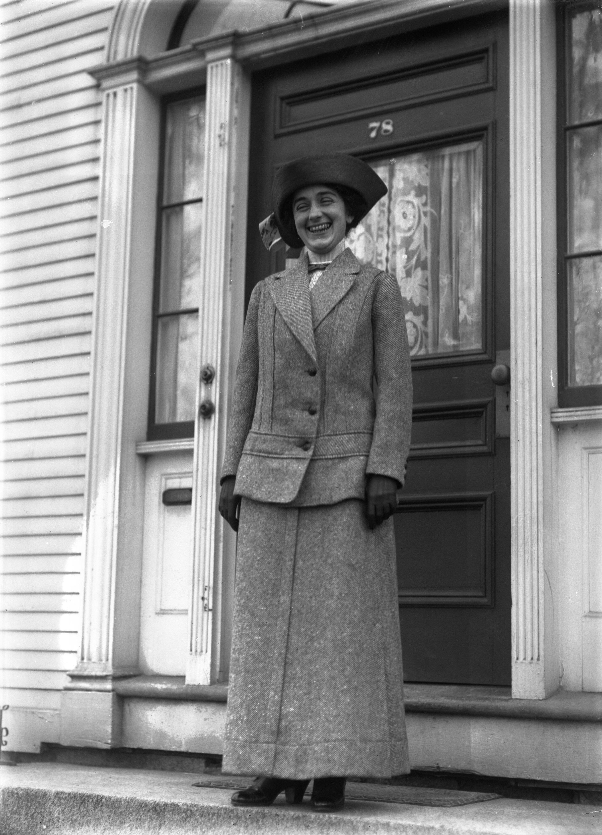 Glass plate negative photo of Vivian Lois Cole standing in front of the door of 78 North Street in Saco. Vivian Lois Cole (1890-1969) of Saco appears in numerous photographs by Charles E. Moody. Her sister, Ella Winifred Cole Sawyer (1887-1967) and her brother-in-law Howard B. Sawyer (1887-1935) lived on 78 North St.