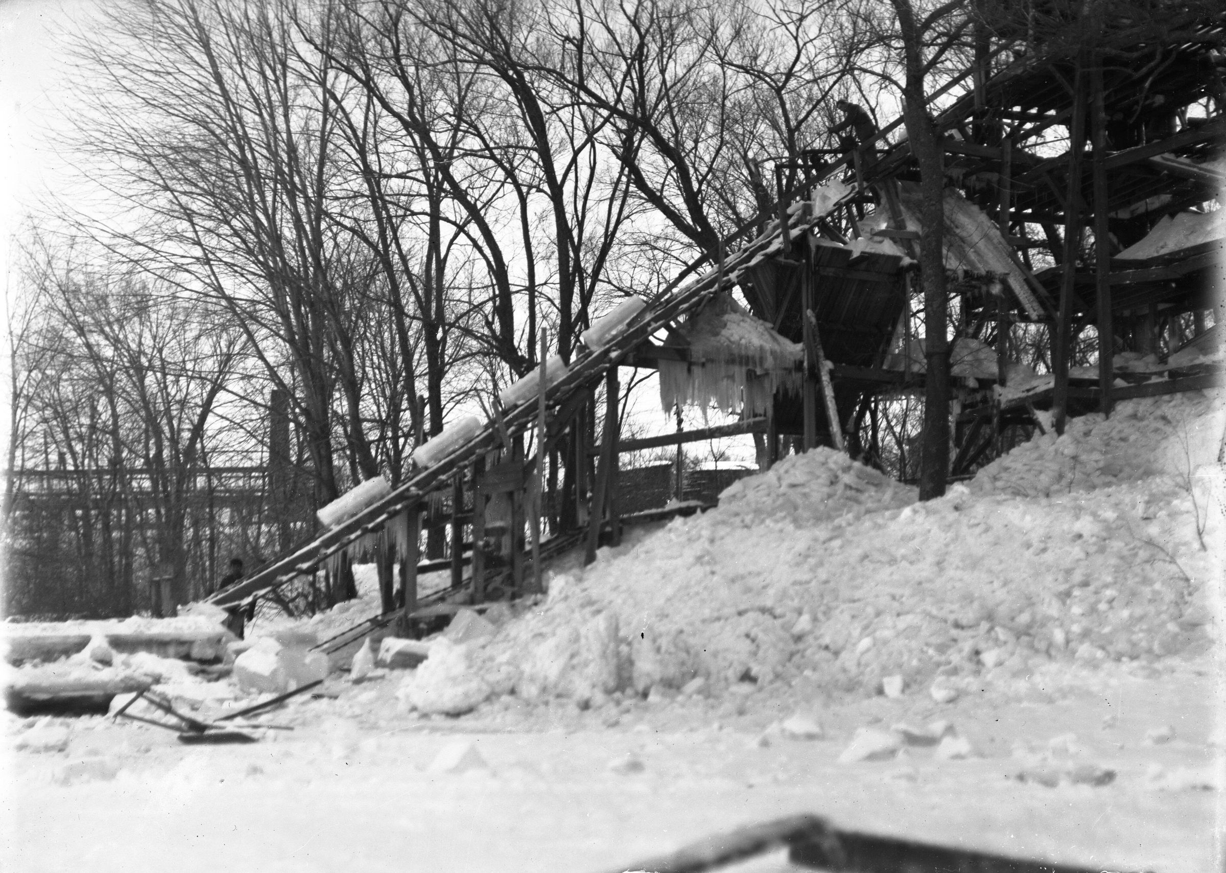 Glass plate negative photo of a conveyor belt for ice harvesting. Likely along the Saco River.