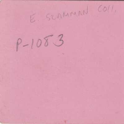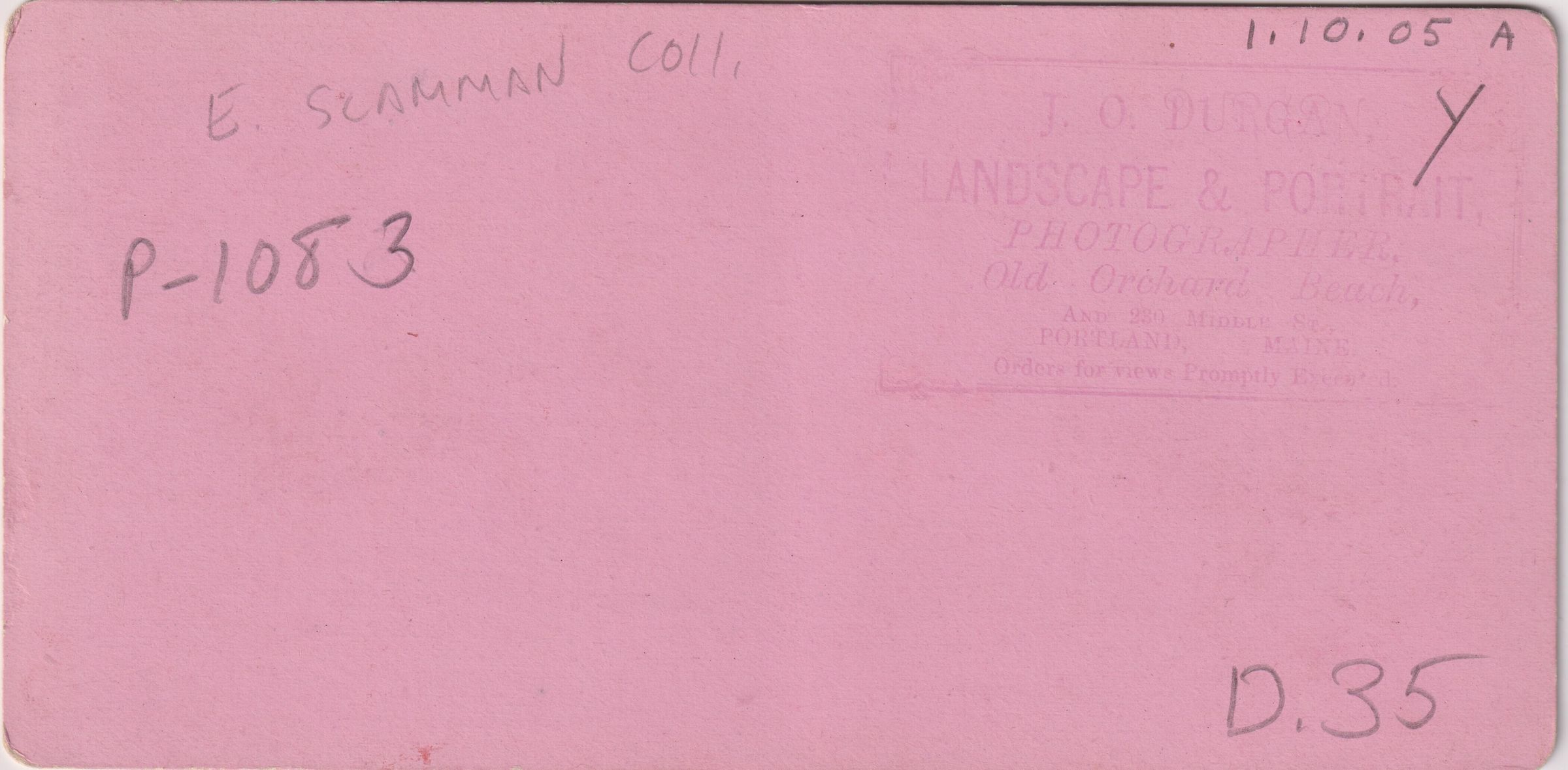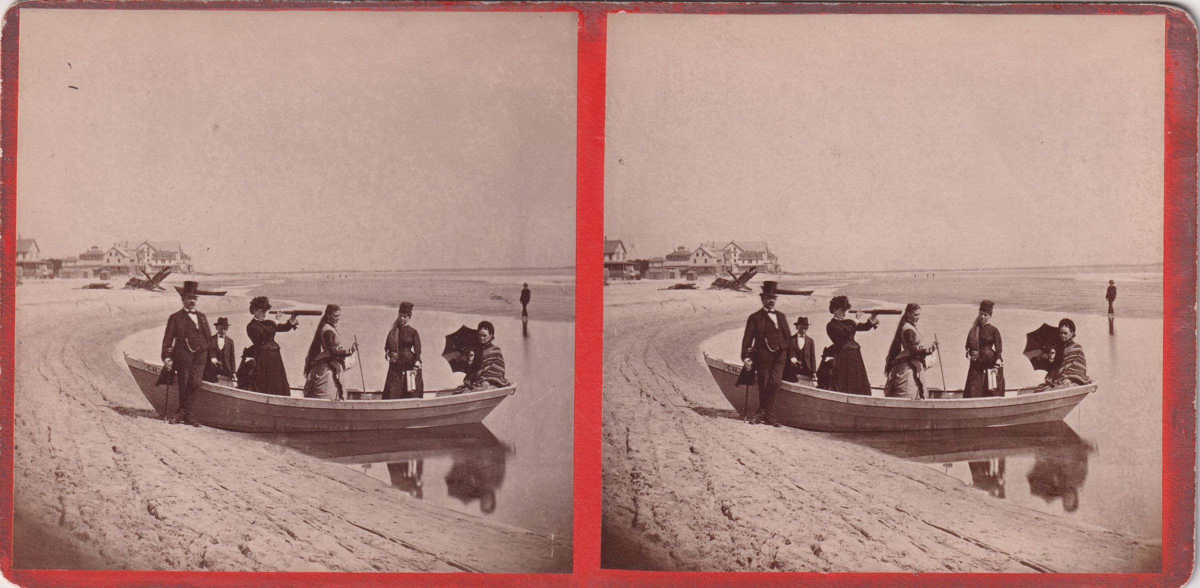 Stereograph of posed beach-goers in a canoe, featuring Edith Scamman and others at Old Orchard Beach.