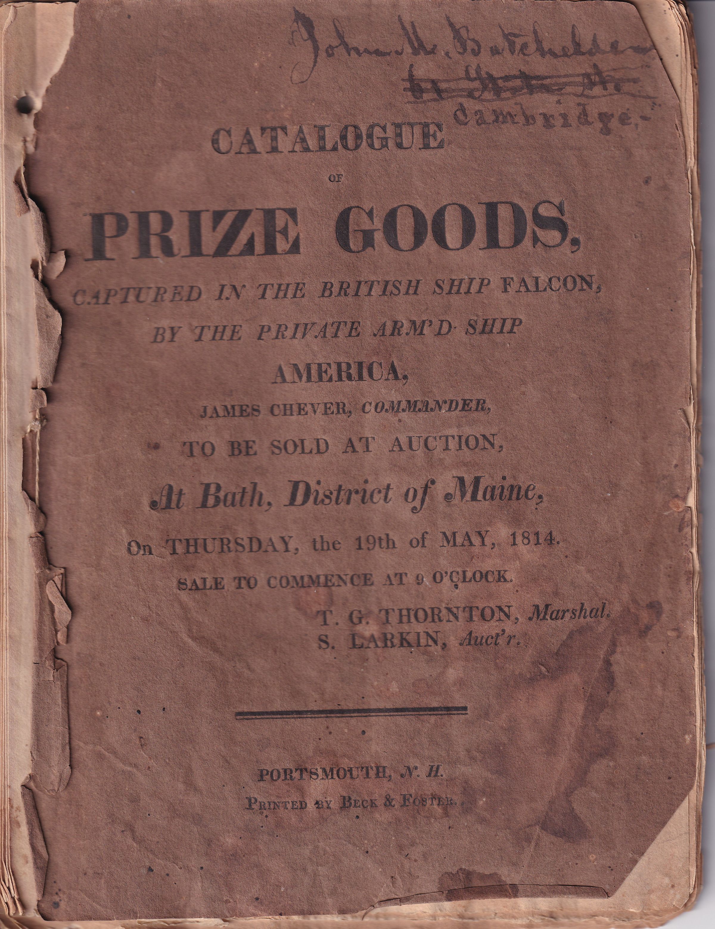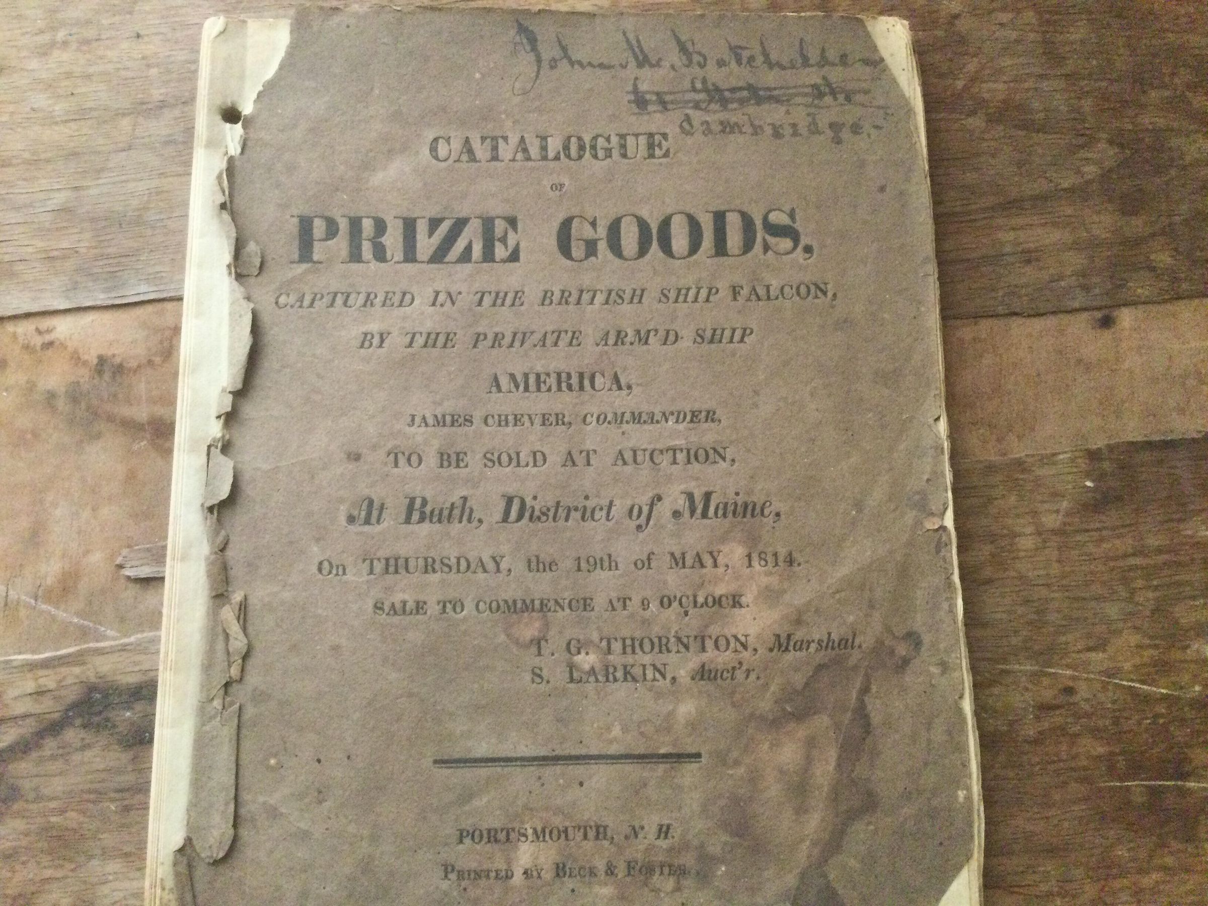 A printed pamphlet with a knotted string binding through two holes containing a description of goods by lot number, number of packages, a description of the contents of each case, and the cost in sterling.