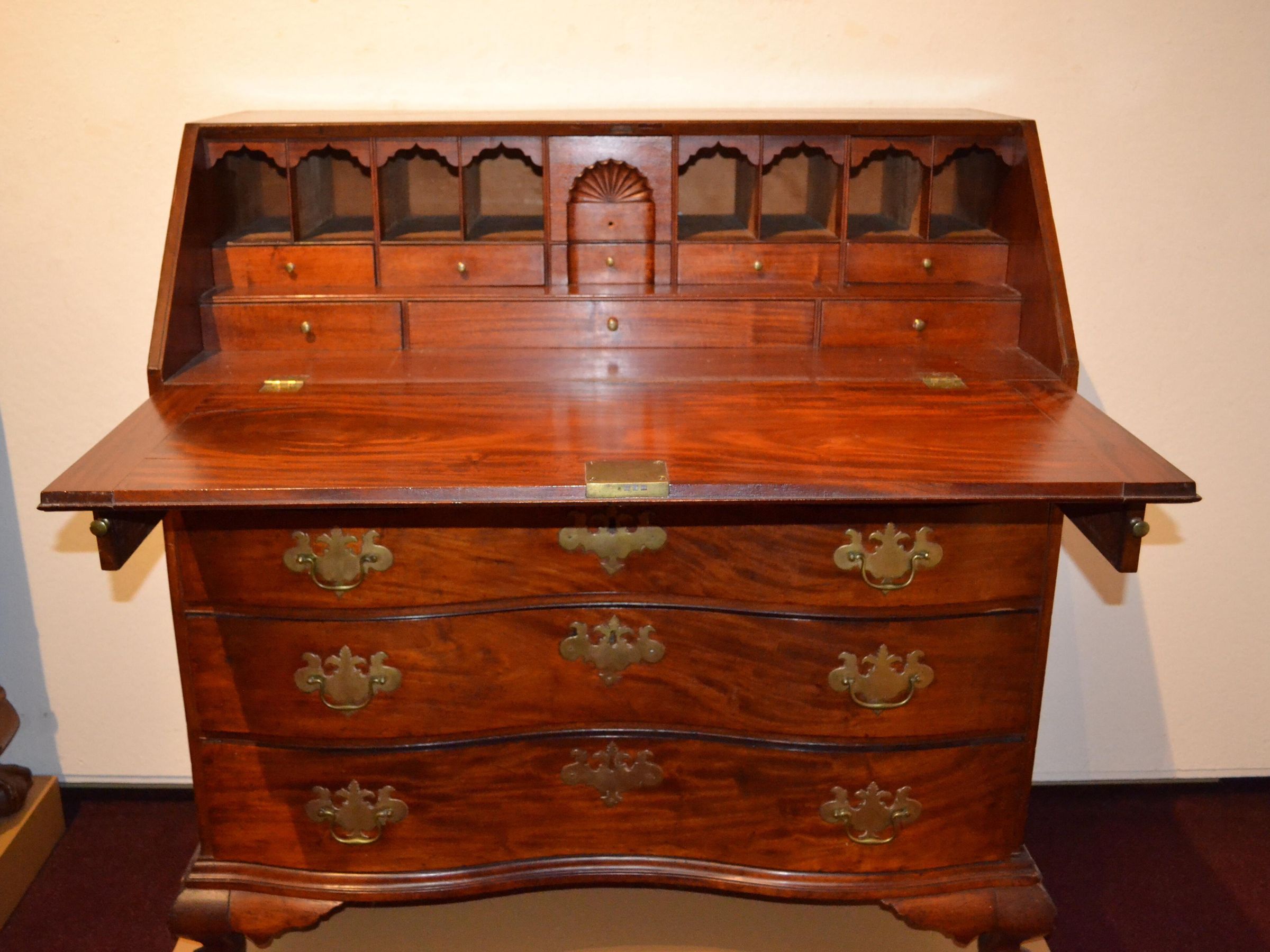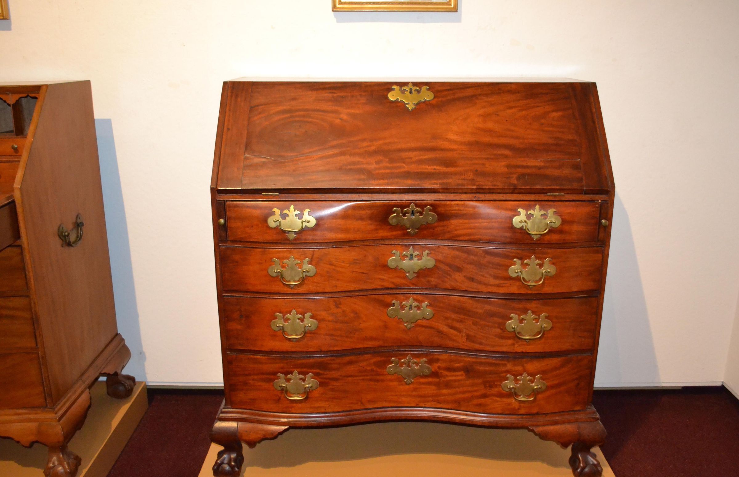 These two desks and a third one which is still owned by a local family are virtually interchangeable. That is, the design and dimensions are so close that drawers from one fit into the others. The bold form, generous proportions, and substantial claw and ball feet have a relationship to Boston-made desks of the period, however some of the construction details, such as the fine dovetails present in the drawers, may relate to other areas such as coastal Essex County, Massachusetts, where craftsmen were not as eager to get pieces out the door to the local customer or on board ship for sale elsewhere. Each drawer front is shaped from a single thick piece of mahogany, which may have been the craftsman’s way of creating the desired look without the expertise to make the most efficient use of costly imported tropical hardwood. Although three of these desks exist in close proximity to each other, the cabinetmaker that made them remains unidentified.