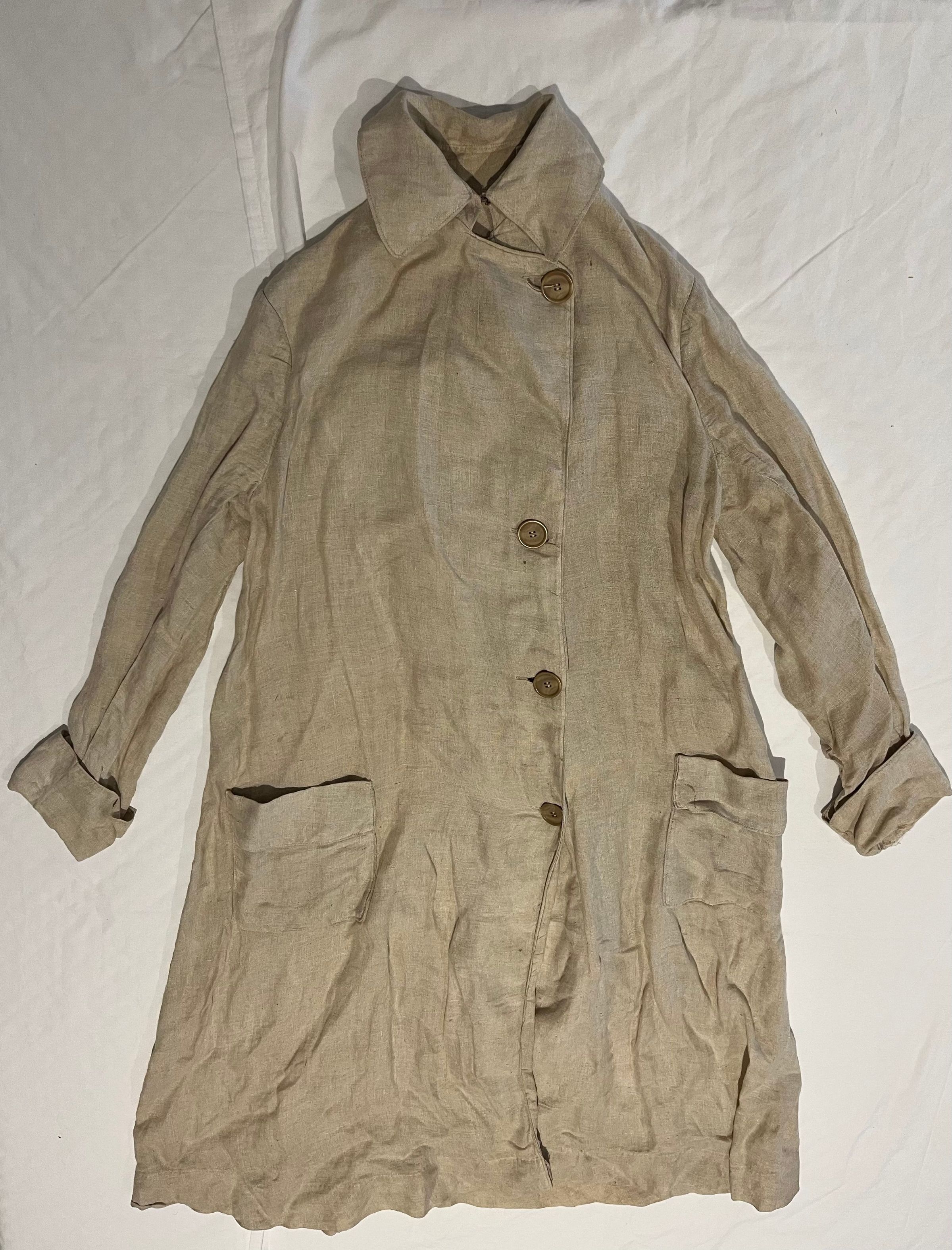 Linen coat, single-breasted with four 1" off-center brown buttons. Hook and eye closure at the neck. Two patch pockets with a 2 1/2" cuff folded back over the top. Straight sleeves with 3 1/" cuffs. Single center back seam, no vent. 2 1/4" deep hem secured with running stitches.