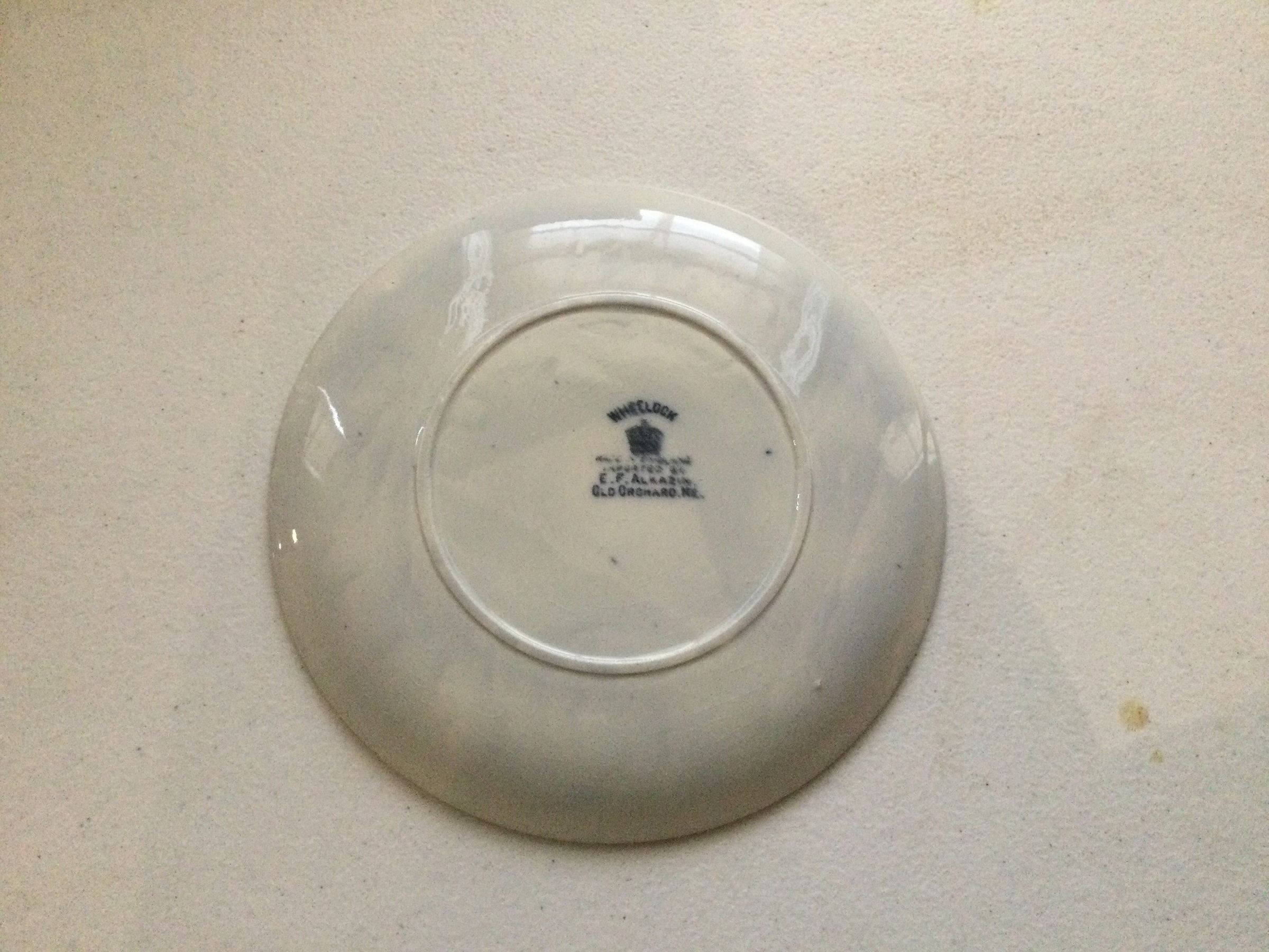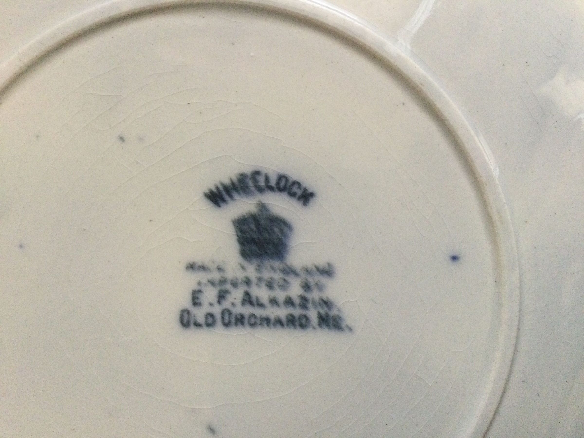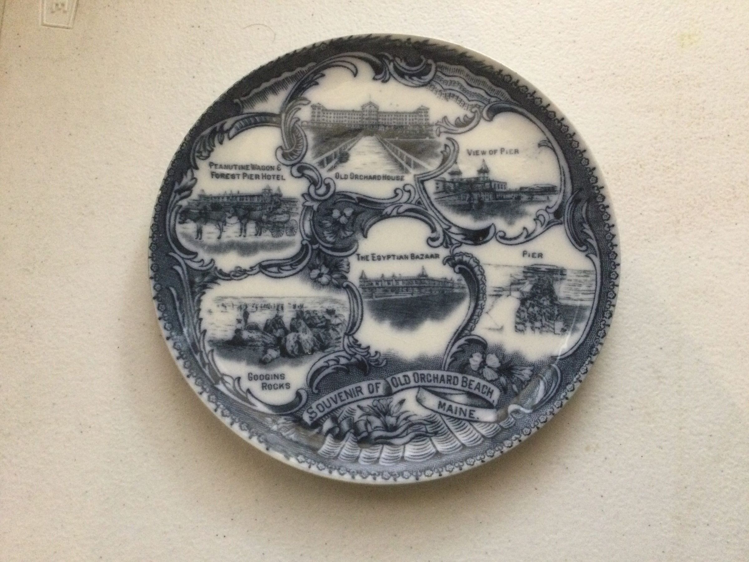 Blue-printed earthenware plate with “A SOUVENIR OF OLD ORCHARD BEACH/ MAINE.” in a banner at the bottom of the plate. Six popular attractions are depicted in individual cartouches enclosed by various types of scrollwork and flowers: The Old Orchard House, View of Pier, Pier, Googins Rocks, the Peanutine Wagon & Forest Pier Hotel, and The Egyptian Bazaar. These images were taken from photographic postcards. A stippled pattern encircles the reserves and alternating small flowers and fruit (?) form a border. An inexpensively and quickly produced plate, the print was smudged during the printing process, the printed mark on the back is also blurred, and there is cobalt residue on the back of the plate under the glaze.Made/Created