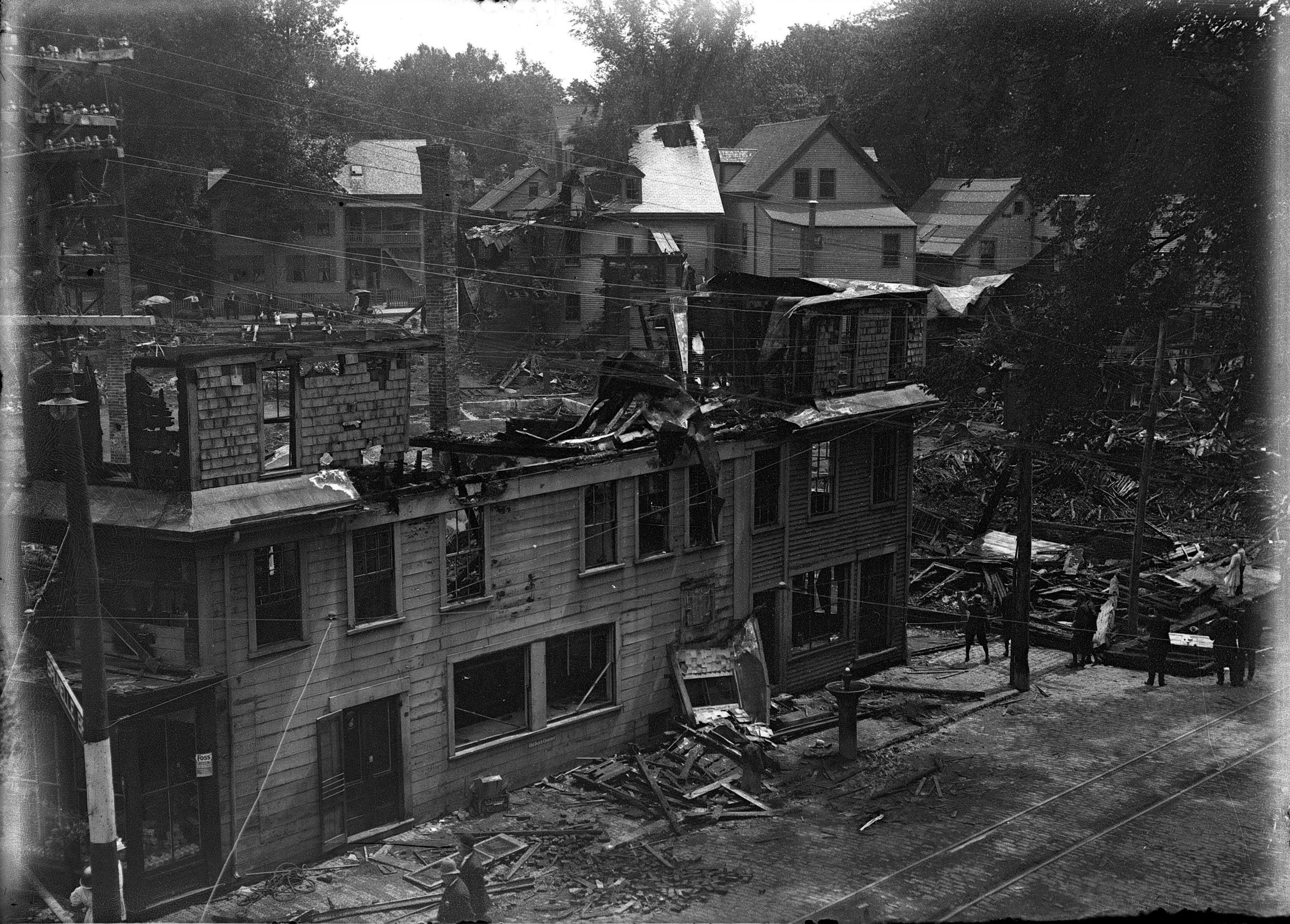Glass plate negative photo of a destroyed building in the aftermath of the Harmon's Corner (Main and Elm Street) fire in Biddeford. The Harmon's Corner fire in Biddeford occurred on July 8, 1911.