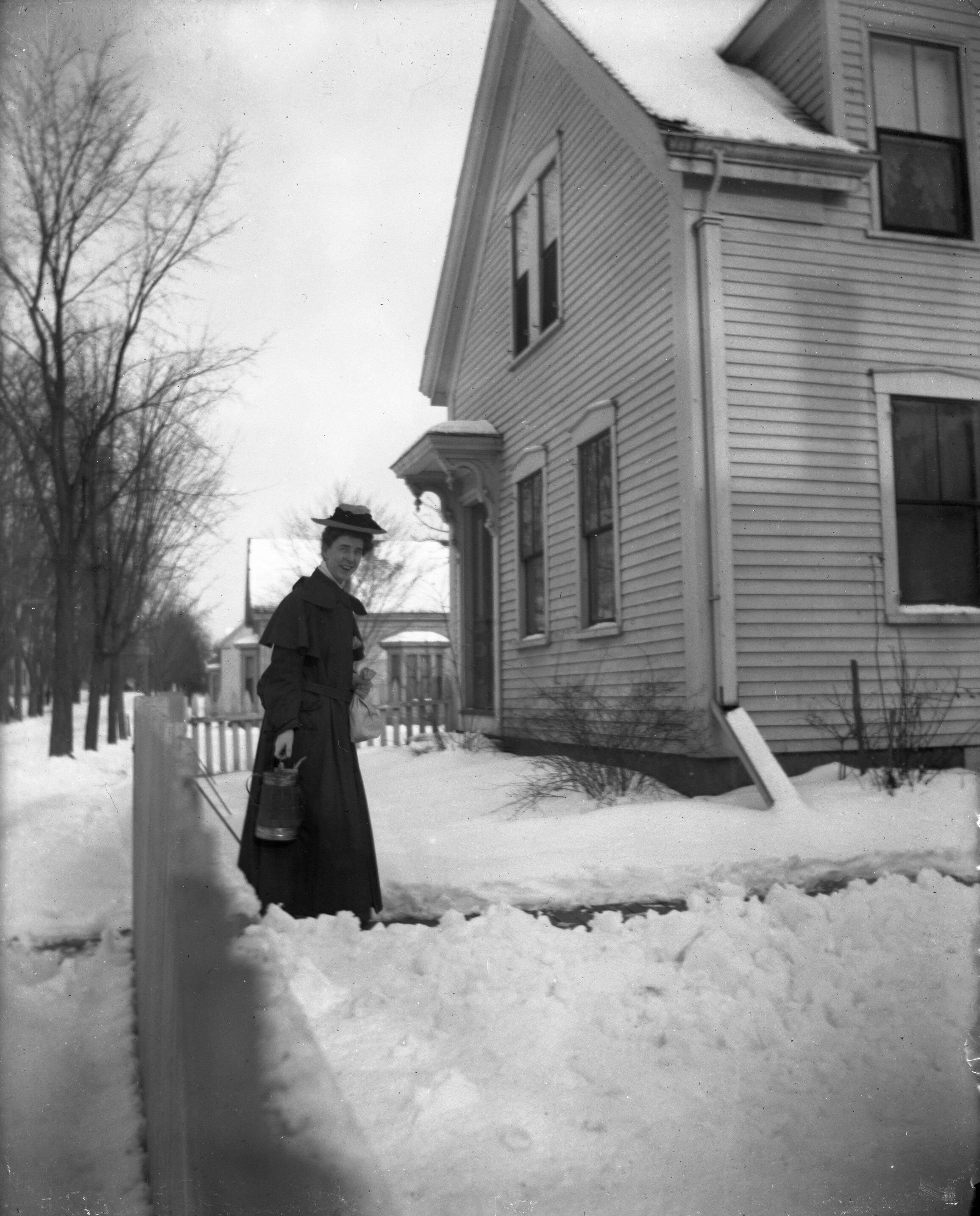 Glass plate negative photo of Cora Young Hobbs at the Young family's Hill Street house in Saco, ME.