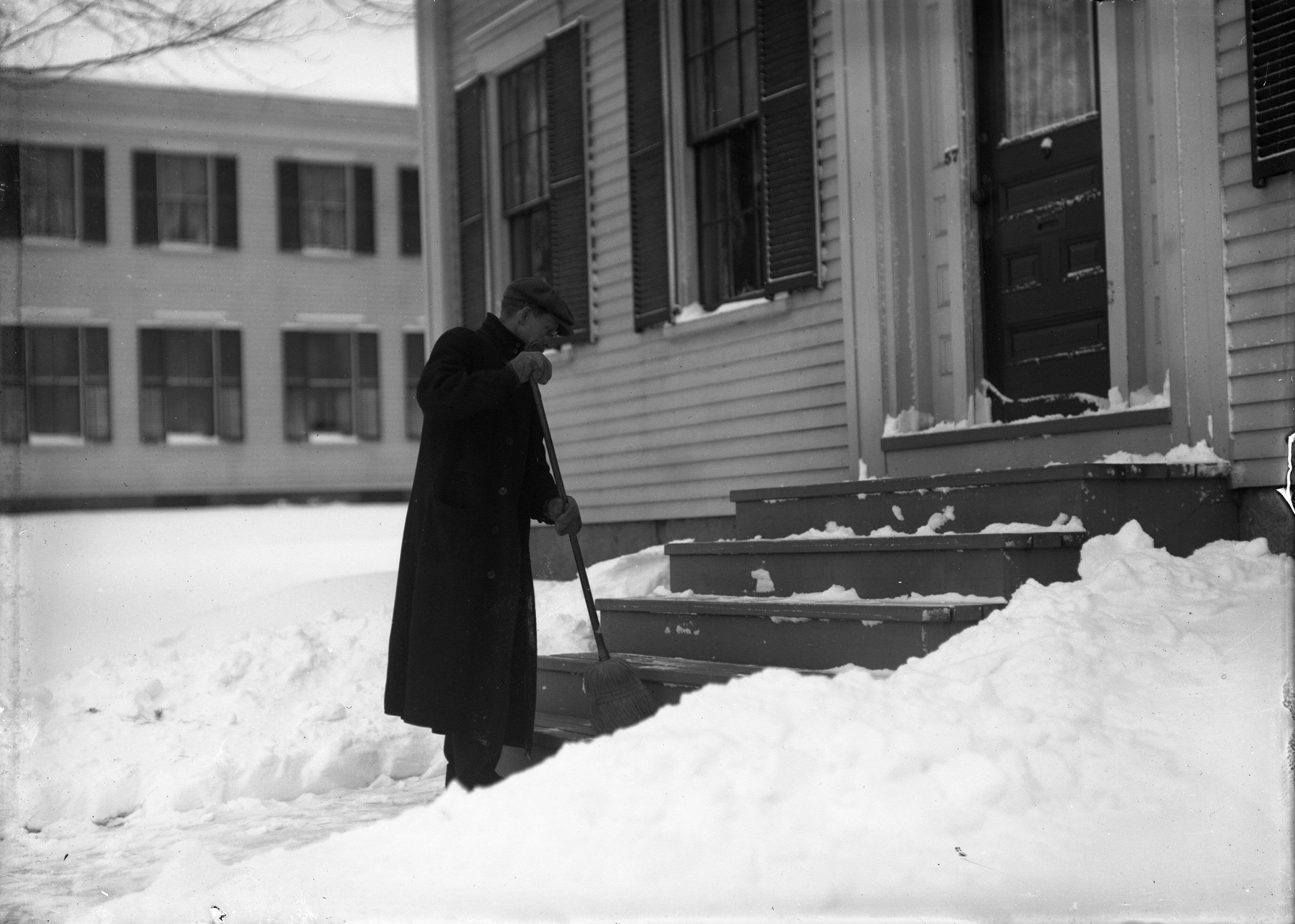 Glass plate negative photo of Charles E. Moody sweeping snow off the front steps of 57 Scamman Street in Saco. Charles lived with his brother Frederick, and Frederick's family at this address according to the 1913 Saco-Biddeford Directory.