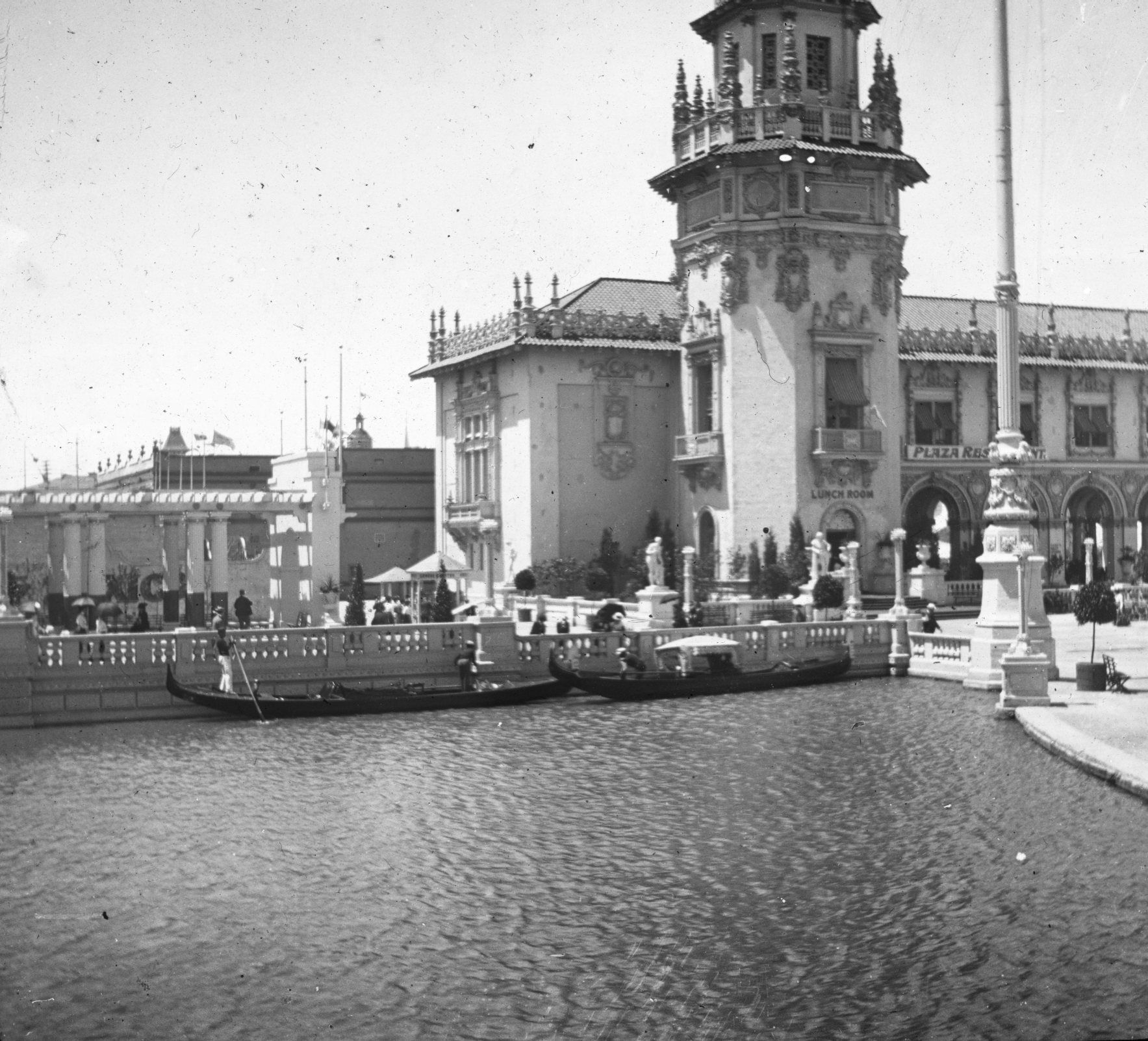 Glass lantern slide of gondolas on the Grand Canal at the Pan American Exposition in Buffalo, New York in 1901. Signs for the "Lunch Room" and "Plaza Restaurant" are visible on the building.