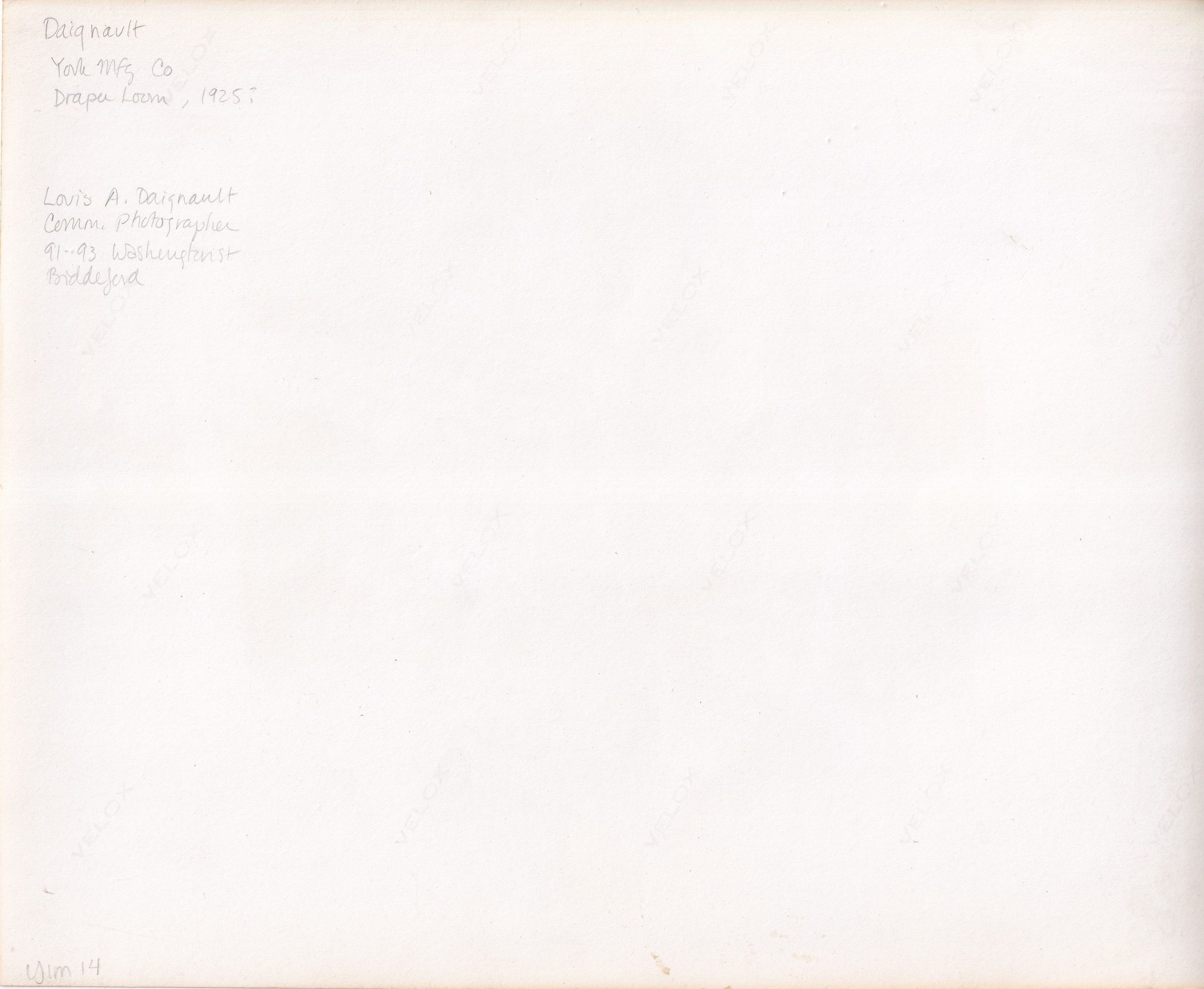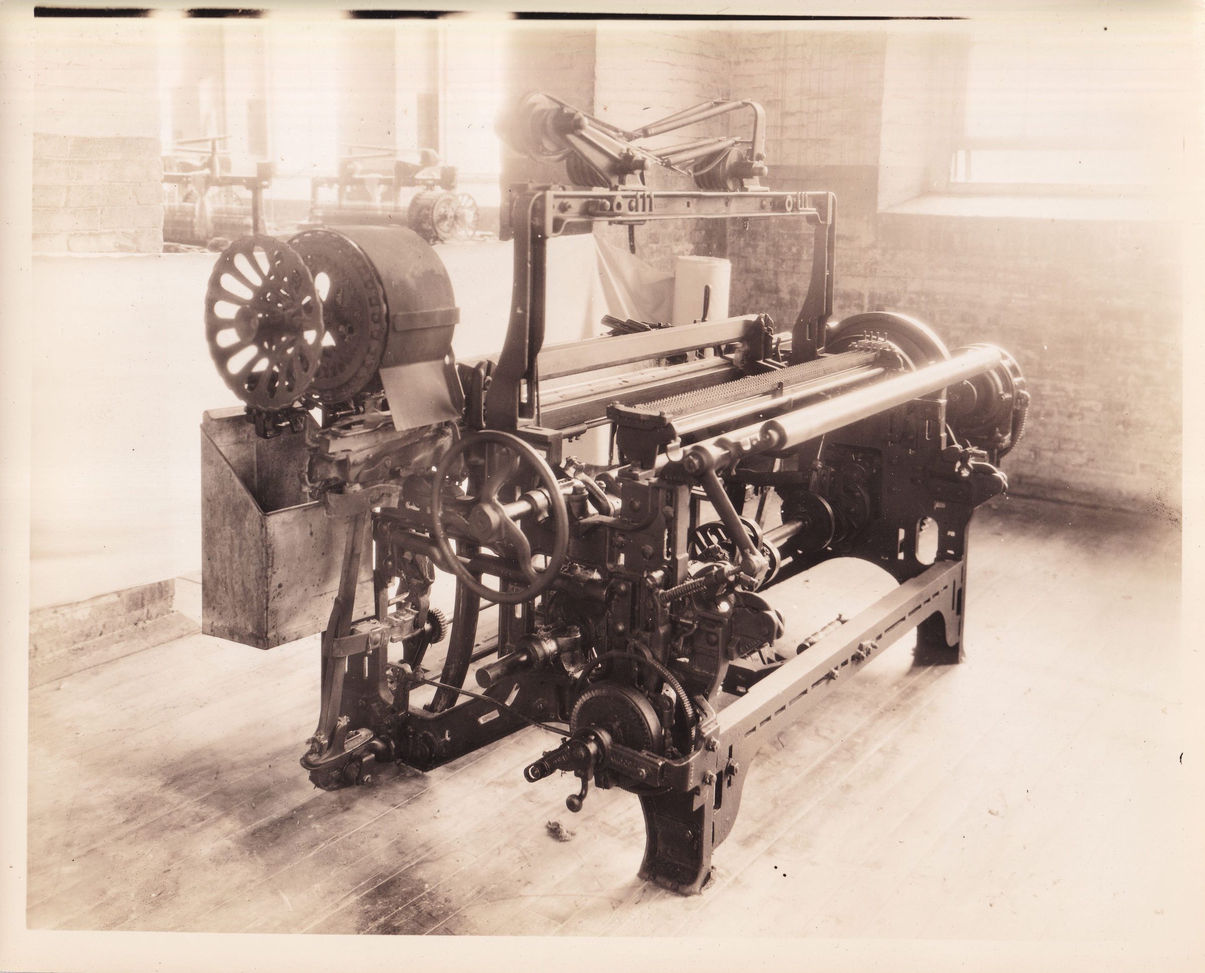 The back of a Draper loom. The cylindrical device to the left held replacement shuttle bobbins. When a bobbin became empty, it was released into the metal container below and a new, full bobbin was inserted into the shuttle automatically, without stopping the loom to allow for continuous operation.