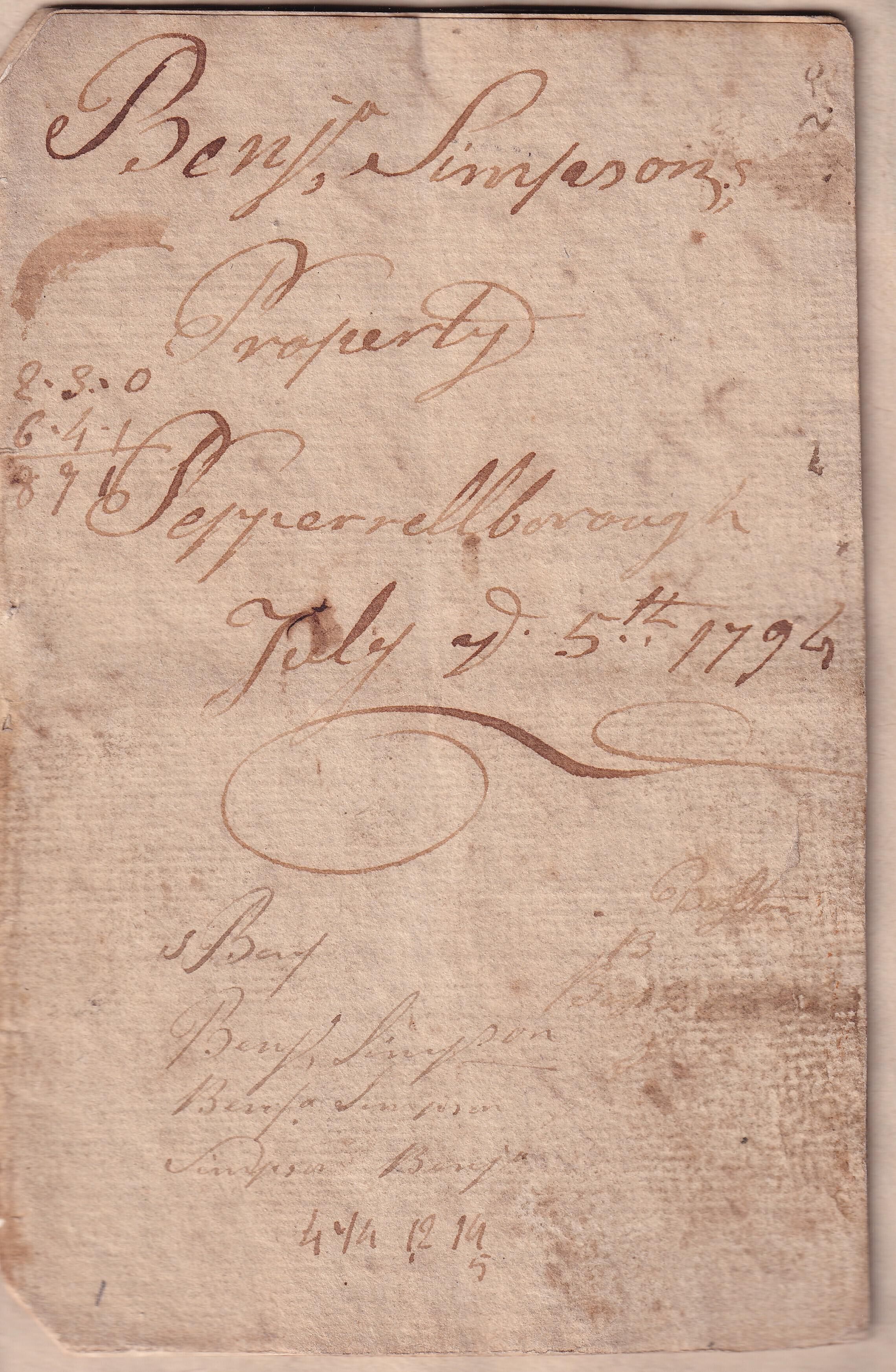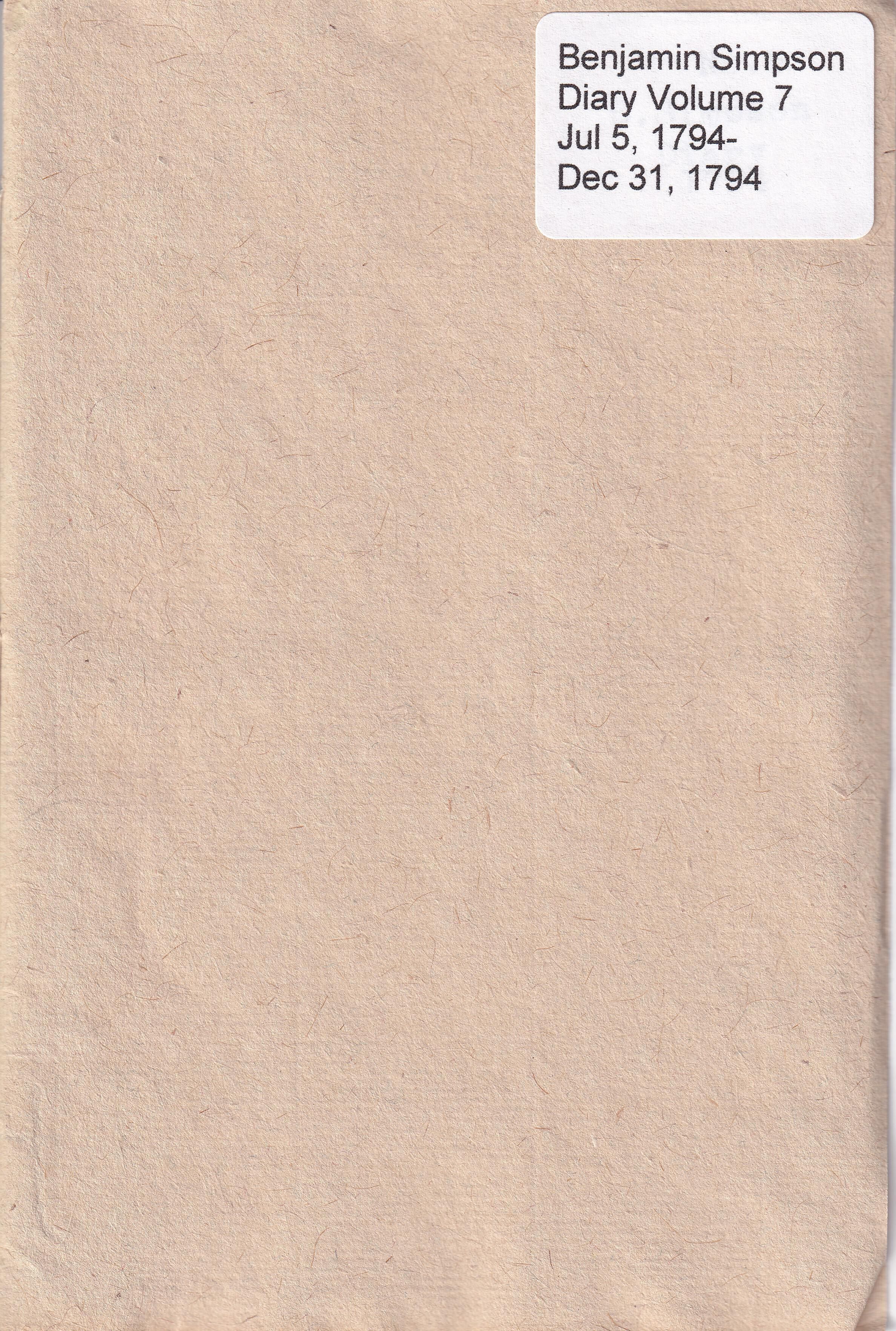 Seventh volume of the diary of Benjamin Simpson of Saco, 1781-1849. This volume covers the period July 5, 1794 through December 31, 1794. It is handwritten in ink on rag paper with a handsewn binding; it is now housed in a modern paper cover. Most of the entries are a single line. The date is listed at the top of each page, with individual entries (without dates) listed below. Simpson noted his major task of the day and the weather. His entries reflect the seasonal nature of the work of a man who owned a farm but also was a skilled mason.