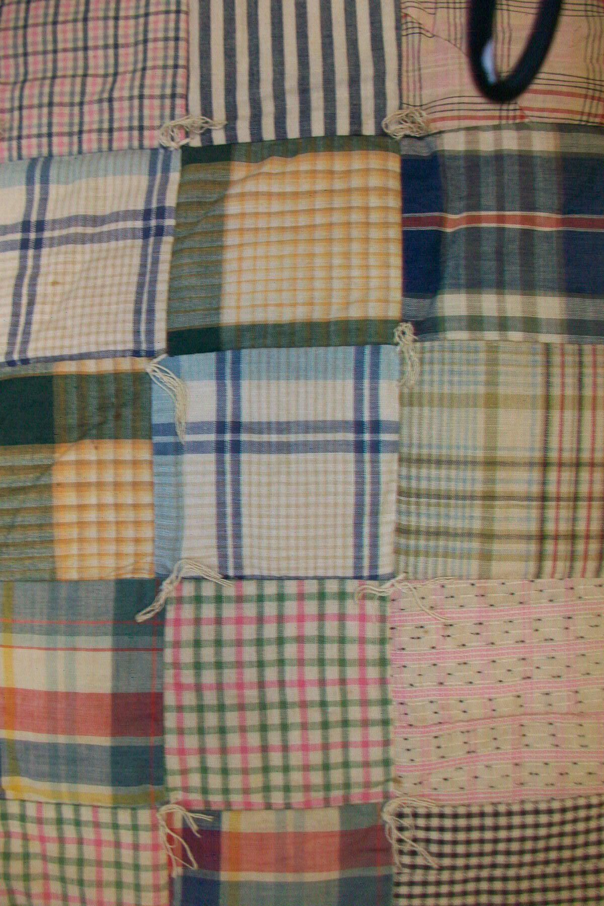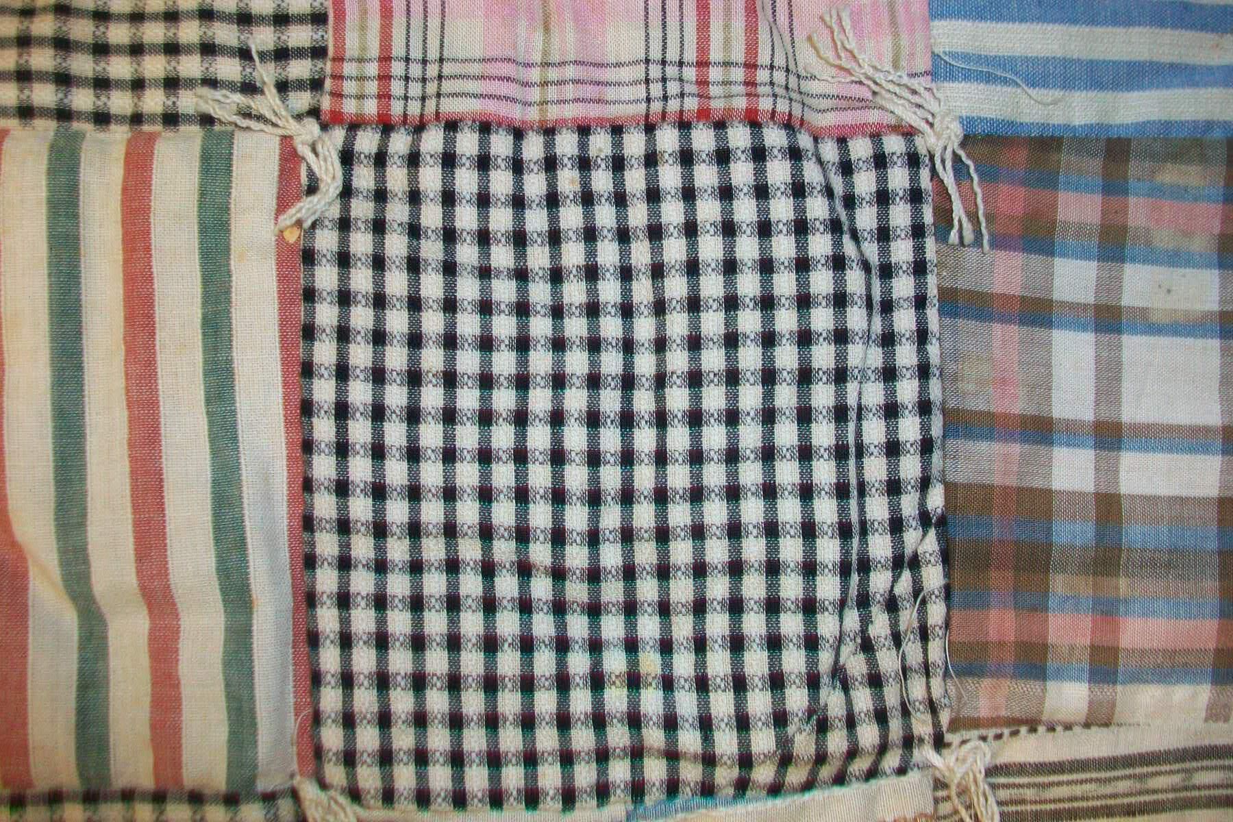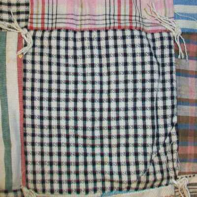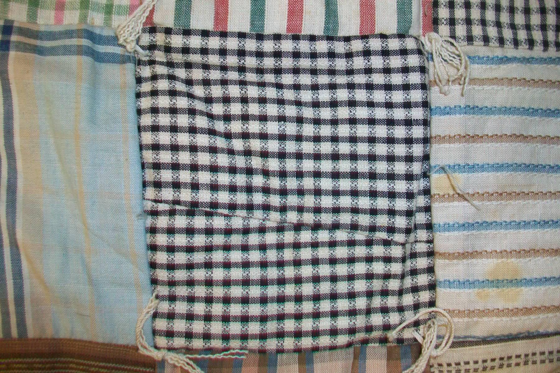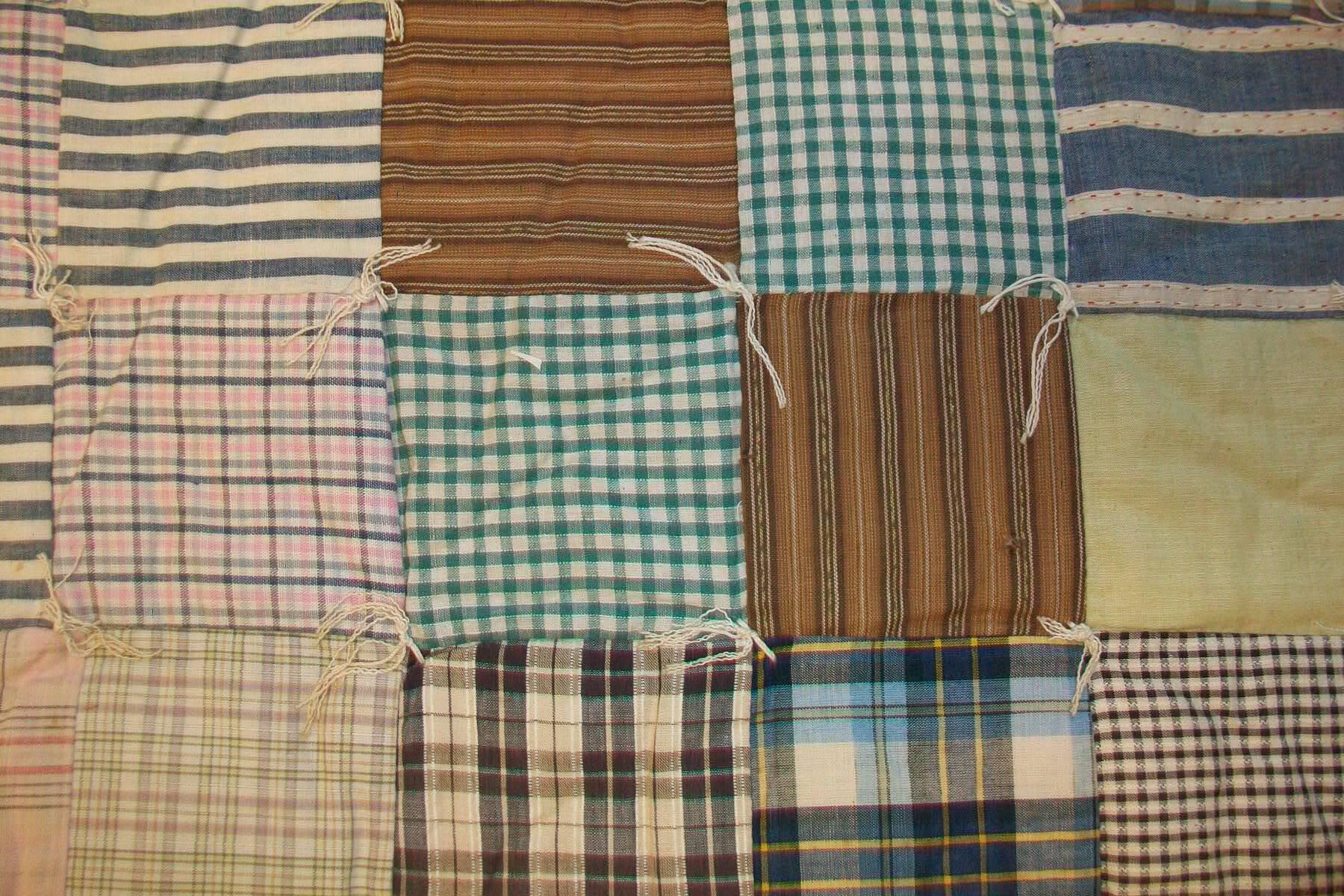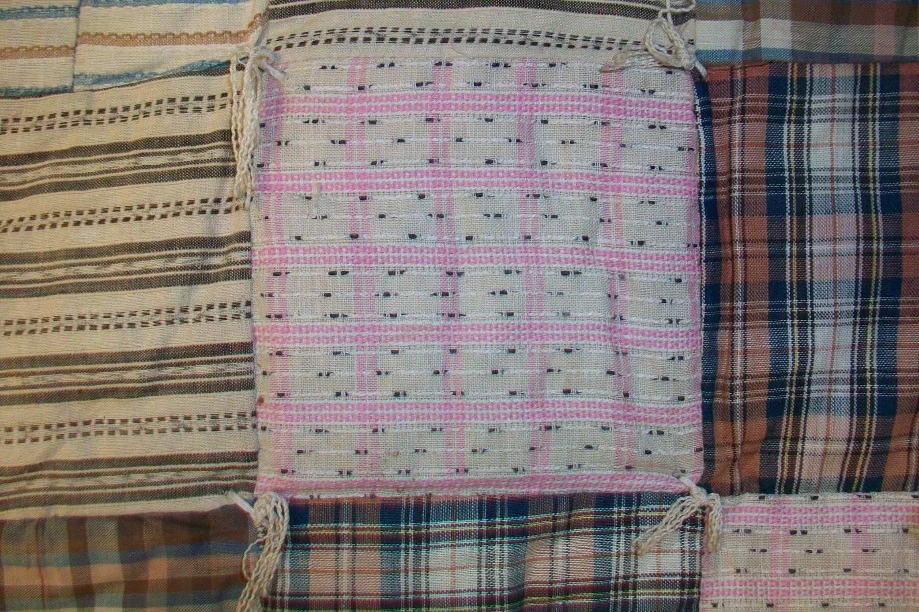 Quilt composed of 3.5" squares of material from the York Manufacturing Company (according to the donor). Some of the squares are pieced. There are many plaids, a variety of colors, many woven patterns, stripes, and checks. There is no quilting; the layers are tied at the corners of the individual pieces with a heavy cotton thread or string. Thick cotton batting. The backing is a windowpane check in dark butterscotch on a cream ground. The outer edges of the quilt top and backing are folded in towards each other and machine sewn 1/8" fron the edge.Dimensions