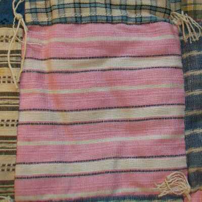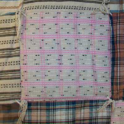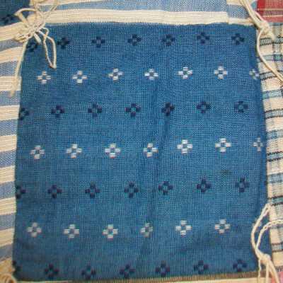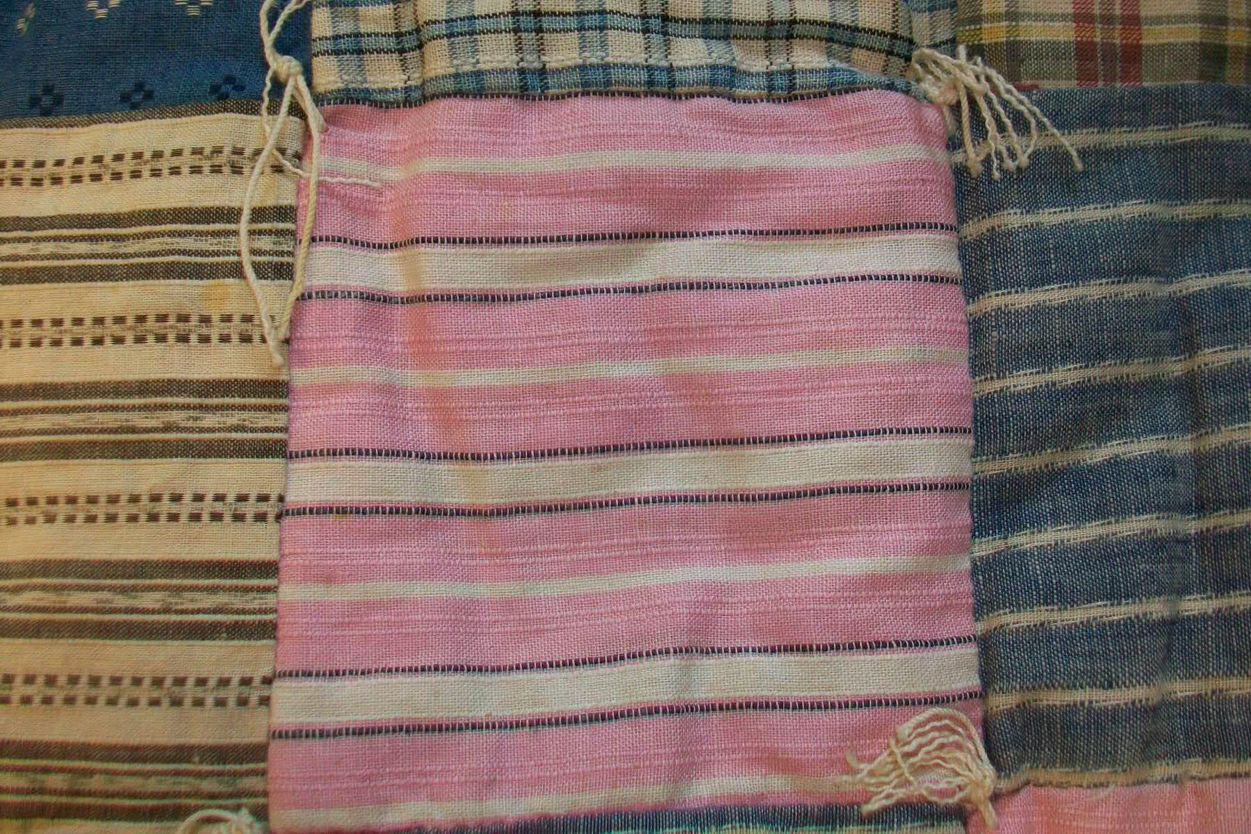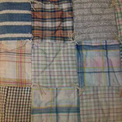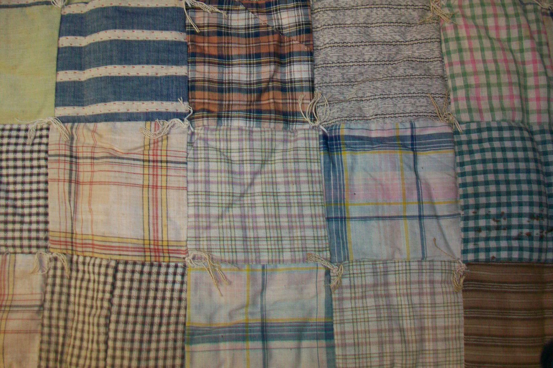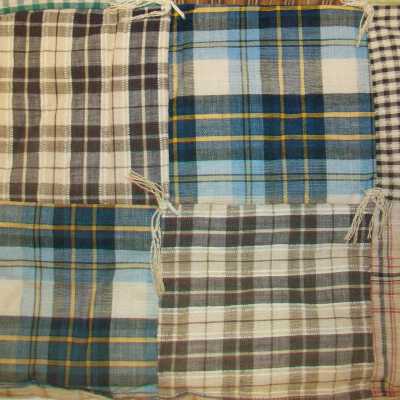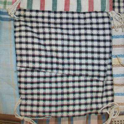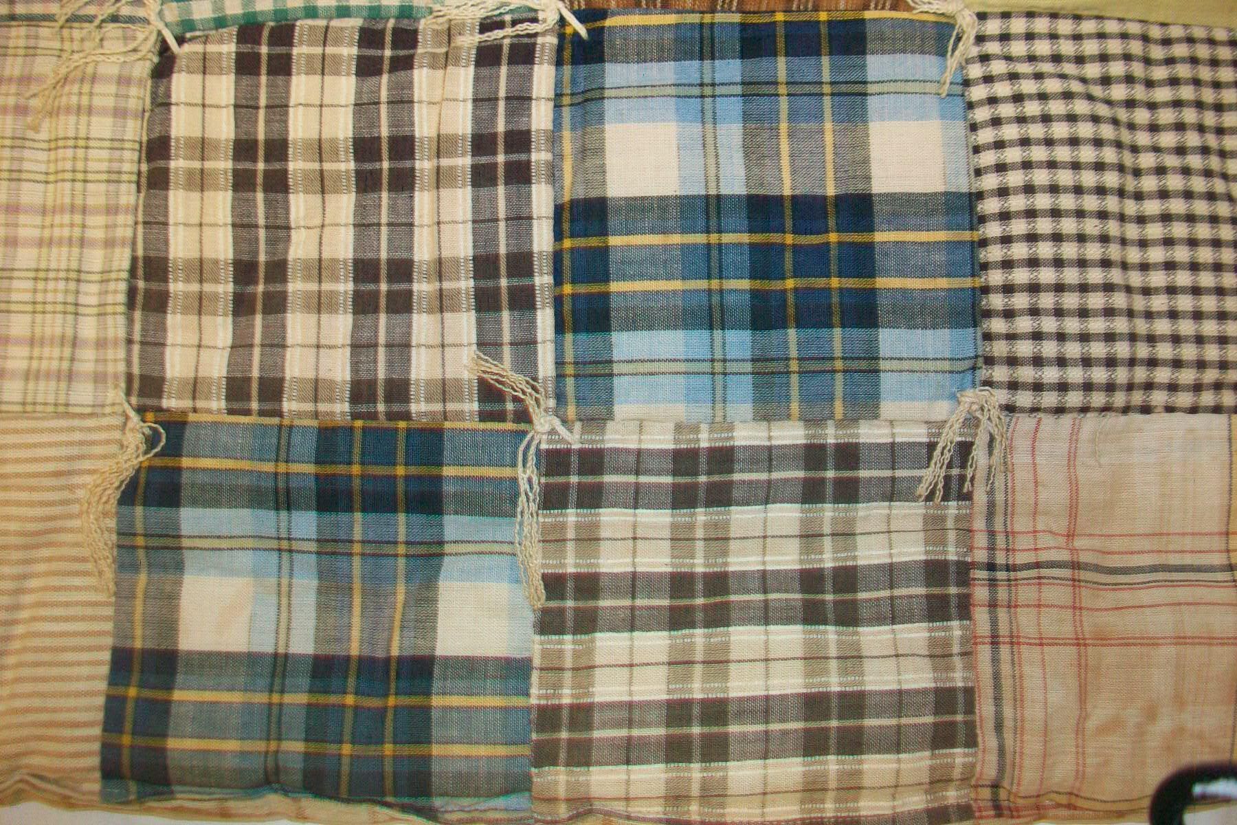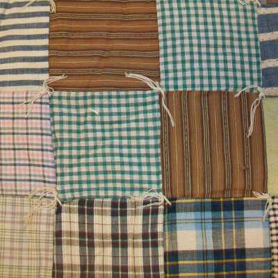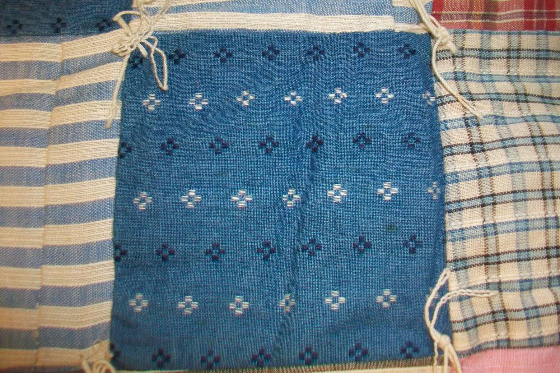 Quilt composed of 3.5" squares of material from the York Manufacturing Company (according to the donor). Some of the squares are pieced. There are many plaids, a variety of colors, many woven patterns, stripes, and checks. There is no quilting; the layers are tied at the corners of the individual pieces with a heavy cotton thread or string. Thick cotton batting. The backing is a windowpane check in dark butterscotch on a cream ground. The outer edges of the quilt top and backing are folded in towards each other and machine sewn 1/8" fron the edge.Dimensions
