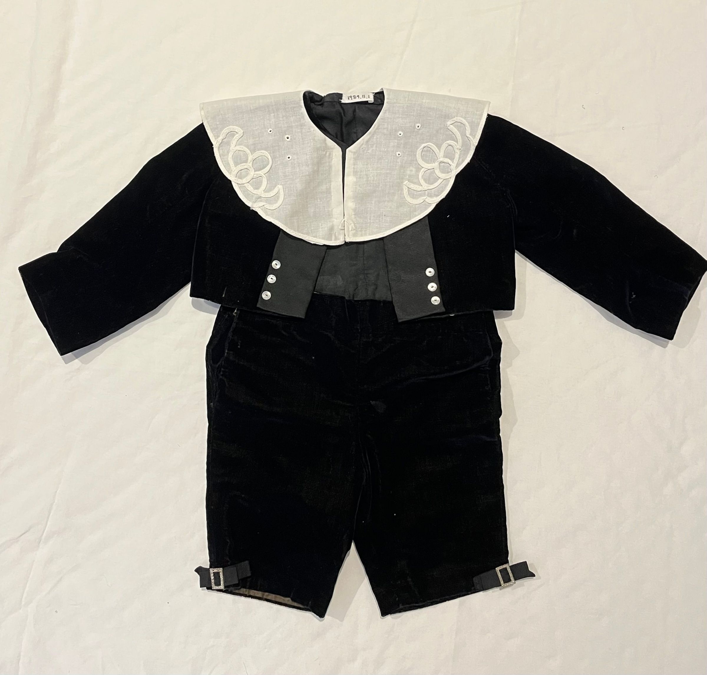 Frances Hodgson Burnett created the character of Little Lord Fauntleroy first in stories in St. Nicholas magazine in 1885 and 1886, and then in book form, published by Scribner's in 1886. Illustrations by Reginald Birch based on Burnett's descriptions made the little boy's fancy suit an immediate fashion essential. The suits were typically sew of velvet, included short pants, and a wide, lacey or ruffled (or both) collar. They were not practical, but represented a highly romanticized view of childhood that fit well into the paradigm of the much smaller families that were becoming common in the late 19th century. The patent leather shoes with jeweled buckles and ribbon ties are believed to have been worn with the suit.