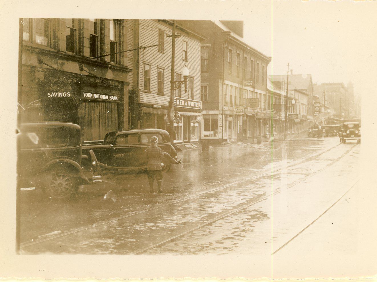 Black and white print photograph of Main Street in Saco, Maine from Saco River flooding. From the Sawyer House Collection.