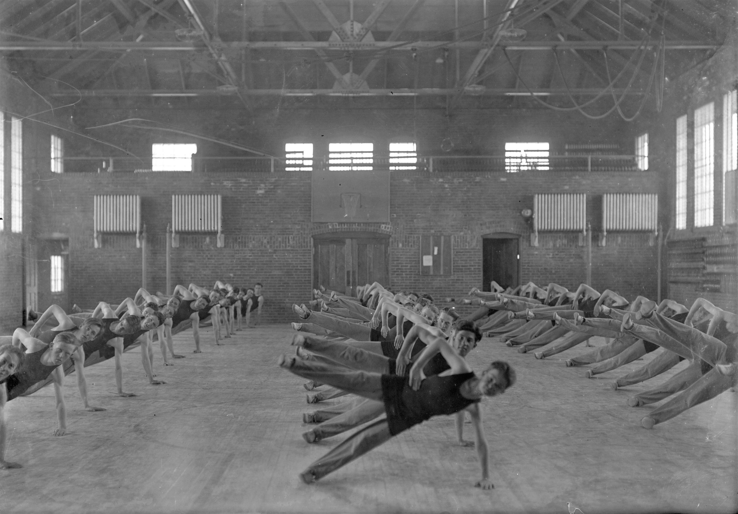 Glass plate negative photo of a group of boys gym class at Thornton Academy. This is in the original George Addison Emery Gymnasium which was built in 1913. Today the building houses the school library.