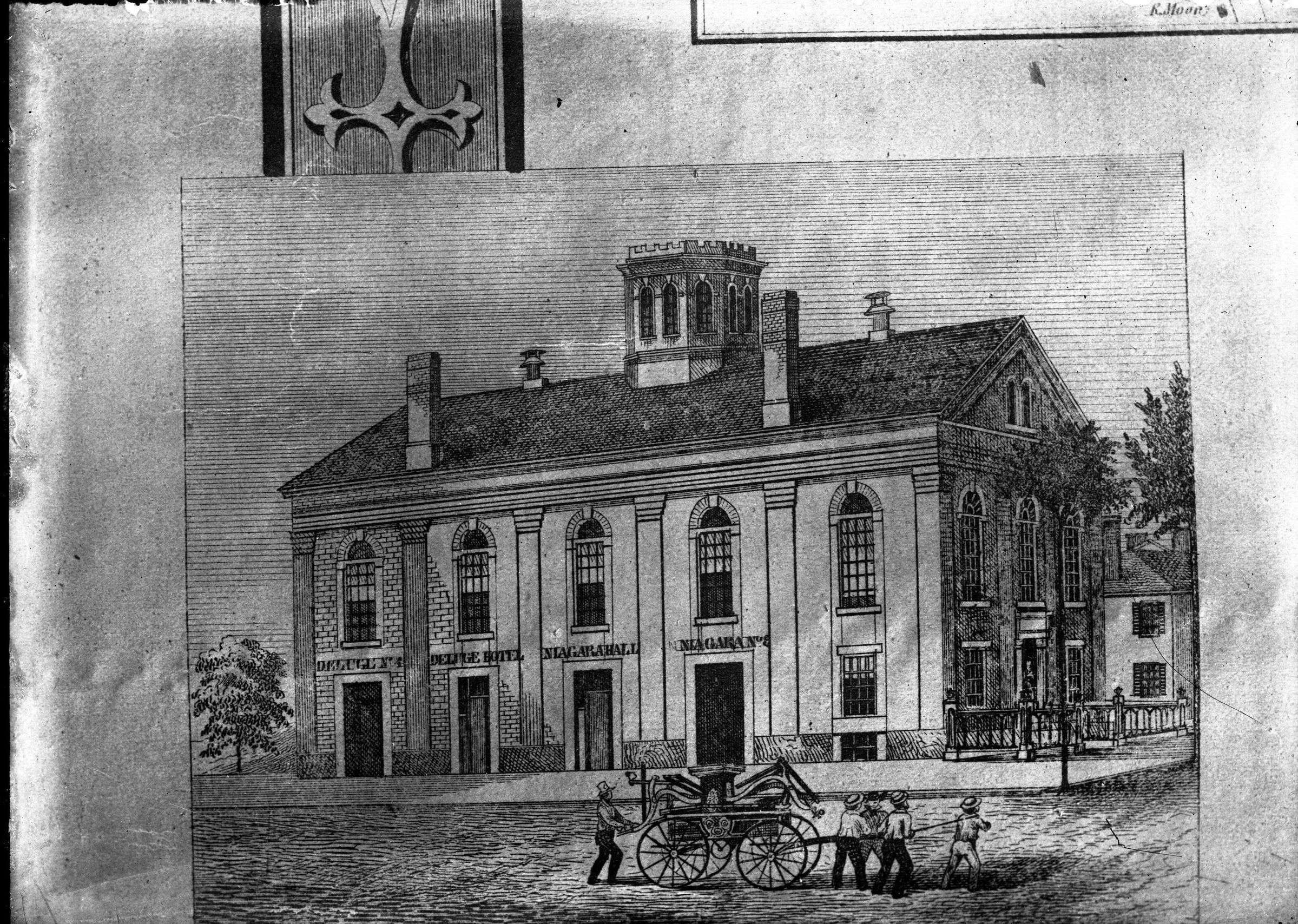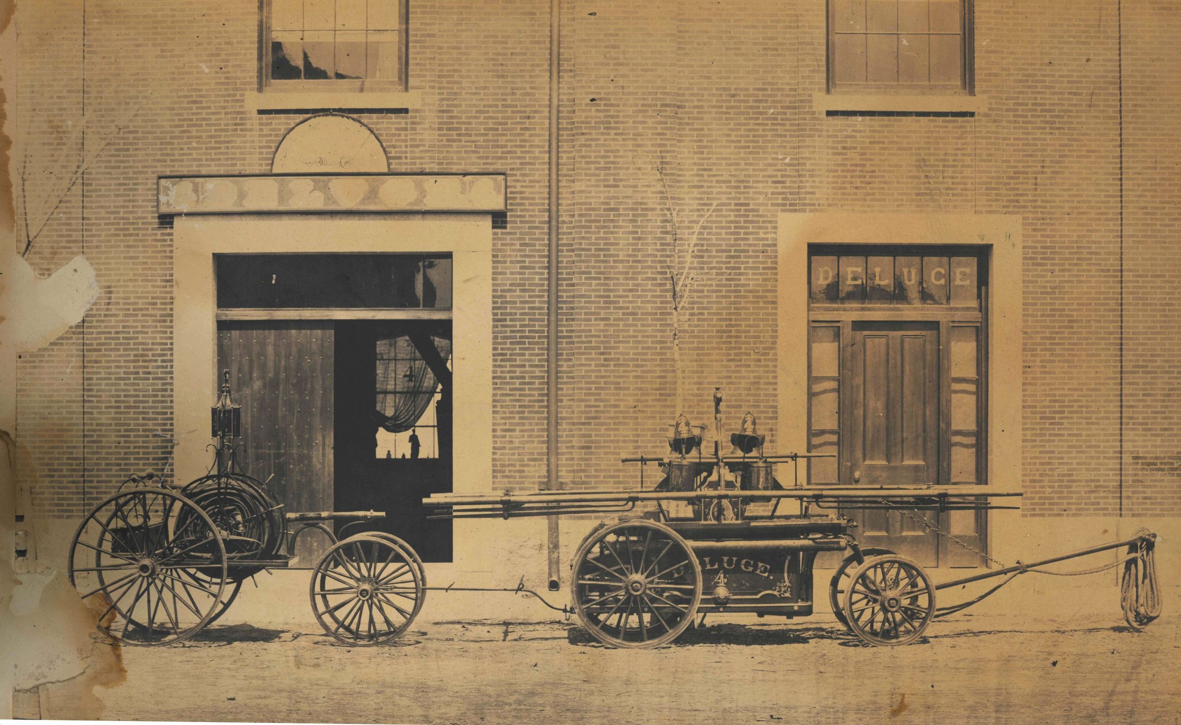 A glass plate negative photograph of a section of the York County Maine 1856 Map by J.L. Smith & Co., highlighting the Town House (City Hall) in Saco. A fire hand-pump fire engine is in front of the building. This is Saco City Hall (1855, designed by Thomas Hill, constructed by Abraham Cutter) before the cupola was removed from the middle of the roof and the clocktower was added in 1880. The side of the building shows the names of the early fire engines that were deployed from this building as well as the quarters for the Saco Fire Department - "Deluge No. 4," "Deluge Hotel," "Niagara Hall," and "Niagara #3."Made/Created