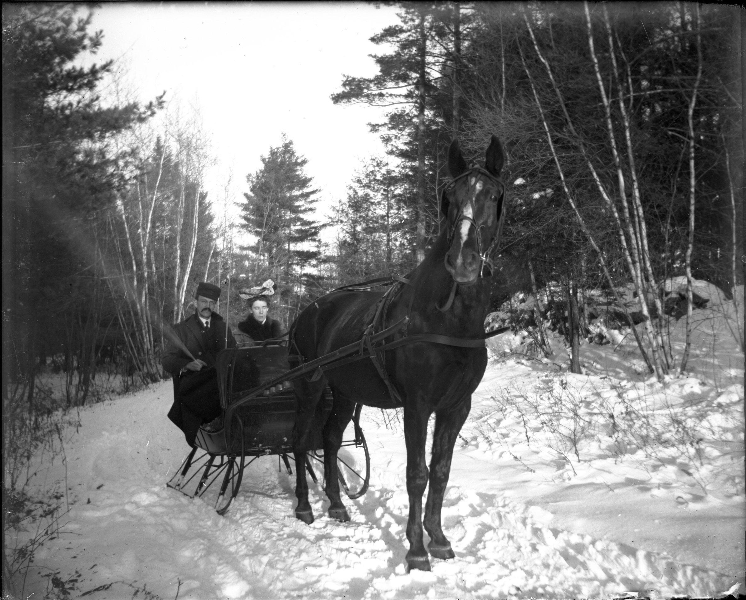 Glass plate negative photo of Cora Ethyl Young Hobbs and Rufus Milton Hobbs on a horse-drawn sleigh, circa 1910.