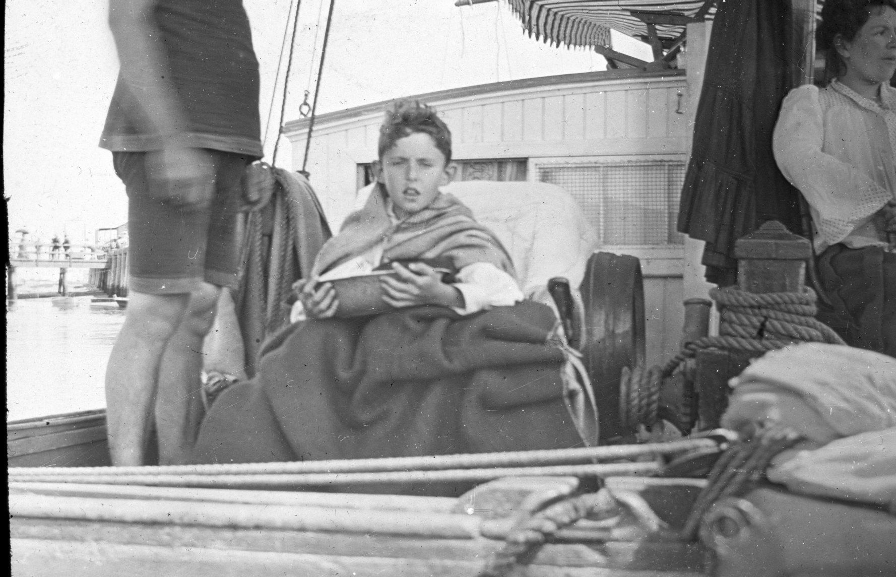 Glass lantern slide photo of a seasick boy on a boat holding a bowl. "On board The Outing. The Sick Boy, Highland Beach" is written on the slide. Highlands Beach is in New Jersey.