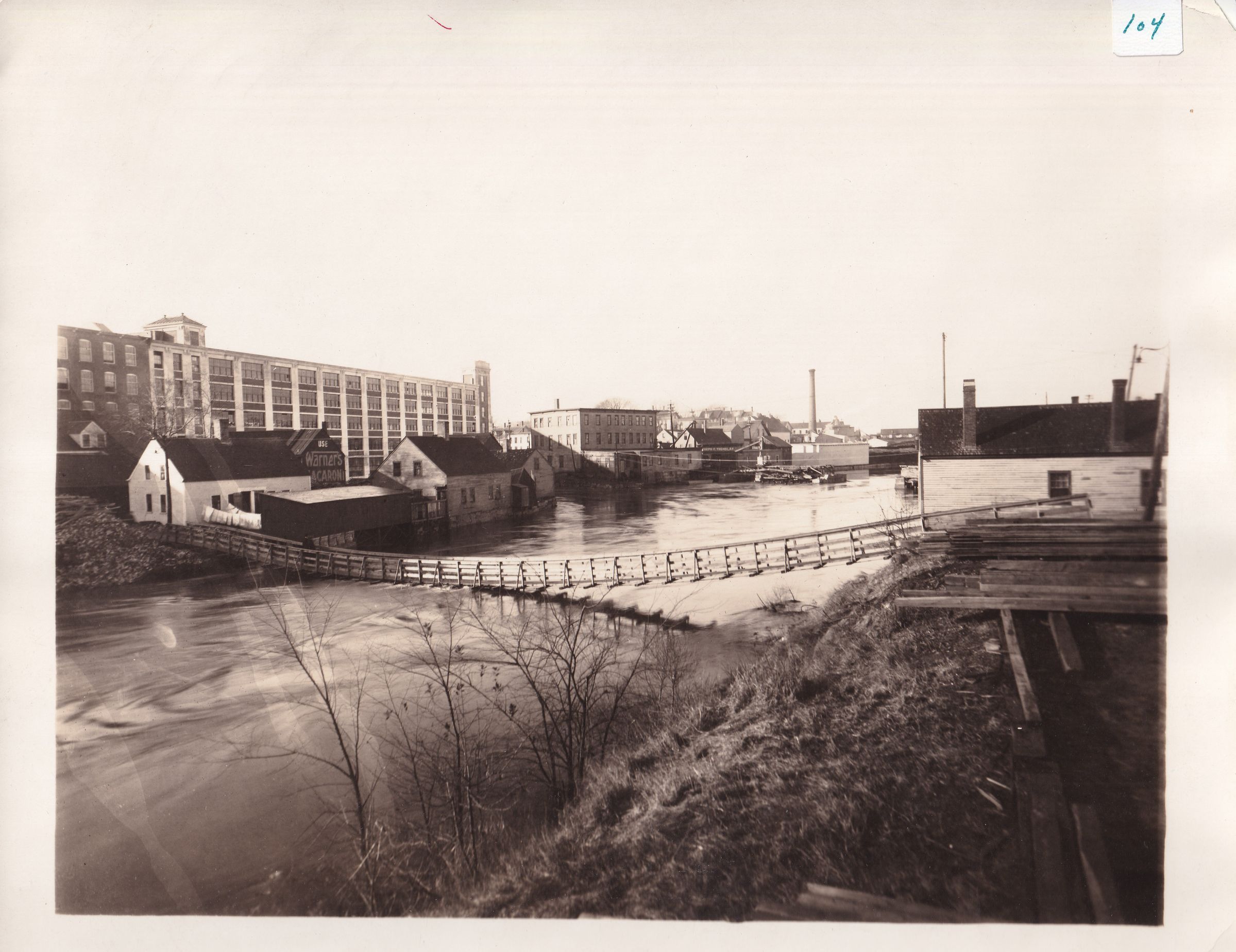 A footbridge over the Saco River. View of the footbridge from the Springs Island side of the river with the New Shop beyond.Made/Created
