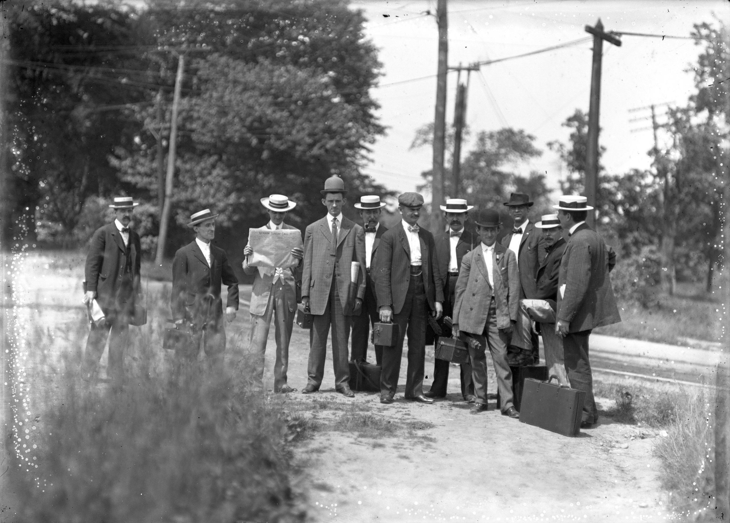 Glass plate negative photo of the Essex Camera Club on an excursion. Charles E. Moody was an active member of the Essex Camera Club during his time in Newark, New Jersey. One of the men is reading the Newark Sunday Call newspaper.Made/Created