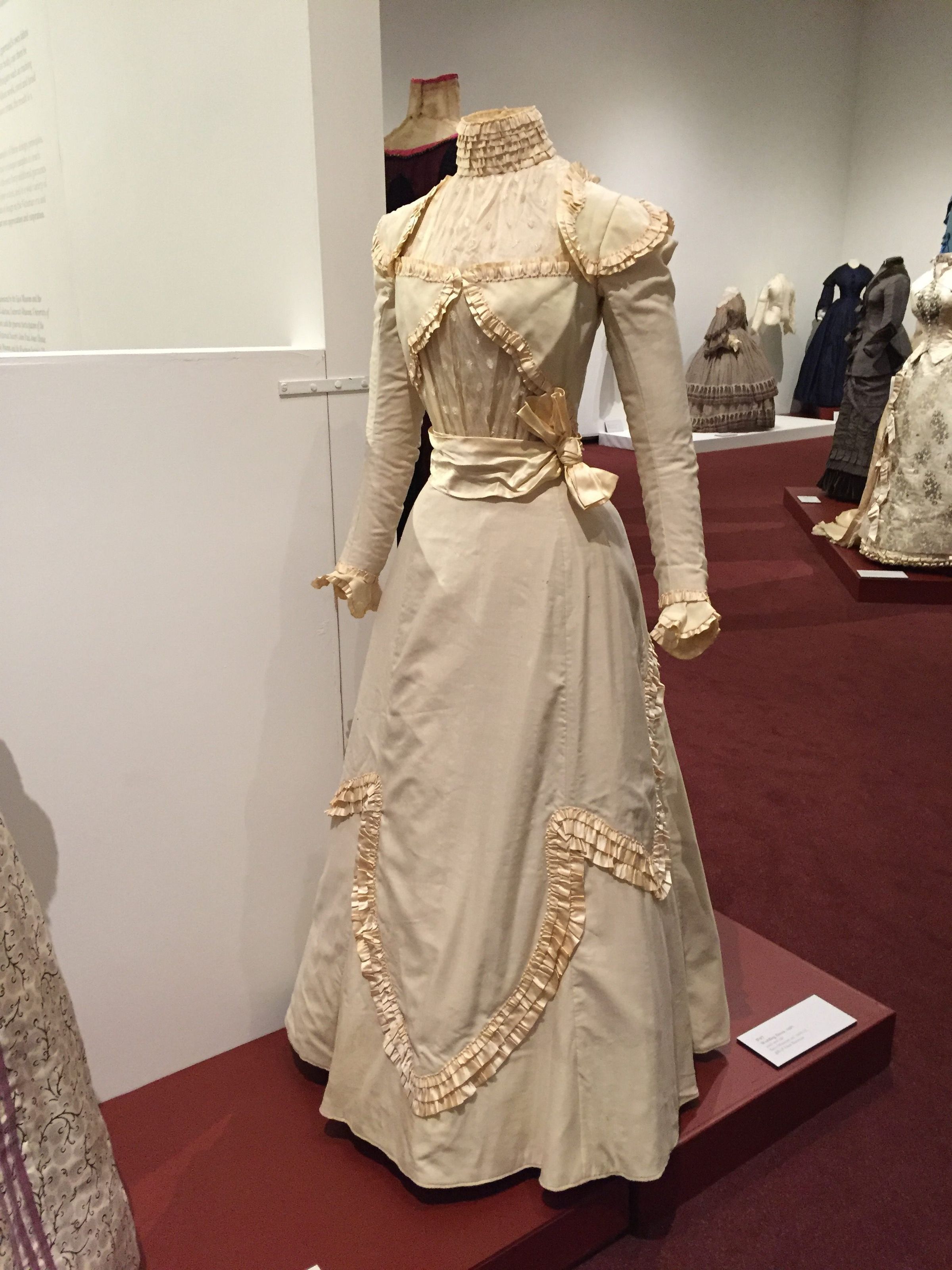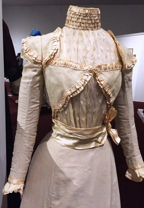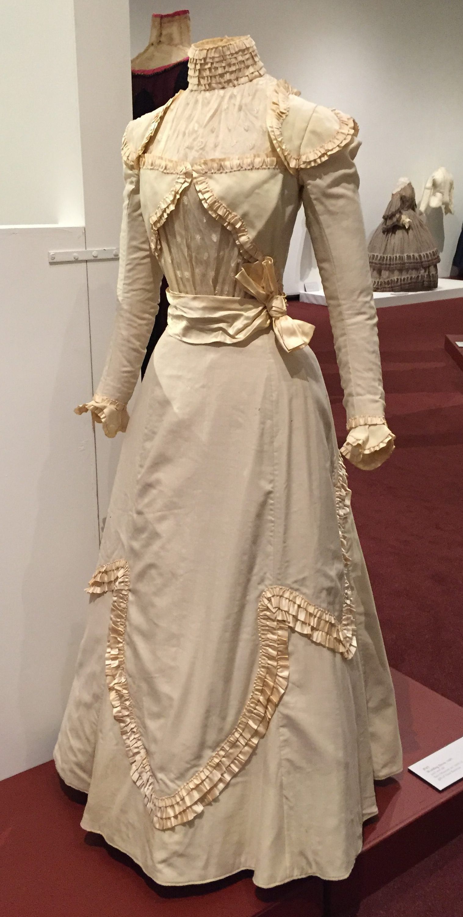 The new Mrs. Oliver F. Boothby was married in this cream wool gown trimmed with extravagant crisscrossing rows of ruched silk satin ribbons. Maud was about twenty and her new husband was a farmer in Saco, but this dress could make any young bride feel like a queen. It is all in shades of cream, yet is also a lovely example of how the interplay of textures can make for an elaborate effect. The flowing matte wool, light-reflecting silk gathered up tightly for surface richness, and delicate figured chiffon create a visual feast.