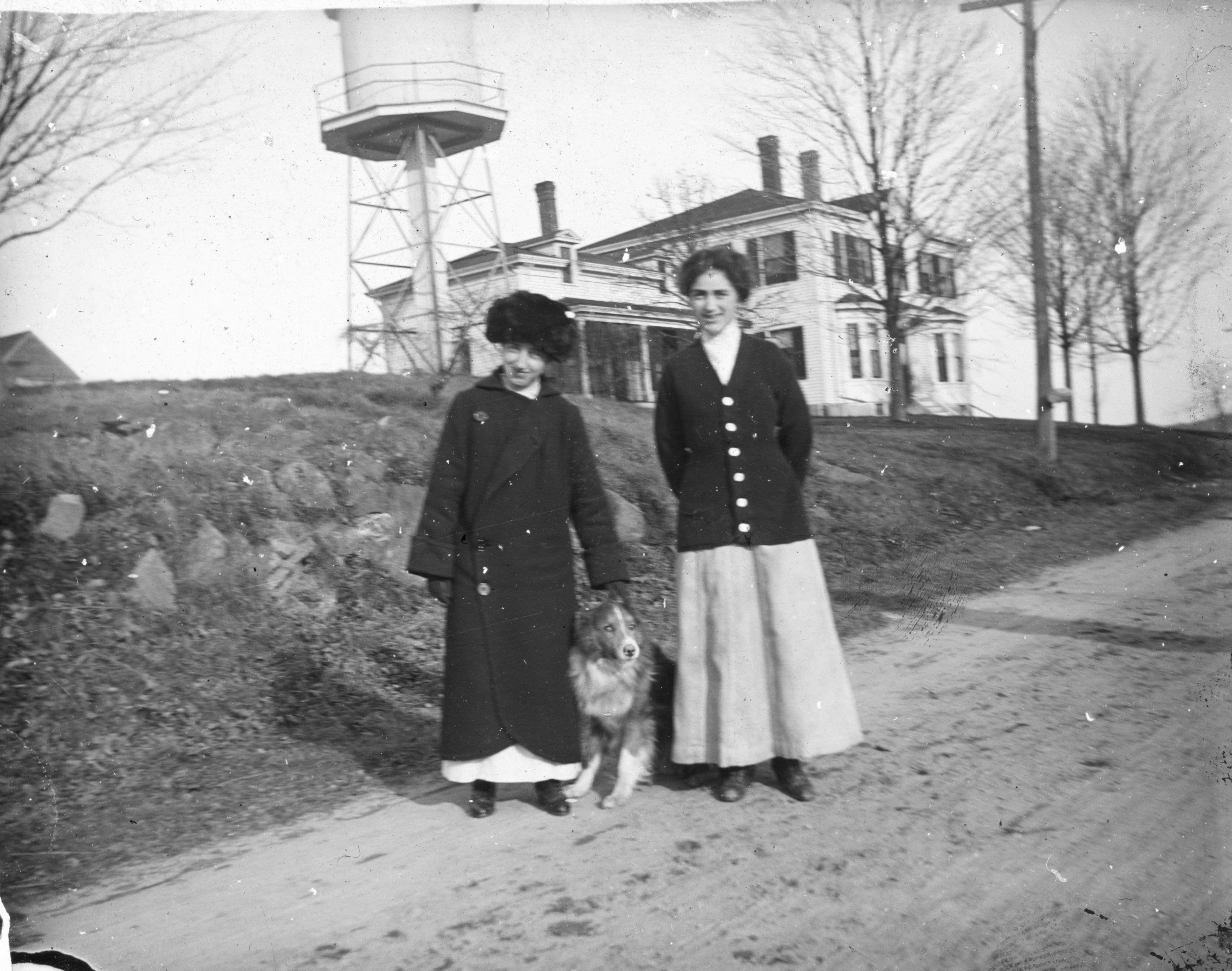 Glass lantern slide photo of Ella Winifred Cole Sawyer, her dog and an unidentified girl standing in front of a house with a water tower.