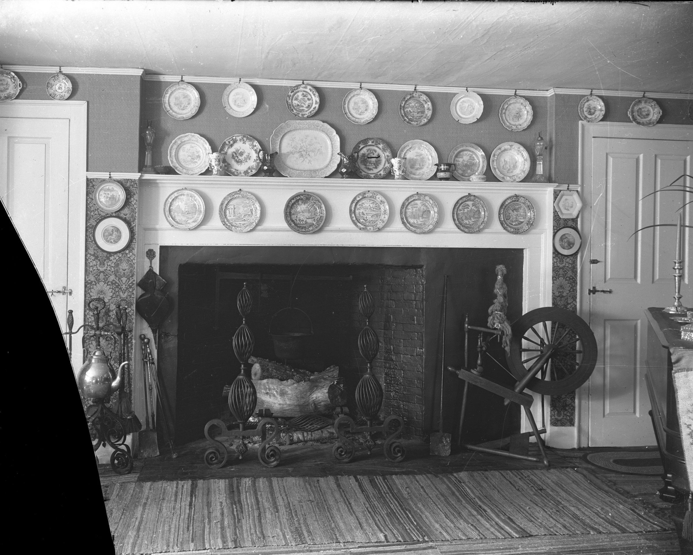 Glass plate negative photo of the interior of the Quillcote house, author Kate Douglas Wiggin's residence in Hollis, Maine. Many of these photos of Quillcote were turned into postcards and are still widely available today and sold by antique ephemera dealers. This plate is broken and a corner piece is missing.Made/Created