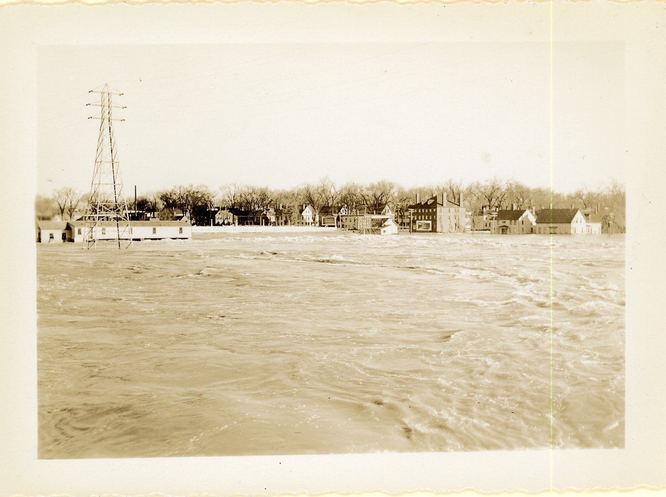 Black and white print photograph of Saco River flooding. From the Sawyer House Collection.