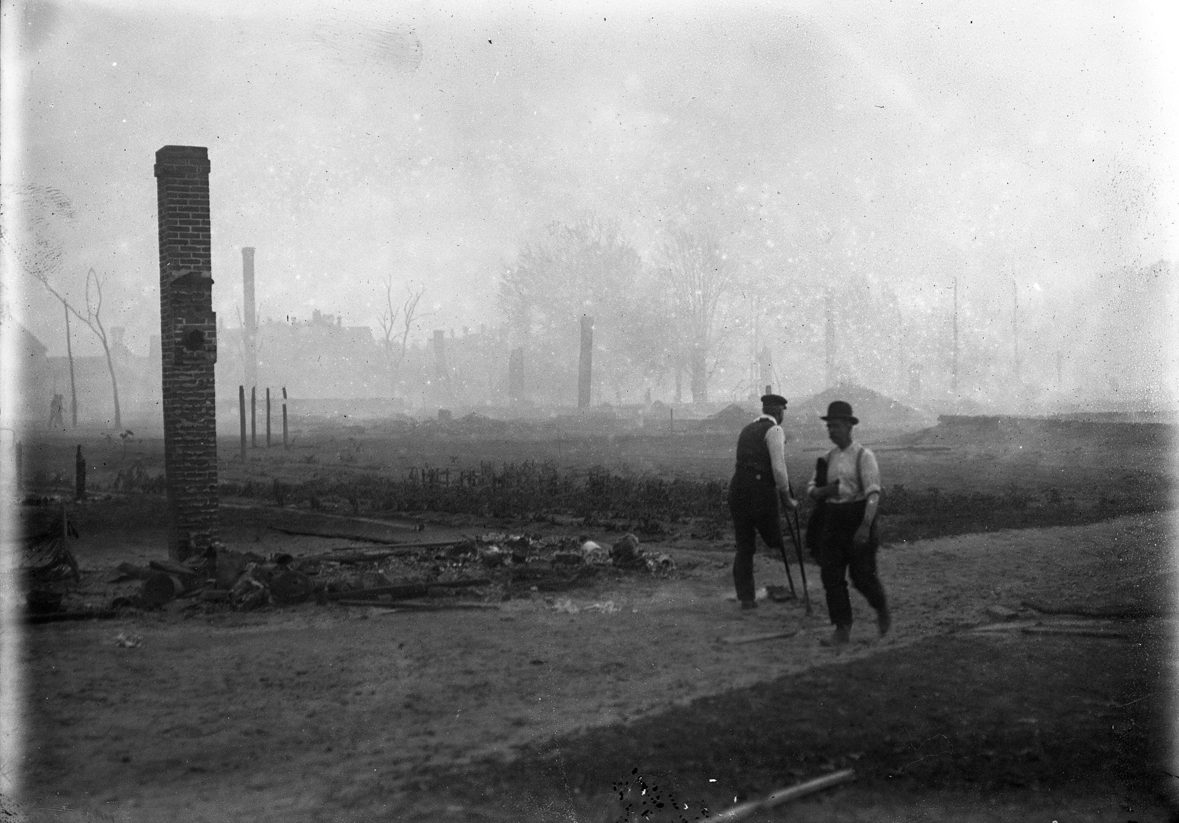 Glass plate negative photo of a two men (one on crutches) standing near the aftermath of the Harmon's Corner (Main and Elm Street) fire in Biddeford. The Harmon's Corner fire in Biddeford occurred on July 8, 1911.